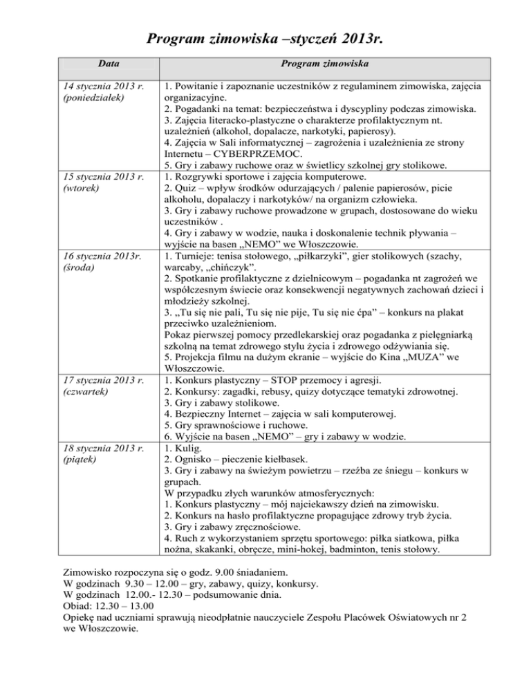 Program zimowiska –styczeń 2013r. Data 14 stycznia 2013 r. (poniedziałek) 15 stycznia 2013 r. (wtorek) 16 stycznia 2013r. (środa) 17 stycznia 2013 r. (czwartek) 18 stycznia 2013 r. (piątek) Program zimowiska 1. Powitanie i zapoznanie uczestników z regulaminem zimowiska, zajęcia organizacyjne. 2. Pogadanki na temat: bezpieczeństwa i dyscypliny podczas zimowiska. 3. Zajęcia literacko-plastyczne o charakterze profilaktycznym nt. uzależnień (alkohol, dopalacze, narkotyki, papierosy). 4. Zajęcia w Sali informatycznej – zagrożenia i uzależnienia ze strony Internetu – CYBERPRZEMOC. 5. Gry i zabawy ruchowe oraz w świetlicy szkolnej gry stolikowe. 1. Rozgrywki sportowe i zajęcia komputerowe. 2. Quiz – wpływ środków odurzających / palenie papierosów, picie alkoholu, dopalaczy i narkotyków/ na organizm człowieka. 3. Gry i zabawy ruchowe prowadzone w grupach, dostosowane do wieku uczestników . 4. Gry i zabawy w wodzie, nauka i doskonalenie technik pływania – wyjście na basen „NEMO” we Włoszczowie. 1. Turnieje: tenisa stołowego, „piłkarzyki”, gier stolikowych (szachy, warcaby, „chińczyk”. 2. Spotkanie profilaktyczne z dzielnicowym – pogadanka nt zagrożeń we współczesnym świecie oraz konsekwencji negatywnych zachowań dzieci i młodzieży szkolnej. 3. „Tu się nie pali, Tu się nie pije, Tu się nie ćpa” – konkurs na plakat przeciwko uzależnieniom. Pokaz pierwszej pomocy przedlekarskiej oraz pogadanka z pielęgniarką szkolną na temat zdrowego stylu życia i zdrowego odżywiania się. 5. Projekcja filmu na dużym ekranie – wyjście do Kina „MUZA” we Włoszczowie. 1. Konkurs plastyczny – STOP przemocy i agresji. 2. Konkursy: zagadki, rebusy, quizy dotyczące tematyki zdrowotnej. 3. Gry i zabawy stolikowe. 4. Bezpieczny Internet – zajęcia w sali komputerowej. 5. Gry sprawnościowe i ruchowe. 6. Wyjście na basen „NEMO” – gry i zabawy w wodzie. 1. Kulig. 2. Ognisko – pieczenie kiełbasek. 3. Gry i zabawy na świeżym powietrzu – rzeźba ze śniegu – konkurs w grupach. W przypadku złych warunków atmosferycznych: 1. Konkurs plastyczny – mój najciekawszy dzień na zimowisku. 2. Konkurs na hasło profilaktyczne propagujące zdrowy tryb życia. 3. Gry i zabawy zręcznościowe. 4. Ruch z wykorzystaniem sprzętu sportowego: piłka siatkowa, piłka nożna, skakanki, obręcze, mini-hokej, badminton, tenis stołowy. Zimowisko rozpoczyna się o godz. 9.00 śniadaniem. W godzinach 9.30 – 12.00 – gry, zabawy, quizy, konkursy. W godzinach 12.00.- 12.30 – podsumowanie dnia. Obiad: 12.30 – 13.00 Opiekę nad uczniami sprawują nieodpłatnie nauczyciele Zespołu Placówek Oświatowych nr 2 we Włoszczowie.