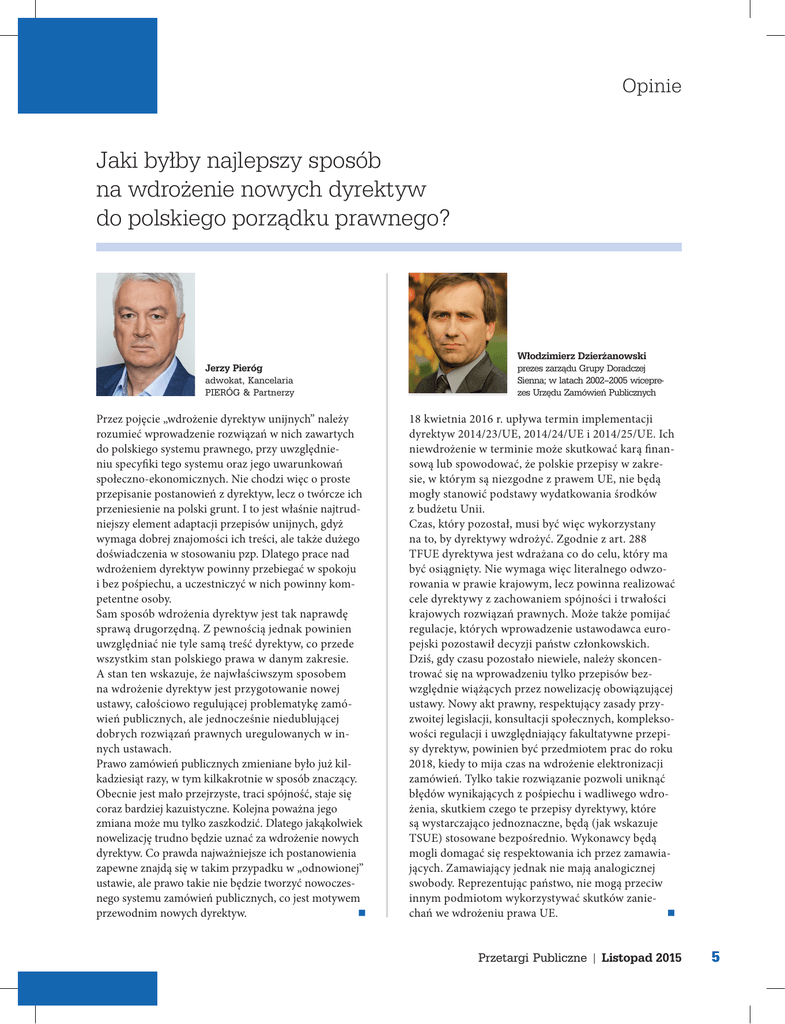 Opinie Jaki byłby najlepszy sposób na wdrożenie nowych dyrektyw do polskiego porządku prawnego? Jerzy Pieróg adwokat, Kancelaria PIERÓG & Partnerzy Przez pojęcie „wdrożenie dyrektyw unijnych” należy rozumieć wprowadzenie rozwiązań w nich zawartych do polskiego systemu prawnego, przy uwzględnieniu specyfiki tego systemu oraz jego uwarunkowań społeczno-ekonomicznych. Nie chodzi więc o proste przepisanie postanowień z dyrektyw, lecz o twórcze ich przeniesienie na polski grunt. I to jest właśnie najtrudniejszy element adaptacji przepisów unijnych, gdyż wymaga dobrej znajomości ich treści, ale także dużego doświadczenia w stosowaniu pzp. Dlatego prace nad wdrożeniem dyrektyw powinny przebiegać w spokoju i bez pośpiechu, a uczestniczyć w nich powinny kompetentne osoby. Sam sposób wdrożenia dyrektyw jest tak naprawdę sprawą drugorzędną. Z pewnością jednak powinien uwzględniać nie tyle samą treść dyrektyw, co przede wszystkim stan polskiego prawa w danym zakresie. A stan ten wskazuje, że najwłaściwszym sposobem na wdrożenie dyrektyw jest przygotowanie nowej ustawy, całościowo regulującej problematykę zamówień publicznych, ale jednocześnie niedublującej dobrych rozwiązań prawnych uregulowanych w innych ustawach. Prawo zamówień publicznych zmieniane było już kilkadziesiąt razy, w tym kilkakrotnie w sposób znaczący. Obecnie jest mało przejrzyste, traci spójność, staje się coraz bardziej kazuistyczne. Kolejna poważna jego zmiana może mu tylko zaszkodzić. Dlatego jakąkolwiek nowelizację trudno będzie uznać za wdrożenie nowych dyrektyw. Co prawda najważniejsze ich postanowienia zapewne znajdą się w takim przypadku w „odnowionej” ustawie, ale prawo takie nie będzie tworzyć nowoczes nego systemu zamówień publicznych, co jest motywem przewodnim nowych dyrektyw. n Włodzimierz Dzierżanowski prezes zarządu Grupy Doradczej Sienna; w latach 2002–2005 wiceprezes Urzędu Zamówień Publicznych 18 kwietnia 2016 r. upływa termin implementacji dyrektyw 2014/23/UE, 2014/24/UE i 2014/25/UE. Ich niewdrożenie w terminie może skutkować karą finansową lub spowodować, że polskie przepisy w zakresie, w którym są niezgodne z prawem UE, nie będą mogły stanowić podstawy wydatkowania środków z budżetu Unii. Czas, który pozostał, musi być więc wykorzystany na to, by dyrektywy wdrożyć. Zgodnie z art. 288 TFUE dyrektywa jest wdrażana co do celu, który ma być osiągnięty. Nie wymaga więc literalnego odwzorowania w prawie krajowym, lecz powinna realizować cele dyrektywy z zachowaniem spójności i trwałości krajowych rozwiązań prawnych. Może także pomijać regulacje, których wprowadzenie ustawodawca europejski pozostawił decyzji państw członkowskich. Dziś, gdy czasu pozostało niewiele, należy skoncentrować się na wprowadzeniu tylko przepisów bezwzględnie wiążących przez nowelizację obowiązującej ustawy. Nowy akt prawny, respektujący zasady przyzwoitej legislacji, konsultacji społecznych, kompleksowości regulacji i uwzględniający fakultatywne przepisy dyrektyw, powinien być przedmiotem prac do roku 2018, kiedy to mija czas na wdrożenie elektronizacji zamówień. Tylko takie rozwiązanie pozwoli uniknąć błędów wynikających z pośpiechu i wadliwego wdrożenia, skutkiem czego te przepisy dyrektywy, które są wystarczająco jednoznaczne, będą (jak wskazuje TSUE) stosowane bezpośrednio. Wykonawcy będą mogli domagać się respektowania ich przez zamawiających. Zamawiający jednak nie mają analogicznej swobody. Reprezentując państwo, nie mogą przeciw innym podmiotom wykorzystywać skutków zaniechań we wdrożeniu prawa UE. n Przetargi Publiczne | Listopad 2015 5