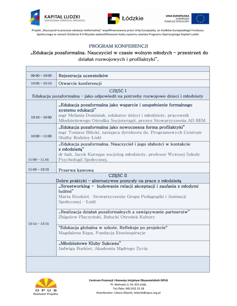 Projekt „Nauczyciel w procesie edukacji nieformalnej” współfinansowany przez Unię Europejską ze środków Europejskiego Funduszu Społecznego w ramach Działania 9.4 Wysoko wykwalifikowane kadry systemu oświaty Programu Operacyjnego Kapitał Ludzki PROGRAM KONFERENCJI „Edukacja pozaformalna. Nauczyciel w czasie wolnym młodych – przestrzeń do profilaktyki” działań rozwojowych i profilaktyki ”, 09:30 – 10:00 Rejestracja uczestników 10:00 – 10:10 Otwarcie konferencji CZĘŚĆ I Edukacja pozaformalna – jako odpowiedź na potrzeby rozwojowe dzieci i młodzieży „Edukacja pozaformalna jako wsparcie i uzupełnienie formalnego systemu edukacji” mgr Melania Dominiak, edukator dzieci i młodzieży, pracownik Młodzieżowego Ośrodka Socjoterapii, prezes Stowarzyszenia AD REM 10:10 10:10 – 10:30 „Edukacja pozaformalna pozaformalna jako nowoczesna forma profilaktyki” mgr Tomasz Bilicki, zastępca dyrektora ds. Programowych Centrum Służby Rodziny Łódź 10:30 – 11:00 11:00 – 11.45 „Edukacja pozaformalna. Nauczyciel i jego słabości w kontakcie z młodzieżą” dr hab. Jacek Kurzępa socjolog młodzieży, profesor Wyższej Szkoły Psychologii Społecznej. 11:45 – 12:15 Przerwa kawowa CZĘŚĆ II Dobre praktyki – alternatywne pomysły na prace z młodzieżą „Streetworking - budowanie relacji akceptacji i zaufania z młodymi ludźmi” Marta Kiszkiel, Stowarzyszenie Grupa Pedagogiki i Animacji Społecznej – Łódź „Realizacja działań pozaformalnych a zawiązywanie partnerstw” Zbigniew Placzyński, Bałucki Ośrodek Kultury 12:15 – 13:15 "Edukacja globalna w szkole. Refleksje po projekcie" Magdalena Kępa, Fundacja Etnoinspiracje „Młodzieżowe Kluby Sukcesu” Jadwiga Borkiet, Akademia Mądrego Życia Realizator Projektu Centrum Promocji i Rozwoju Inicjatyw Obywatelskich OPUS Pl. Wolności 2, 91-415 Łódź, Tel./faks: 042 632 22 18 Koordynator: Liliana Olejnik, [email protected] Projekt „Nauczyciel w procesie edukacji nieformalnej” współfinansowany przez Unię Europejską ze środków Europejskiego Funduszu Społecznego w ramach Działania 9.4 Wysoko wykwalifikowane kadry systemu oświaty Programu Operacyjnego Kapitał Ludzki CZĘŚĆ III Warsztaty pokazowe w grupach (jeden do wyboru) 13.30 – 15:00 „Czy warto marzyć?” Sylwia Bartosik „Tchnąć duszę - jak aktywizować nieaktywnych?” Melania Dominiak „Młodzieżowe Kluby Sukcesu” Sukcesu” Jadwiga Borkiet „Buty dobrze dopasowane, czyli rzecz o kształtowaniu ścieżki zawodowej” Emilia Knop ogólne zapoznanie z metodą dramy uświadomienie miejsca jakie zajmują marzenia i dążenie do ich realizacji w naszym życiu nazwanie swoich pragnień, marzeń rozwój wyobraźni i twórczego myślenia poznanie skutecznych metod motywowania do działań w obszarze edukacji pozaformalnej wzbogacenie warsztatu pracy lidera młodzieżowego o nowe umiejętności w zakresie motywowania dzieci i młodzieży Przedstawienie nowej formuły pracy, która umożliwia systematyczny rozwój: umiejętności komunikacyjnych, organizacyjnych i przywódczych kreatywności, odpowiedzialności i współpracy, poczucia własnej wartości, w oparciu o doskonalenie indywidualnych predyspozycji i realizację wyznaczonych celów Ten sposób działania może być także wykorzystany do prowadzenia zajęć tematycznych. odkrywanie w uczniu jego mocnych stron poprzez angażowanie go w różne przedsięwzięcia, kształtując w nim w ten sposób jego postawę życiową ułatwiającą mu wybór właściwego środowiska pracy, techniki i ćwiczenia pomagające zwiększyć świadomość mocnych i słabych stron uczniów w chwili określania przez nich swojej ścieżki zawodowej. 15:00 – 15:20 Podsumowanie warsztatów – dyskusja. 15:20 – 15.30 Zamknięcie konferencji Realizator Projektu Centrum Promocji i Rozwoju Inicjatyw Obywatelskich OPUS Pl. Wolności 2, 91-415 Łódź, Tel./faks: 042 632 22 18 Koordynator: Liliana Olejnik, [email protected]