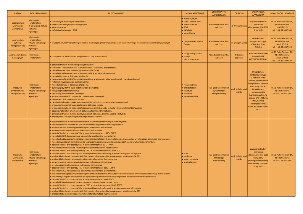 NAZWA ZASTOSOWANIE DZIEDZINA NAUKI SŁOWA KLUCZOWE CERTYFIKATY / AKREDYTACJE OPIEKUN UNIKATOWA APARATURA LOKALIZACJA I KONTAKT Laboratorium Mikroskopii Elektronowej ● inżynieria materiałowa ● fizyka ciała stałego ● chemia ● geologia ● transmisyjna mikroskopia elektronowa ● mikrostruktura w jasnym i ciemnym polu ● identyfikacja faz ● dyfrakcja elektronowa - TEM ● mikrostruktura ● jasne i ciemne pole ● mikrostruktura ● TEM ● dyfrakcja ● identyfikacja Posiada certyfikat PCA: AB 1332 dr Krystian Prusik Wysokorozdzielczy mikroskop elektronowy JEM-3010 firmy JEOL ul. 75 Pułku Piechoty 1A, 41-500 Chorzów, pokój F/-1/9 tel. (+48) 32 3497-509 Laboratorium Dyfrakcji Rentgenowskiej ● inżynieria materiałowa ● fizyka ciała stałego ● chemia ● geologia ● w Laboratorium Dyfrakcji Rentgenowskiej możliwe jest przeprowadzenie analizy składu fazowego materiałów nano i mikrokrystalicznych ● rentgenowska analiza fazowa Posiada certyfikat PCA: AB 1332 dr Grzegorz Dercz Dyfraktometr rentgenowski typu X`Pert-Pro firmy PHILIPS ul. 75 Pułku Piechoty 1A, 41-500 Chorzów, pokój F/2/15 tel. (+48) 32 3497-520 ● przyspieszone badania laboratoryjne w sztucznych atmosferach ● obojętna mgła solna ● korozja elektrochemiczna Posiada certyfikat PCA: AB 1333 dr Bożena Łosiewicz Komora solna HK 400 firmy KÖHLER AUTOMOBILTECHNIK ul. 75 Pułku Piechoty 1A, 41-500 Chorzów, pokój E/2/20 tel. (+48) 32 3497-527 ● inżynieria materiałowa ● fizyka ciała stałego ● chemia ● geologia ● badanie struktury materiałów polikrystalicznych ● jakościowa i ilościowa analiza fazowa Ilościowa i jakościowa analiza fazowa ● metoda wyznaczania radialnej gęstości atomów (RDF) ● metoda Le Baila wyznaczania położeń atomów w komórce elementarnej ● metoda Rietvelda w ilościowej analizie faz ● zastosowania funkcji RDF i metody Rietvelda do analizy materiałów amorficznych i nanokrystalicznych ● reflektometryczna analiza cienkich warstw ● metoda Rietvelda w ilościowej analizie faz ● dyfrakcja przy stałym kącie padania wiązki pierwotnej ● rentgenografia temperaturowa ● precyzyjny pomiar stałych sieciowych ● wyznaczanie wielkości krystalitów i zniekształceń sieciowych ● jakościowa i ilościowa analiza tekstur ● określenie i charakterystyka obszarów niejednorodności i porowatości w nanoobszarach ● wyznaczanie parametru uporządkowania dalekiego zasięgu ● wyznaczanie grubości, gęstości i chropowatości cienkich warstw techniką reflektometrii rentgenowskiej ● badania materiałów amorficznych połączoną techniką RDFi Rietvelda ● określenia struktury materiałów krystalicznych połączoną techniką LeBaila i Rietvelda ● analiza profilu linii dyfrakcyjnej metodą Rietvelda i Toray`a ● rentgenografia ● analiza fazowa ● struktura ● krystality ● metoda Ritfelda Dyfraktometr rentgenowski typu X`Pert-Pro firmy PHILIPS, Dyfraktometr rentgenowski typu PW 1130 firmy PHILIPS, Tak - jako Laboratorium prof. dr hab. Józef Dyfraktometr Dyfraktometrii Lelątko rentgenowski z Rentgenowskiej licznikiem czułym na pozycję CPS 120 firmy INEL, Kamera niskokątowa typu Kratki do badań efektu SAXS ul. 75 Pułku Piechoty 1A, 41-500 Chorzów, tel.(+48) 32 3497-508 ● inżynieria materiałowa ● fizyka ciała stałego ● chemia ● geologia ● badanie struktury materiałów inżynierskich w skali mikrometrycznej i nanometrycznej ● badanie struktury powierzchni oraz składu chemicznego materiałów inżynierskich ● konwencjonalna transmisyjna i skaningowa mikroskopia elektronowa ● wysokorozdzielcza transmisyjna mikroskopia elektronowa ● badania "in situ" przy pomocy TEM w zakresie temperatur: -100/ + 700°C ● metoda LACBED do wyznaczania parametrów sieci komórki elementarnej ● metoda obrazów przesunięcia fazowego do określania lokalnych zniekształceń sieci w oparciu o wysokorozdzielcze obrazy mikroskopowe ● metoda krystalografii elektronowej do wyznaczania parametrów sieciowych i położeń atomów w komórce elementarnej ● badania "in situ" przy pomocy SEM w zakresie temperatur 20 +/- 700°C ● metoda EBSD w badaniach struktury powierzchni materiałów krystalicznych ● badania "in situ" przy pomocy metody EBSD w zakresie temperatur: 20 +/- 700°C ● badania "in situ" przy pomocy SEM próbek poddawanych deformacji w wyniku rozciągania lub zginania ● analiza składu chemicznego cienkich folii i powierzchni próbek litych przy pomocy spektrometrów EDS ● analiza składu chemicznego powierzchni materiału metodą fluorescencyjną ● konwencjonalna transmisyjna i skaningowa mikroskopia elektronowa ● wysokorozdzielcza transmisyjna mikroskopia elektronowa ● badania "in situ" przy pomocy TEM w zakresie temperatur: -100/ + 700°C ● metoda LACBED do wyznaczania parametrów sieci komórki elementarnej ● metoda obrazów przesunięcia fazowego do określania lokalnych zniekształceń sieci w oparciu o wysokorozdzielcze obrazy mikroskopowe ● metoda krystalografii elektronowej do wyznaczania parametrów sieciowych i położeń atomów w komórce elementarnej ● badania "in situ" przy pomocy SEM w zakresie temperatur: 20 +/- 700°C ● metoda EBSD w badaniach struktury powierzchni materiałów krystalicznych ● badania "in situ" przy pomocy metody EBSD w zakresie temperatur: 20 +/- 700°C ● badania "in situ" przy pomocy SEM próbek poddawanych deformacji w wyniku rozciągania lub zginania ● analiza składu chemicznego cienkich folii i powierzchni próbek litych przy pomocy spektrometrów EDS ● analiza składu chemicznego powierzchni materiału metodą fluorescencyjną ● TEM ● struktura ● skład chemiczny ● analiza fazowa Wysokorozdzielczy mikroskop Tak - jako Laboratorium elektronowy JEM-3010 prof. dr hab. Józef Mikroskopii firmy JEOL, Lelątko Elektronowej Skaningowy mikroskop elektronowy JSM-6480 firmy JEOL ul. 75 Pułku Piechoty 1A, 41-500 Chorzów, tel.(+48) 32 3497-
