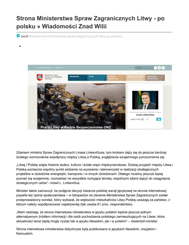 Strona Ministerstwa Spraw Zagranicznych Litwy - po polsku » Wiadomości Znad Wilii zw.lt /litwa/strona-ministerstwa-spraw-zagranicznych-litwy-po-polsku/ Zdaniem ministra Spraw Zagranicznych Linasa Linkevičiusa, tym krokiem dąży się do jeszcze bardziej ścisłego wzmocnienia współpracy między Litwą a Polską, pogłębienia wzajemnego porozumienia się. „Litwę i Polskę wiąże historia stuleci, kultura i ścisłe więzi międzynarodowe. Dzisiaj przyjaźń między Litwą i Polską wzmacnia wspólny punkt widzenia na wyzwania i stanowczość w realizacji strategicznych projektów w dziedzinie energetyki, transportu i w innych dziedzinach. Dlatego musimy jeszcze lepiej poznać się wzajemnie, rozmawiać na wszystkie nurtujące tematy, wspólnymi siłami dążyć do osiągnięcia strategicznych celów”- mówił L. Linkevičius. Minister także zaznaczył, że podjęcie decyzji otwarcia polskiej wersji językowej na stronie internetowej poparła też opinia społeczeństwa – w listopadzie na zlecenie Ministerstwa Spraw Zagranicznych został przeprowadzony sondaż, który wykazał, że większość mieszkańców Litwy Polskę uważają za państwo, z którym należy współpracować najaktywniej (tak uważa 61 proc. respondentów). „Mam nadzieję, że strona internetowa ministerstwa w języku polskim będzie jeszcze jednym alternatywnym źródłem informacji i dla osób pochodzenia polskiego zamieszkujących na Litwie, które aktualności teraz będą mogły czytać tak w języku litewskim, jak i w polskim” – stwierdził minister. Strona internetowa ministerstwa dotychczas była publikowana w językach litewskim, rosyjskim i francuskim.
