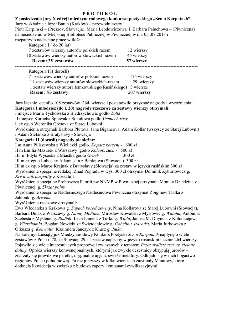 PROTOKÓŁ Z posiedzenia jury X edycji międzynarodowego konkursu poetyckiego „Sen o Karpatach”. Jury w składzie : Józef Baran (Kraków) – przewodniczący Piotr Karpiński – (Preszov, Słowacja), Maria Lebdowiczowa i Barbara Paluchowa – (Piwniczna) na posiedzeniu w Miejskiej Bibliotece Publicznej w Piwnicznej w dn. 05 .07.2013 r. rozpatrzyło nadesłane prace w ilości: Kategoria I ( do 20 lat) 7 zestawów wierszy autorów polskich razem 12 wierszy 18 zestawów wierszy autorów słowackich razem 45 wierszy Razem: 25 zestawów 57 wierszy -----------------------------------------------------------------------------------------------------------------------Kategoria II ( dorośli) 71 zestawów wierszy autorów polskich razem 175 wierszy 11 zestawów wierszy autorów słowackich razem 29 wierszy 1 zestaw wierszy autora łemkowskiego(Rusińskiego) 3 wiersze Razem: 83 zestawy 207 wierszy -------------------------------------------------------------------------------------------------------------------Jury łącznie oceniło 108 zestawów 264 wiersze i postanowiło przyznać nagrody i wyróżnienia : Kategoria I młodzież (do l. 20) nagrody rzeczowe za zestawy wierszy otrzymali: I miejsce Maria Tychowska z Biedrzychowic godło Żółta II miejsce Kornelia Śpiewak z Sokołowa godło Uśmiech róży i ex eguo Weronika Gresova ze Starej Lubovni Wyróżnienia otrzymali Barbora Plutova, Jana Bigancova, Adam Kollar (wszyscy ze Starej Lubovni) i Adam Stefanko z Bratyslavy - Słowacja Kategoria II (dorośli) nagrody pieniężne: I m Anna Piliszewska z Wieliczki godło. Kopacz korzeni - 600 zł II m Emilia Mazurek z Warszawy godło Kolcobrzuch - 500 zł III m Edyta Wysocka z Miastka godło Groel300 zł III m ex eguo Luboslav Adamuscin z Bardejova (Słowacja) 300 zł III m ex equo Maros Krajnak z Bratyslavy (Słowacja) za zestaw w języku rusińskim 300 zł Wyróżnienie specjalne redakcji Znad Popradu w wys. 300 zł otrzymał Dominik Żyburtowicz g. Krwawnik pospolity z Koszalina Wyróżnienie specjalne Proboszcza Parafii pw NNMP w Piwnicznej otrzymała Monika Dziedzina z Piwnicznej g. Skrzat polny Wyróżnienie specjalne Nadleśniczego Nadleśnictwa Piwniczna otrzymał Zbigniew Tlałka z Jabłonki g. Arwena Wyróżnienia rzeczowe otrzymali: Ewa Włodarska z Krakowa g. Zapach kosodrzewiny, Nina Kollarova ze Starej Lubowni (Słowacja), Barbara Dulak z Warszawy g. Nanny McPhee, Mirosław Kowalski z Mysłowic g. Wataha, Antonina Szebesta z Myślenic g. Bodiak, Lech Lament z Turku g. Wiola, Janusz M. Doyniak z Kołodziejewa g. Wierchomla. Bogdan Nowicki ze Świętochłowic g. Gobelin z szarotką, Maria Jurkowska z Olkusza g. Konwalia, Kazimiera Janczyk z Klucz g. Jutka. Na kolejny dziesiąty już Międzynarodowy Konkurs Poetycki Sen o Karpatach napłynęło wiele zestawów z Polski -78, ze Słowacji 29 i 1 zestaw napisany w języku rusińskim łącznie 264 wierszy. Pojawiło się wiele interesujących propozycji związanych z tematem Przez skaliste szczyty, zielone doliny. Oprócz wierszy konwencjonalnych, którymi jak zwykle uczestnicy obsypują jurorów – zdarzały się prawdziwe perełki, oryginalne ujęcia, świeże metafory. Odbijało się w nich bogactwo regionów Polski południowej. Po raz pierwszy w kilku wierszach zaistniały Maniowy, które dotknęła likwidacja w związku z budową zapory i zmianami cywilizacyjnymi.
