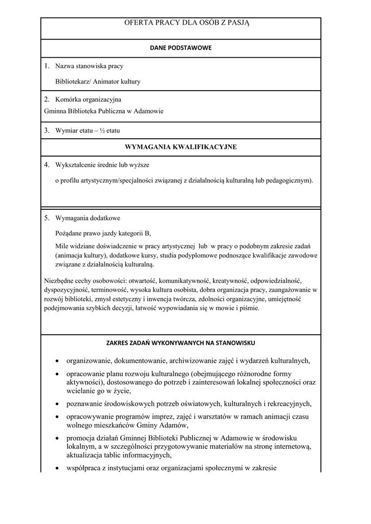 OFERTA PRACY DLA OSÓB Z PASJĄ DANE PODSTAWOWE 1. Nazwa stanowiska pracy Bibliotekarz/ Animator kultury 2. Komórka organizacyjna Gminna Biblioteka Publiczna w Adamowie 3. Wymiar etatu – ½ etatu WYMAGANIA KWALIFIKACYJNE 4. Wykształcenie średnie lub wyższe o profilu artystycznym/specjalności związanej z działalnością kulturalną lub pedagogicznym). 5. Wymagania dodatkowe Pożądane prawo jazdy kategorii B, Mile widziane doświadczenie w pracy artystycznej lub w pracy o podobnym zakresie zadań (animacja kultury), dodatkowe kursy, studia podyplomowe podnoszące kwalifikacje zawodowe związane z działalnością kulturalną. Niezbędne cechy osobowości: otwartość, komunikatywność, kreatywność, odpowiedzialność, dyspozycyjność, terminowość, wysoka kultura osobista, dobra organizacja pracy, zaangażowanie w rozwój biblioteki, zmysł estetyczny i inwencja twórcza, zdolności organizacyjne, umiejętność podejmowania szybkich decyzji, łatwość wypowiadania się w mowie i piśmie. ZAKRES ZADAŃ WYKONYWANYCH NA STANOWISKU organizowanie, dokumentowanie, archiwizowanie zajęć i wydarzeń kulturalnych, opracowanie planu rozwoju kulturalnego (obejmującego różnorodne formy aktywności), dostosowanego do potrzeb i zainteresowań lokalnej społeczności oraz wcielanie go w życie, poznawanie środowiskowych potrzeb oświatowych, kulturalnych i rekreacyjnych, opracowywanie programów imprez, zajęć i warsztatów w ramach animacji czasu wolnego mieszkańców Gminy Adamów, promocja działań Gminnej Biblioteki Publicznej w Adamowie w środowisku lokalnym, a w szczególności przygotowywanie materiałów na stronę internetową, aktualizacja tablic informacyjnych, współpraca z instytucjami oraz organizacjami społecznymi w zakresie kształtowania życia kulturalnego, wspólnego planowania i organizowania wydarzeń pozyskiwanie środków finansowych z różnych źródeł na dofinansowanie działalności Gminnej Biblioteki Publicznej w Adamowie realizacja automatyzacji procesów bibliotecznych ( Mediateka) oraz koordynowanie działem multimediów prowadzenie zajęć: edukacyjnych, literackich, plastycznych z dziećmi i młodzieżą. pobudzanie aktywności kulturalnej, twórczej i artystycznej w środowisku oraz kształtowanie upodobań i zainteresowań społeczności lokalnej w tym zakresie realizacja zajęć w formach: kół, klubów, zespołów i innych, skupiających się wokół zagadnień np. plastycznych, muzycznych, krajoznawczych, tanecznych, teatralnych i innych wynikających z lokalnych potrzeb społecznych obsługa kawiarni w Gminnej Bibliotece Publicznej gromadzenie, opracowywanie i udostępnianie zbiorów bibliotecznych prace związane z informacją biblioteczną i pracą z czytelnikiem praca w systemie bibliotecznym MAK+ popularyzacja książki i czytelnictwa przy pomocy różnych form pracy (indywidualnej i zespołowej) WYMAGANE DOKUMENTY 1. CV, list motywacyjny. 1. kopie dokumentów poświadczających wykształcenie, kwalifikacje, doświadczenie. Miejsce wykonywania pracy Praca będzie wykonywana w Gminnej Bibliotece Publicznej w Adamowie i/lub jej filii w Woli Gułowskiej, i/lub w obiektach, w których organizowane będą imprezy lub wydarzenia. Stosunek pracy zostanie nawiązany na podstawie umowy o pracę. Praca będzie mogła być realizowana również w godzinach popołudniowych oraz w soboty, niedziele i święta. Wymagane dokumenty należy składać w Gminnej Bibliotece Publicznej w Adamowie w terminie do 26 kwietnia 2016 r. z dopiskiem na kopercie „Oferta pracy w bibliotece” Zgłoszenia kandydatów złożone po terminie, w inny sposób niż określony w ogłoszeniu, bez kompletu wymaganych dokumentów, nie będą brane pod uwagę w postępowaniu rekrutacyjnym. Złożonych dokumentów nie zwraca się, oferty niewykorzystane zostaną komisyjnie zniszczone. Informacja o wynikach rekrutacji zostanie ogłoszona na profilu Gminnej Biblioteki Publicznej w Adamowie i w Biuletynie Informacji Publicznej Gminy Adamów. Dodatkowe informacje można uzyskać pod numerem telefonu: (25) 755-31-47 Prosimy o dołączenie do CV i podpisanie następującej klauzuli:„ Wyrażam zgodę na przetwarzanie moich danych osobowych zawartych w mojej ofercie pracy, potrzebnych w procesie rekrutacji (zgodnie z ustawą z dn. 29.08.1997 r. o Ochronie Danych Osobowych Dz. Ust. Nr 133 poz. 883)”