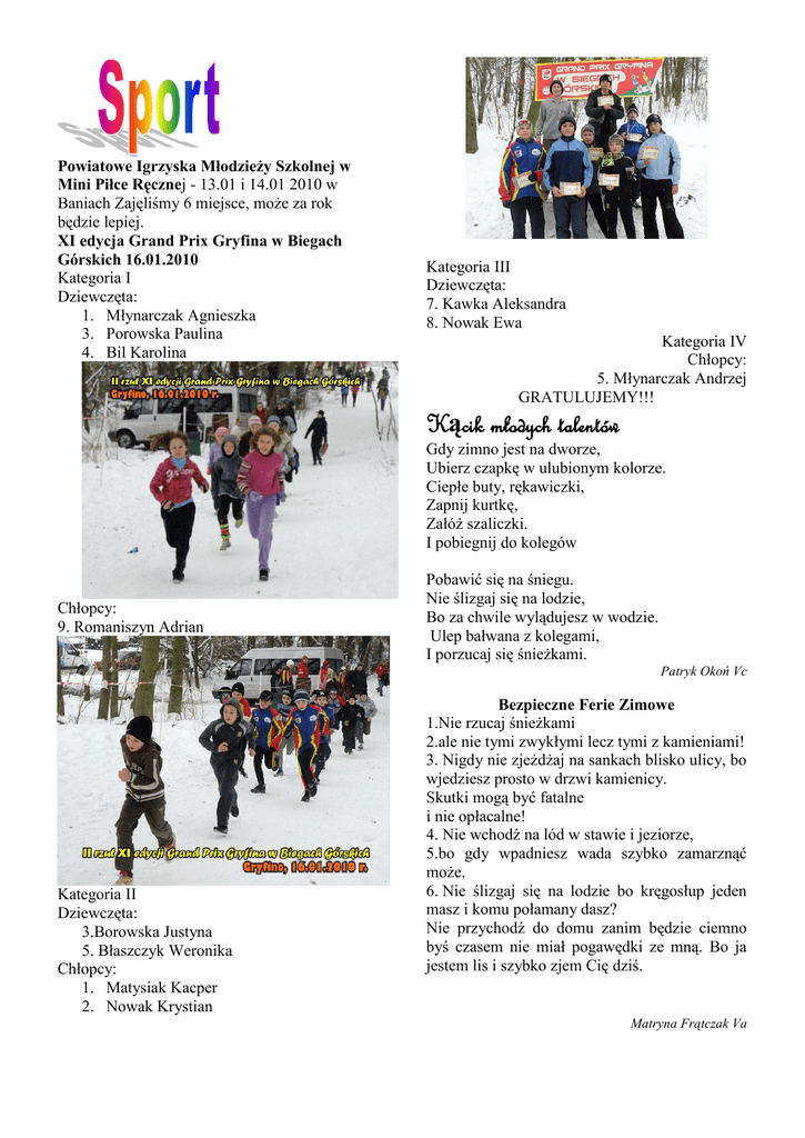 Powiatowe Igrzyska Młodzieży Szkolnej w Mini Piłce Ręcznej - 13.01 i 14.01 2010 w Baniach Zajęliśmy 6 miejsce, może za rok będzie lepiej. XI edycja Grand Prix Gryfina w Biegach Górskich 16.01.2010 Kategoria I Dziewczęta: 1. Młynarczak Agnieszka 3. Porowska Paulina 4. Bil Karolina Kategoria III Dziewczęta: 7. Kawka Aleksandra 8. Nowak Ewa Kategoria IV Chłopcy: 5. Młynarczak Andrzej GRATULUJEMY!!! Kącik młodych talentów Gdy zimno jest na dworze, Ubierz czapkę w ulubionym kolorze. Ciepłe buty, rękawiczki, Zapnij kurtkę, Załóż szaliczki. I pobiegnij do kolegów Chłopcy: 9. Romaniszyn Adrian Pobawić się na śniegu. Nie ślizgaj się na lodzie, Bo za chwile wylądujesz w wodzie. Ulep bałwana z kolegami, I porzucaj się śnieżkami. Patryk Okoń Vc Kategoria II Dziewczęta: 3.Borowska Justyna 5. Błaszczyk Weronika Chłopcy: 1. Matysiak Kacper 2. Nowak Krystian Bezpieczne Ferie Zimowe 1.Nie rzucaj śnieżkami 2.ale nie tymi zwykłymi lecz tymi z kamieniami! 3. Nigdy nie zjeżdżaj na sankach blisko ulicy, bo wjedziesz prosto w drzwi kamienicy. Skutki mogą być fatalne i nie opłacalne! 4. Nie wchodź na lód w stawie i jeziorze, 5.bo gdy wpadniesz wada szybko zamarznąć może. 6. Nie ślizgaj się na lodzie bo kręgosłup jeden masz i komu połamany dasz? Nie przychodź do domu zanim będzie ciemno byś czasem nie miał pogawędki ze mną. Bo ja jestem lis i szybko zjem Cię dziś. Matryna Frątczak Va Cena 1 złoty Nr 101/102 Grudzień/Styczeń 2009/2010 r Miesięcznik z udziałem uczniów i nauczycieli KROPECZKA Zespół Szkół w Gardnie Grudzień – pierwszy miesiąc zimy, okres świąteczny Styczeń – miesiąc zakończenia I półrocza, początek roku Chopinowskiego (200 rocznica urodzin Fryderyka Chopina) Kiedy w grudniu przyjdzie zima, mróz na długo wiosnę wstrzyma. Dzień sylwestrowy pokaże czas lipcowy. Rozdawał czekoladki i zapraszał na zabawę, która odbyła się na Placu Barnima w Gryfinie. 1.12 Dzień walki z AIDS 1.12.2009 Wejście w życie Traktatu Lizbońskiego tzw. Konstytucji UE 4.12 Dzień Górnika (Barbórka) 3.12.1967r. Pierwsza udana operacja przeszczepu serca 5. 12.1901r. Urodził się Walt Disney. 6.12 MIKOŁAJKI 10.12 Światowy dzień Praw Człowieka 10.12.1945r. urodził się Marek Grechuta – piosenkarz i poeta. 13.12.1981r. 28 rocznica Ogłoszenia Stanu Wojennego w Polsce. 16.12.1981r. 28 rocznica pacyfikacji kopalni Wujek 17.12 Dzień bez przeklinania 17.12.1897r. urodził się Władysław Broniewski, poeta polski 18.12.1947r. urodził się Steven Spielberg reżyser amerykański 24.12.1798r. Urodził się Adam Mickiewicz poeta polski 24.12 WIGILIA 25- 26.12 Boże Narodzenie 28.12.1895r. w Paryżu odbył się pierwszy publiczny pokaz kinematografu braci Lumiere 31.12 SYLWESTER 1.01 Nowy rok 2.01.1978r. Polskie Radio nadało po raz pierwszy audycję „Cztery Pory Roku” 8.01.1973r. premiera ekranizacji „Wesela” – A. Wajdy 10.01 1863r. w Londynie uruchomiono pierwszą linię metra na świecie 14.01 1993r. Zatonął na Bałtyku prom Jan Heweliusz 19.01 2006r. zmarł ks. Jan Twardowski poeta 21.01 Dzień Babci 22.01 Dzień Dziadka 22.01 1863r. wybuch powstania Styczniowego 27.01 Międzynarodowy dzień Pamięci ofiar Holokaustu 28.01 Dzień wyzwolenia obozu w Aushwiz 29.01 1913r. w Warszawie otwarto Teatr Polski 31.01 Dzień Przytulania Drugi Mikołaj przyszedł również ze słodyczami dla każdego ucznia. Jasełka Dnia 22.12 2009 klasy II przygotowały Jasełka pod opieką p. B. Borsuk, p. R. Kuligowska, p. K. Mak. Mikołajki Jak co roku zawitali do szkoły Mikołaje. Pierwszy przyszedł 4.12.2009 w Towarzystwie Strażnika miejskiego i Strażnika Leśnego. Zachwycili rodziców nauczycieli również i uczniów. Koncert świąteczny Uczniowie klas I – III cudownie bawiły się na koncercie świątecznym. Śpiewały kolędy i po szkole unosiła się atmosfera świąt. Bal karnawałowy Dnia 20.01.2010 uczniowie klas 0 – IV bawiły się przy muzyce popularnej wykonywanej przez grupę „The Dee Zee Ban’s” W czasie zabawy odbyły się rożne konkursy np. Kto najszybciej nadmucha balon oraz pokaz kostiumów karnawałowych. Było kilku kowboi, rycerzy, muszkieterów, wróżek, dementorzy z Harrego Pottera i inne straszne stwory. Uczniowie bawili się przednio. Popołudniu bawiły się klasy starsze V – gimnazjum przy muzyce w wykonaniu zespołu. Z obserwacji nauczycieli najlepiej się bawiły klasa V c i Ic gimnazjum. Z innych klas tylko wybiórcze osoby się bawiły. Może powód był banalny po prostu za duża sala i za jasno. Również były konkursy. Po zabawie z zespołem miała odbyć się dyskoteka która nie za bardzo się powidła, uczniowie byli nie zadowoleni bo przy muzyce którą przygotował Szkolny DJ nie dało się tańczyć. Film miesiąca Dnia 21.12.2009r. po południu kl.V c, IVa i Va pojechały do kina Helios w Szczecinie pod opieką p. Stefańskiej i p. Pawłowskiej na „Przygody Mikołajka”. Film był bardzo ciekawy dla wszystkich – opowiada o losach chłopca w naszym wieku i jego szkolnych perypetiach. Sytuacje prezentowane w filmie były niezwykle zabawne i jakże podobne do tych, z którymi spotykamy się na co dzień w szkole śmialiśmy się przez całe półtorej godziny – tyle trwał seans. Po filmie podzieliliśmy się na dwie grupy i poszliśmy oglądać projektornie w której pracujący w niej pan opowiadał nam o swojej pracy. Każdy z nas mógł wziąć na pamiątkę wycinek taśmy z filmu. Wracając, więc atmosfera humorystyczna ciągle trwała. Zachęcam wszystkich do obejrzenia filmu o Mikołajku. Przyg. Paula Romuk V c Bezpieczne Ferie Zimowe Niedługo rozpoczną się ferie. Już każdy nie może się ich doczekać. Najlepiej spędzić je aktywnie, np. pojeździć na łyżwach, wybrać się w góry. Jeśli niema się takiej możliwości, można po prostu urządzić bitwę na śnieżki, zorganizować kulig lub ulepić bałwana. Można tez wybrać się w teren z aparatem i uwi
