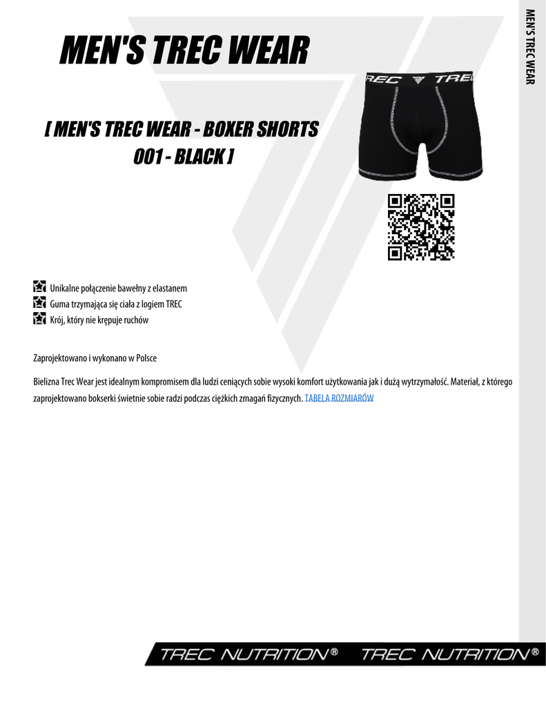[ MEN'S TREC WEAR - BOXER SHORTS 001 - BLACK ] Unikalne połączenie bawełny z elastanem Guma trzymająca się ciała z logiem TREC Krój, który nie krępuje ruchów Zaprojektowano i wykonano w Polsce Bielizna Trec Wear jest idealnym kompromisem dla ludzi ceniących sobie wysoki komfort użytkowania jak i dużą wytrzymałość. Materiał, z którego zaprojektowano bokserki świetnie sobie radzi podczas ciężkich zmagań fizycznych. TABELA ROZMIARÓW MEN'S TREC WEAR MEN'S TREC WEAR