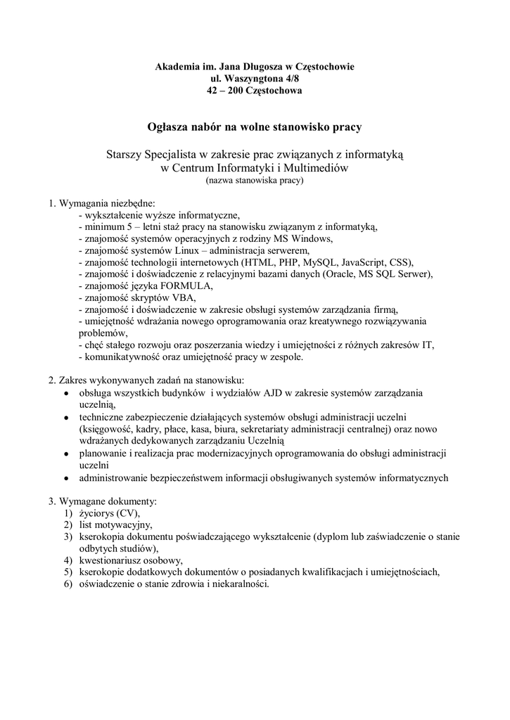Akademia im. Jana Długosza w Częstochowie ul. Waszyngtona 4/8 42 – 200 Częstochowa Ogłasza nabór na wolne stanowisko pracy Starszy Specjalista w zakresie prac związanych z informatyką w Centrum Informatyki i Multimediów (nazwa stanowiska pracy) 1. Wymagania niezbędne: - wykształcenie wyższe informatyczne, - minimum 5 – letni staż pracy na stanowisku związanym z informatyką, - znajomość systemów operacyjnych z rodziny MS Windows, - znajomość systemów Linux – administracja serwerem, - znajomość technologii internetowych (HTML, PHP, MySQL, JavaScript, CSS), - znajomość i doświadczenie z relacyjnymi bazami danych (Oracle, MS SQL Serwer), - znajomość języka FORMULA, - znajomość skryptów VBA, - znajomość i doświadczenie w zakresie obsługi systemów zarządzania firmą, - umiejętność wdrażania nowego oprogramowania oraz kreatywnego rozwiązywania problemów, - chęć stałego rozwoju oraz poszerzania wiedzy i umiejętności z różnych zakresów IT, - komunikatywność oraz umiejętność pracy w zespole. 2. Zakres wykonywanych zadań na stanowisku: obsługa wszystkich budynków i wydziałów AJD w zakresie systemów zarządzania uczelnią, techniczne zabezpieczenie działających systemów obsługi administracji uczelni (księgowość, kadry, płace, kasa, biura, sekretariaty administracji centralnej) oraz nowo wdrażanych dedykowanych zarządzaniu Uczelnią planowanie i realizacja prac modernizacyjnych oprogramowania do obsługi administracji uczelni administrowanie bezpieczeństwem informacji obsługiwanych systemów informatycznych 3. Wymagane dokumenty: 1) życiorys (CV), 2) list motywacyjny, 3) kserokopia dokumentu poświadczającego wykształcenie (dyplom lub zaświadczenie o stanie odbytych studiów), 4) kwestionariusz osobowy, 5) kserokopie dodatkowych dokumentów o posiadanych kwalifikacjach i umiejętnościach, 6) oświadczenie o stanie zdrowia i niekaralności. 4. Wymagane dokumenty należy składać na adres e-mail: [email protected] lub w Kancelarii Ogólnej Akademii im. Jana Długosza w Częstochowie: ul. Waszyngtona 4/8, pok. 507 z dopiskiem „Oferta pracy” w terminie 7 dni od daty ukazania się ogłoszenia w BIP oraz na tablicy ogłoszeń Działu Kadr, Płac i Spraw Socjalnych Akademii im. Jana Długosza. Oryginały dokumentów do wglądu podczas konkursu. 5. Dokumenty, które wpłyną do Akademii im. Jana Długosza po wyżej określonym terminie, nie będą rozpatrywane (decyduje data wpływu e-mail do Uczelni lub data stempla pocztowego). 6. Ogłoszenie o wolnym stanowisku pracy oraz o naborze kandydatów na to stanowisko umieszcza się w Biuletynie Informacji Publicznej oraz na tablicy informacyjnej w Akademii im. Jana Długosza w Częstochowie na okres 7 dni. 7. Informacja o wyniku naboru będzie umieszczana na stronie internetowej BIP http://www.bip.ajd.czest.pl oraz na tablicy ogłoszeń Działu Kadr, Płac i Spraw Socjalnych AJD przy ul. Waszyngtona 4/8 w Częstochowie. 8. Wymagane dokumenty: życiorys – CV (z uwzględnieniem dokładnego przebiegu kariery zawodowej), list motywacyjny powinny być opatrzone klauzulą: Wyrażam zgodę na przetwarzanie moich danych osobowych zawartych w ofercie pracy dla potrzeb niezbędnych do realizacji procesu naboru zgodnie z ustawą z dnia 29 sierpnia 1997 r. o ochronie danych osobowych (t.j. Dz. U. z 2002 r. Nr 101, poz. 926 z późn. zm.). KANCLERZ mgr Mariola Ptaszek