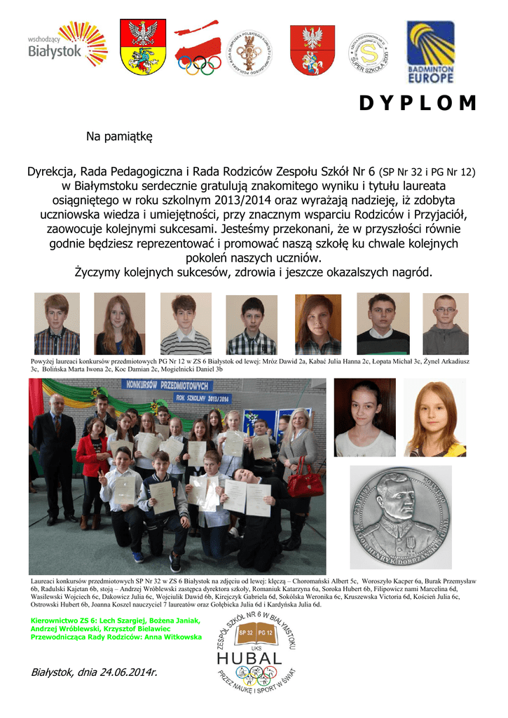 DYPLOM Na pamiątkę Dyrekcja, Rada Pedagogiczna i Rada Rodziców Zespołu Szkół Nr 6 (SP Nr 32 i PG Nr 12) w Białymstoku serdecznie gratulują znakomitego wyniku i tytułu laureata osiągniętego w roku szkolnym 2013/2014 oraz wyrażają nadzieję, iż zdobyta uczniowska wiedza i umiejętności, przy znacznym wsparciu Rodziców i Przyjaciół, zaowocuje kolejnymi sukcesami. Jesteśmy przekonani, że w przyszłości równie godnie będziesz reprezentować i promować naszą szkołę ku chwale kolejnych pokoleń naszych uczniów. Życzymy kolejnych sukcesów, zdrowia i jeszcze okazalszych nagród. Powyżej laureaci konkursów przedmiotowych PG Nr 12 w ZS 6 Białystok od lewej: Mróz Dawid 2a, Kabać Julia Hanna 2c, Łopata Michał 3c, Żynel Arkadiusz 3c, Bolińska Marta Iwona 2c, Koc Damian 2c, Mogielnicki Daniel 3b Laureaci konkursów przedmiotowych SP Nr 32 w ZS 6 Białystok na zdjęciu od lewej: klęczą – Choromański Albert 5c, Woroszyło Kacper 6a, Burak Przemysław 6b, Radulski Kajetan 6b, stoją – Andrzej Wróblewski zastępca dyrektora szkoły, Romaniuk Katarzyna 6a, Soroka Hubert 6b, Filipowicz nami Marcelina 6d, Wasilewski Wojciech 6c, Dakowicz Julia 6c, Wojciulik Dawid 6b, Kirejczyk Gabriela 6d, Sokólska Weronika 6c, Kruszewska Victoria 6d, Koścień Julia 6c, Ostrowski Hubert 6b, Joanna Koszel nauczyciel 7 laureatów oraz Gołębicka Julia 6d i Kardyńska Julia 6d. Kierownictwo ZS 6: Lech Szargiej, Bożena Janiak, Andrzej Wróblewski, Krzysztof Bielawiec Przewodnicząca Rady Rodziców: Anna Witkowska Białystok, dnia 24.06.2014r. LAUREACI KONKURSÓW PRZEDMIOTOWYCH 2013/2014 Chemia - Żynel Arkadiusz Karol 3cg, nauczyciel mgr Dębska Barbara Historia - Koc Damian 2cg, nauczyciel mgr Charyton Katarzyna Informatyka - Łopata Michał 3cg, nauczyciel mgr Makuszewski Tomasz Język angielski - Kabać Julia Hanna 2cg, nauczyciel mgr Kowalczuk Marta Język niemiecki - Mogielnicki Daniel 3bg, nauczyciel mgr Kondraciuk Anna Maria Język polski - Bolińska Marta Iwona 2cg, nauczyciel mgr Fiedorczuk Ewa Matematyka - Łopata Michał 3cg, nauczyciele mgr Klepadło Jolanta i mgr Rutkowska Agnieszka Plastyka - Mróz Dawid 2ag, nauczyciel mgr Nowacka Agnieszka Historia - Burak Przemysław, Radulski Kajetan, Wojciulik Dawid 6b, Filipowicz Naomi Marcelina 6d, nauczyciel mgr Poliszkiewicz Genowefa Język angielski - Romaniuk Katarzyna 6a, nauczyciel mgr Jemielity Agnieszka, Kruszewska Victoria 6d, nauczyciel mgr Orłowska Izabela Język polski - Soroka Hubert 6b, nauczyciel mgr Komar-Tokajuk Karina, Gołębicka Julia, Kirejczyk Gabriela 6d, nauczyciel mgr Rutkowska-Mojsak Wioletta Matematyka - Soroka Hubert 6b, nauczyciele mgr Rutkowska-Kowalczuk Danuta i mgr Rutkowska Agnieszka, Dakowicz Julia 6c, nauczyciele mgr Klepadło Jolanta i mgr Rutkowska Agnieszka, Kirejczyk Gabriela 6d, nauczyciele mgr Klepadło Jolanta i mgr Rutkowska-Kowalczuk Danuta Plastyka - Choromański Albert 5c, Burak Przemysław 6b, Dakowicz Julia, Wasilewski Wojciech 6c, Filipowicz Naomi Marcelina, Kirejczyk Gabriela, Kruszewska Victoria 6d, nauczyciel mgr Koszel Joanna Przyroda - Woroszyło Kacper 6a, Burak Przemysław, Radulski Kajetan, Soroka Hubert 6b, nauczyciel mgr Łopata Agnieszka, Koścień Julia, Sokólska Weronika 6c, Kardyńska Julia, Filipowicz Naomi Marcelina, Ostrowski Hubert 6d, nauczyciel mgr Woroniecka Elżbieta LAUREACI SPORTOWI 2013/2014 IGRZYSKA WOJEWÓDZTWA PODLASKIEGO W INDYWIDUALNYCH BIEGACH PRZEŁAJOWYCH DZIEWCZĄT - I miejsce SP 32 w ZS6 Białystok Klasy IV: Kamila Andruszkiewicz 7, Hanna Popko 25, Katarzyna Wilczewska 34; Klasy V: Izabela Pieńczykowska 30; Klasy VI: Magda Filianowicz 11, Aleksandra Kozicka 17, Aleksandra Siemieniuk 31, Monika Sztachańska 37, Eunika Dykałowicz 41; Trener mgr Adam Roszkowski IGRZYSKA WOJEWÓDZTWA PODLASKIEGO W BADMINTONIE CHŁOPCÓW, I miejsce SP 32 w ZS6 Białystok Dawid Żmójdzin, Paweł Radziwon, Kacper Makarewicz, Hubert Puciłowski; Trener mgr Ewa Jarocka Burniewicz IGRZYSKA MIASTA BIAŁEGOSTOKU W NARCIARSTWIE BIEGOWYM I miejsca: Aleksandra Kozicka 1kmCL, Mikołaj Czaban 1kmCL, Mikołaj Czaban 2kmF; Trener mgr Adam Roszkowski GIMNAZJADA WOJEWÓDZTWA PODLASKIEGO W LEKKIEJ ATLETYCE I miejsca: Urszula Purta 100mpł - 15,56 sek., Urszula Purta skok w dal - 511 cm; Trener mgr Izabela Purta GIMNAZJADA WOJEWÓDZTWA PODLASKIEGO W BADMINTONIE CHŁOPCÓW, I miejsce PG 12 w ZS6 Białystok Paweł Śmiłowski, Adrian Majewski, Kacper Trochim, Andrzej Sawicki; Trener mgr Ewa Jarocka Burniewicz GIMNAZJADA WOJEWÓDZTWA PODLASKIEGO W LIDZE LEKKOATLETYCZNEJ I miejsce: Urszula Purta 100mpł - 15,98 sek.; Trener mgr Izabela Purta FINAŁ KRAJOWY GIMNAZJADY W BADMINTONIE CHŁOPCÓW, I miejsce PG 12 w ZS6 Białystok Paweł Śmiłowski, Adrian Majewski, Andrzej Sawicki; Trener mgr Ewa Jarocka Burniewicz FINAŁ KRAJOWY KONKURSU WIEDZY OLIMPIJSKIEJ "ZIMOWE IGRZYSKA OLIMPIJSKIE - OD CHAMONIX DO SOCZI" 2.06.2014r. Reprezentanci województwa podlaskiego w finale krajowym, w którym zajęli miejsca: IV - Ewelina Kosakowska , VII - Paweł Śmiłowski , XII - Julita Pankiewicz ; Opiekunowie: mgr Monika Szawiel oraz współpraca mgr Anna Kuczyńska Na zdjęciach: od góry od lewej - potrójna mistrzyni województwa podlaskiego Urszula Purta; w środku - finaliści turnieju krajowego wiedzy olimpijskiej (Pankiewicz, Smiłowski i Kosakowska) ; z prawej - zwycięzcy igrzysk województwa podlaskiego w badmintonie (Żmójdzin, Radziwon, Makarewicz, Puciłowski) ; u dołu od lewej - najlepsi narciarze Podlaskiej Ligi Narciarskiej Ola Kozicka i Mikołaj Czaban; z prawej - zwycięzcy gimnazjady wojewódzkiej i finału krajowego w badmintonie (Śmiłowski, Majewski oraz Sawicki)