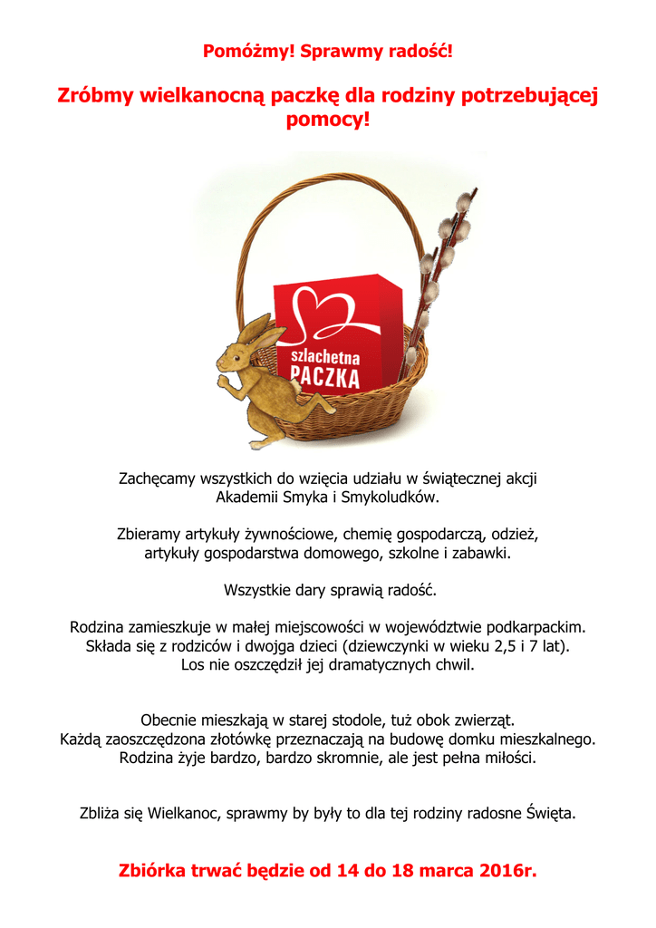 PomóŜmy! Sprawmy radość! Zróbmy wielkanocną paczkę dla rodziny potrzebującej pomocy! Zachęcamy wszystkich do wzięcia udziału w świątecznej akcji Akademii Smyka i Smykoludków. Zbieramy artykuły Ŝywnościowe, chemię gospodarczą, odzieŜ, artykuły gospodarstwa domowego, szkolne i zabawki. Wszystkie dary sprawią radość. Rodzina zamieszkuje w małej miejscowości w województwie podkarpackim. Składa się z rodziców i dwojga dzieci (dziewczynki w wieku 2,5 i 7 lat). Los nie oszczędził jej dramatycznych chwil. Obecnie mieszkają w starej stodole, tuŜ obok zwierząt. KaŜdą zaoszczędzona złotówkę przeznaczają na budowę domku mieszkalnego. Rodzina Ŝyje bardzo, bardzo skromnie, ale jest pełna miłości. ZbliŜa się Wielkanoc, sprawmy by były to dla tej rodziny radosne Święta. Zbiórka trwać będzie od 14 do 18 marca 2016r.