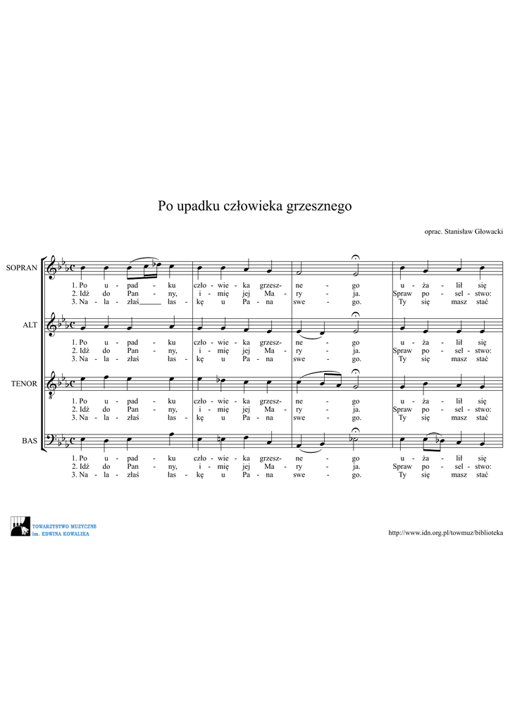 Po upadku człowieka grzesznego oprac. Stanisław Głowacki ° b SOPRAN & b b c œ œ b & b bc œ œ 1. Po u 2. Idź do 3. Na - la - ALT 1. Po u 2. Idź do 3. Na - la - TENOR b œ & b bc ‹ 1. Po œ ?b œ ¢ b bc œ u 2. Idź do 3. Na - la - BAS 1. Po u 2. Idź do 3. Na - la - œ œ bœ œ pad Pan złaś œ pad Pan złaś - œ - œ pad Pan złaś ku ny, łas œ - ku ny, łas œ œ pad Pan złaś ku ny, łas - ku ny, łas œ œ œ œ ˙ czło - wie - ka grzeszne i - mię jej Ma - ry - kę u Pa - na swe - U ˙ go ja. go. U ˙ œ œ œ œ œ œ œ bœ œ œ œ U œ œ ˙ czło - wie - ka grzeszne i - mię jej Ma - ry - kę u Pa - na swe czło - wie - ka grzeszne i - mię jej Ma - ry - kę u Pa - na swe œ nœ œ œ œ czło - wie - ka grzeszne i - mię jej Ma - ry - kę u Pa - na swe - - œ - go ja. go. go ja. go. U b˙ go ja. go. œ œ u - ża Spraw po Ty się œ - lił się sel - stwo: masz stać œ œ œ œ œ œ bœ œ u - ża Spraw po Ty się u - ża Spraw po Ty się u - ża Spraw po Ty się - - - œ œ œ œ œ lił się sel - stwo: masz stać lił się sel - stwo: masz stać œ lił się sel - stwo: masz stać http://www.idn.org.pl/towmuz/biblioteka 2 ° b œ &b b 5 œ œ œ Pan stwo - rze - nia zdro - waś, łas - ki mat - ką Sy - na b &b b œ œ œ œ Pan stwo - rze - nia zdro - waś, łas - ki mat - ką Sy - na b &b b œ ‹ Pan œ œ œ stwo - rze - nia zdro - waś, łas - ki mat - ką Sy - na ?b œ ¢ bb œ œ œ œ Pan stwo - rze - nia zdro - waś, łas - ki mat - ką Sy - na U ˙ ˙ swe peł Je œ swe peł Je - U œ œ ˙ - œ nœ swe peł Je œ swe peł Je go, na, go. - œ - go, na, go. U ˙ go, na, go. U ˙ go, na, go. œ œ ze - słał Pan jest Ta jest œ œ ze - słał Pan jest Ta jest œ bœ ze - słał Pan jest Ta jest œ œ ze - słał Pan jest Ta jest œ œ bœ œ na z To wo - œ na z To wo œ - - œ na z To wo świat bą, la œ œ na z To wo świat bą, la świat bą, la œ - świat bą, la œ œ œ œ ˙ ar - cha - nio - ła cne nie bądź - że tro - skli Bo - ga wszech - moc ne œ bœ go. wa. go. U ˙ œ nœ œ œ œ œ œ U œ œ ˙ ar - cha - nio - ła cne nie bądź - że tro - skli Bo - ga wszech - moc ne œ œ œ nœ œ œ - U ˙ ar - cha - nio - ła cne nie bądź - że tro - skli Bo - ga wszech - moc ne œ œ ar - cha - nio - ła cne nie bądź - że tro - skli Bo - ga wszech - moc ne - - œ - go. wa. go. go. wa. go. bU ˙ go. wa. go. http://www.idn.org.pl/towmuz/biblioteka