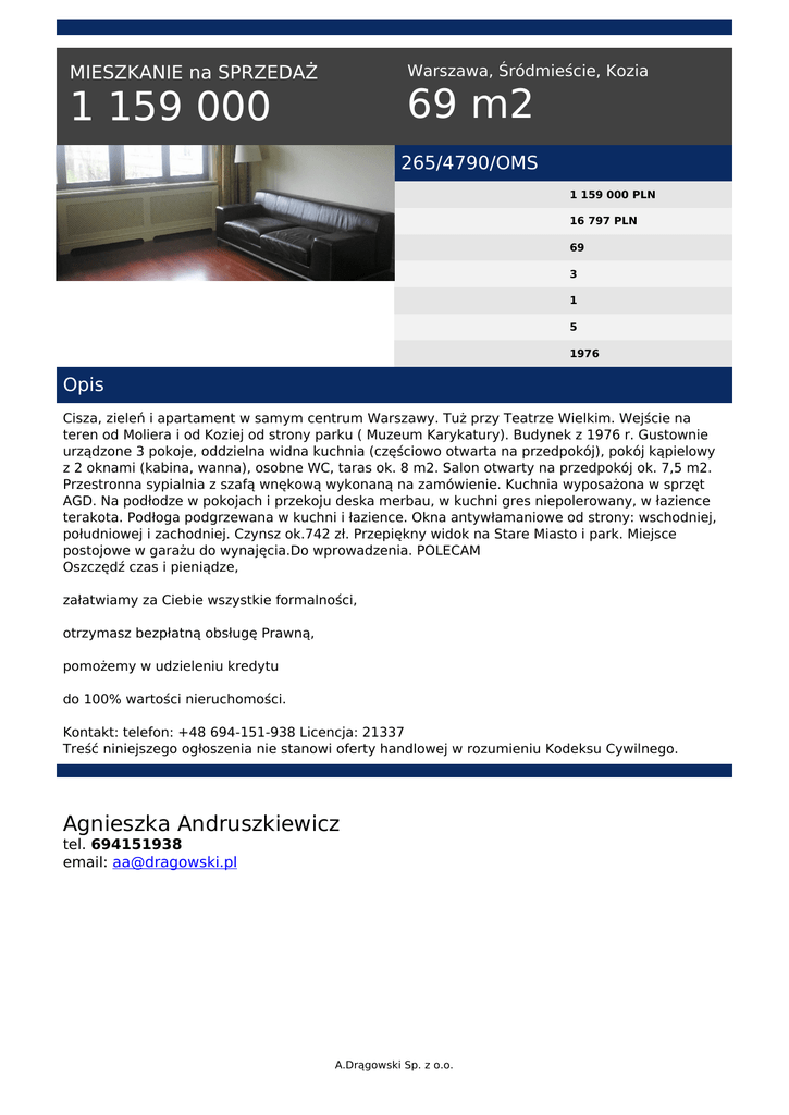 Warszawa, Śródmieście, Kozia MIESZKANIE na SPRZEDAŻ 69 m2 1 159 000 265/4790/OMS 1 159 000 PLN 16 797 PLN 69 3 1 5 1976 Opis Cisza, zieleń i apartament w samym centrum Warszawy. Tuż przy Teatrze Wielkim. Wejście na teren od Moliera i od Koziej od strony parku ( Muzeum Karykatury). Budynek z 1976 r. Gustownie urządzone 3 pokoje, oddzielna widna kuchnia (częściowo otwarta na przedpokój), pokój kąpielowy z 2 oknami (kabina, wanna), osobne WC, taras ok. 8 m2. Salon otwarty na przedpokój ok. 7,5 m2. Przestronna sypialnia z szafą wnękową wykonaną na zamówienie. Kuchnia wyposażona w sprzęt AGD. Na podłodze w pokojach i przekoju deska merbau, w kuchni gres niepolerowany, w łazience terakota. Podłoga podgrzewana w kuchni i łazience. Okna antywłamaniowe od strony: wschodniej, południowej i zachodniej. Czynsz ok.742 zł. Przepiękny widok na Stare Miasto i park. Miejsce postojowe w garażu do wynajęcia.Do wprowadzenia. POLECAM Oszczędź czas i pieniądze, załatwiamy za Ciebie wszystkie formalności, otrzymasz bezpłatną obsługę Prawną, pomożemy w udzieleniu kredytu do 100% wartości nieruchomości. Kontakt: telefon: +48 694-151-938 Licencja: 21337 Treść niniejszego ogłoszenia nie stanowi oferty handlowej w rozumieniu Kodeksu Cywilnego. Agnieszka Andruszkiewicz tel. 694151938 email: [email protected] A.Drągowski Sp. z o.o. Powered by TCPDF (www.tcpdf.org)