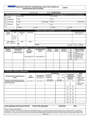 Zgłoszenie zdarzenia niepożądanego, jakie miało miejsce po dopuszczeniu leku do obrotu Biuro firmy Amgen Nr faksu 1. Dane osoby zgłaszającej 22-581-30-05 2. Lekarz przepisujący lek (jeśli nie jest osobą zgłaszającą) imię i nazwisko imię i nazwisko Pielęgniarka adres adres Farmaceuta miasto Konsument kraj Lekarz _________ kod pocztowy miasto kod pocztowy kraj nr telefonu nr faksu 3. Pacjent Inicjały pacjenta AER Nr nr telefonu nr faksu 4. Historia choroby w wywiadzie (w tym rozpoznanie pierwotne) Płeć Masa ciała (kg): Wzrost (cm): Wiek Rasa Początek choroby, data dzień miesiąc rok K M Data urodzenia dzień miesiąc rok LUB Alergie: Ciąża? Tak Nie 5. Informacje o produktach firmy Amgen (w tym szczegółowe dawkowanie) Produkt i wskazanie Droga podania (np. SureClick, ampułkostrzykawka) Data rozpoczęcia leczenia Data zakończenia leczenia dzień miesiąc rok dzień miesiąc rok Dawka / Jednostki Droga podania Częstość stosowania Nr serii Działania podjęte w stosunku do leku 1=żadne, 2=zmniejszenie dawki, 3=zwiększenie dawki, 4=odstawienie leku, 5=ponowne podanie leku (wpisać ‘nzn’ jeśli nr serii nie jest znany) 6. Informacje o zdarzeniu niepożądanym Hospitalizacja Określenie zdarzenia niepożądanego lub objawu (Jako pierwsze należy podać główne zdarzenie niepożądane; zdarzenia należy wpisywać osobno, każde w osobnej linijce) Data wystąpienia Data ustąpienia (jeśli pacjent zmarł, podać datę zgonu) Hospitalizacja? Przedłużenie hospitalizacji? Data przyjęcia dzień miesiąc rok Osoba zgłaszająca (drukowanymi literami): dzień miesiąc rok dzień miesiąc rok Podpis osoby zgłaszającej: Tak Nie Tak Nie Data wypisu dzień miesiąc rok Stanowisko: Czy istnieje związek przyczynowy pomiędzy produktem a zgłoszonymi zdarzeniami? Tak Nie Wynik 1=ustąpienie objawów 2=objawy w trakcie ustępowania 3=zdarzenie nadal trwa 4=zgon z powodu zdarzenia Data: Wersja 2. Data wejścia w życie:08/08/2011 Informujemy, że Pani/Pana dane osobowe będą przetwarzane przez AMGEN Biotechnologia Sp. z o.o. z siedzibą w Warszawie, ul. Złota 59, zgodnie z ustawą z dnia 29 sierpnia 1997 r. o ochronie danych osobowych (Dz. U. 2002 r., nr 101, poz. 926 ze zm.) wyłącznie do celów związanych z realizacją obowiązku monitorowania bezpieczeństwa produktów leczniczych. Każda osoba ma prawo dostępu do treści swoich danych i ich poprawiania. Ponadto informujemy, że wszystkie dostarczone przez Panią/Pana dane będą przekazane w postaci raportu o zdarzeniu niepożądanym do Global Safety, Amgen Inc. (USA). Strona 1 z 2 Zgłoszenie zdarzenia niepożądanego, jakie miało miejsce po dopuszczeniu leku do obrotu AER Nr 7. Inne jednocześnie przyjmowane leki (w tym chemioterapia i leki podejrzane o związek przyczynowy ze zdarzeniem niepożądanym) Dawkowanie Nazwa leku (podać nazwę handlową, jeśli jest znana) Droga podania Jednostki Częstość podania Wskazanie Data rozpoczęcia leczenia Data zakończenia leczenia dzień miesiąc rok Podejrzany Tak Nie dzień miesiąc rok Proszę podać daty ostatniego cyklu chemioterapii, oraz dodatkowo daty pierwszego cyklu. 8. Istotne badania niehematologiczne Data Badania dodatkowe / wyniki dzień miesiąc rok Badanie Data dzień miesiąc rok Jednostka 9. Wartości hematologiczne (w tym wartości początkowe, wartości w chwili wystąpienia zdarzenia, wyniki kolejnych oznaczeń) Test Data dzień miesiąc rok WBC NEU RBC Hgb Hct PLT Retic Segs Bands Metas Lymphs Monos Eos Myelos Basos Blasts Jedn. 10. Opis zdarzenia (zdarzeń): chronologiczne zestawienie objawów podanych powyżej (Należy uwzględnić informacje o zdarzeniu, w tym rozpoznanie, leczenie, skutek wznowienia leczenia, czy zdarzenie utrzymuje się lub spowodowało znaczący uszczerbek na zdrowiu/niesprawność, czy występuje anomalia/wada wrodzona lub czy miało miejsce bezpośrednie zagrożenie życia) Osoba zgłaszająca (drukowanymi literami): Podpis osoby zgłaszającej: Stanowisko: Data: Wersja 2. Data wejścia w życie:08/08/2011 Informujemy, że Pani/Pana dane osobowe będą przetwarzane przez AMGEN Biotechnologia Sp. z o.o. z siedzibą w Warszawie, ul. Złota 59, zgodnie z ustawą z dnia 29 sierpnia 1997 r. o ochronie danych osobowych (Dz. U. 2002 r., nr 101, poz. 926 ze zm.) wyłącznie do celów związanych z realizacją obowiązku monitorowania bezpieczeństwa produktów leczniczych. Każda osoba ma prawo dostępu do treści swoich danych i ich poprawiania. Ponadto informujemy, że wszystkie dostarczone przez Panią/Pana dane będą przekazane w postaci raportu o zdarzeniu niepożądanym do Global Safety, Amgen Inc. (USA). Strona 2 z 2