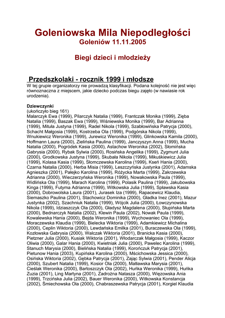 Goleniowska Mila Niepodległości Goleniów 11.11.2005 Biegi dzieci i młodzieży Przedszkolaki - rocznik 1999 i młodsze W tej grupie organizatorzy nie prowadzą klasyfikacji. Podana kolejność nie jest więc równoznaczna z miejscem, jakie dziecko podczas biegu zajęło (w nawiasie rok urodzenia). Dziewczynki (ukończyło bieg 161) Malarczyk Ewa (1999), Pilarczyk Natalia (1999), Frantczak Monika (1999), Zięba Natalia (1999), Baszak Ewa (1999), Wiśniewska Monika (1999), Bar Adrianna (1999), Mituła Justyna (1999), Radel Nikola (1999), Szabłowińska Patrycja (2000), Schacht Małgosia (1999), Kostrzeba Ola (1999), Podgórska Nikola (1999), Wnukiewicz Weronika (1999), Jurewicz Weronika (1999), Glinkowska Kamila (2000), Hoffmann Laura (2000), Zielińska Paulina (1999), Janczyszyn Anna (1999), Mucha Natalia (2000), Pogródek Kasia (2000), Astachow Weronika (2002), Słomińska Gabrysia (2000), Rybak Sylwia (2000), Rosińska Angelika (1999), Zygmunt Julia (2000), Grodkowska Justyna (1999), Skubała Nikola (1999), Mikuśkiewicz Julia (1999), Kolasa Kasia (1999), Słomczewska Karolina (1999), Kseń Hania (2000), Czarna Natalia (2000), Herba Misia (1999), Leszczyńska Justynka (2001), Adamska Agnieszka (2001), Pałejko Karolina (1999), Różycka Marta (1999), Zakrzewska Adrianna (2000), Wieczerzyńska Weronika (1999), Nowakowska Paula (1999), Widlińska Ola (1999), Marach Karolina (1999), Polasik Paulina (1999), Jakubowska Kinga (1999), Futyma Adrianna (1999), Witkowska Julia (1999), Spławska Kasia (2000), Dobrowolska Laura (2001), Jurasek Iza (1999), Rapacewicz Klaudia, Siemaszko Paulina (2001), Stachowicz Dominika (2000), Gładka Inez (2001), Mazur Justynka (2002), Szachniuk Natalia (1999), Wójcik Julia (2000), Łowczynowska Nikola (1999), Idziaszczyk Ola (2000), Gładysz Magdalena (2000), Słupińska Marta (2000), Bednarczyk Natalia (2002), Klewin Paula (2002), Nowak Paula (1999), Kowalewska Hania (2000), Bejda Weronika (1999), Wychowaniec Ola (1999), Moraczewska Klaudia (1999), Bielecka Wiktoria (1999), Adamkiewicz Michalina (2000), Ceplin Wiktoria (2000), Lewdańska Emilka (2001), Buraczewska Ola (1999), Kozłowska Gabrysia (2000), Walczak Wiktoria (2001), Branicka Kasia (2000), Pietzner Julia (2000), Kusiak Wiktoria (2001), Włodarczak Małgosia (1999), Kaczor Oliwia (2000), Galar Hania (2000), Kwietniak Julia (2000), Pawelec Karolina (1999), Stanuch Marysia (2000), Bielińska Natalia (1999), Korończuk Patrycja (2001), Pietunow Hania (2003), Kupińska Karolina (2000), Mścichowska Jessica (2000), Osińska Wiktoria (2002), Gębka Patrycja (2001), Zając Sylwia (2001), Pender Alicja (2000), Szubert Natalia (1999), Kosior Ola (2000), Matławska Marysia (2001), Cieślak Weronika (2000), Bartoszczyk Ola (2002), Huńka Weronika (1999), Huńka Zuzia (2001), Ling Martyna (2001), Zadrożna Natasza (2000), Więzowska Ania (1999), Trzcińska Julia (2002), Bauer Weronika (2000), Witkowska Konstancja (2002), Śmiechowska Ola (2000), Chabraszewska Patrycja (2001), Korgiel Klaudia (1999), Szczęsna Dominika (2001), Rzeźniczak Magda (1996), Heinrich Samanta (2000), Kwiatkowska Marta (1999), Oleś Nacia (2004), Łęcka Karolinka (2000), Ratkiewicz Beatka (1998), Mil Marcelinka (2000), Stężalska Julia (2002), Kowalska Monika (1999), Domańska Anita (2001), Wiercińska Zuzia (2001), Małkiewicz Pola (2000), Małecka Julia (2000), Zamojska Karolinka (2004), Michalska Jagoda (2001), Urbańska Natalka (2001), Maciejewska Lidia (2002), Słaby Marta (2001), Wróbel Hania (2003), Strzebońska Adrianna (2001), Stępniak Monika (1999), Gradowska Agnieszka (2000), Boguszewska Natasza (2000), Kosakiewicz Hania (2001), Jagiełło Marcelinka (2001), Kałuża Weronika (2002), Szymkowiak Zuzia (2000), Kaźmierczak Nikola (2000), Lisiak Julia (2001), Dubino Karolina (2002), Kotyza Ola (2001), Zwierzchowska Jagoda (2002), Wójcik Weronika (2002), Woszczyło Marysia (2001), Stolar Anastazja (2000), Natalia (2002), Wentruba Ola (2002), Adamowicz Gabrysia (2004), Zubko Michalina (2002), Ogórska Nela (2002), Żabkiewicz Laura (2003), Kiedas Gabi (2003), Bogdaniec Amelka (2001), Świadek Marcelinka (2001), Maksym Ola (1999), Jędrzejczak Ola (1998), Mikulska Ewelina (1999), Ziębicka Wiktoria (2002), Pacholska Alicja (2001), Lewandowska Kasia (2003), Skowron Anetta (2000). Chłopcy (ukończyło bieg 204) Stawski Wojtek (1999), Jurewicz Patryk (1998), Stefański Daniel (1999), Bojda Wojtek (1999), Bienioszek Miłosz (1999), Marciniak Daniel (1999), Psiuk Mateusz (1999), Martynowicz Dawid (1999), Tkachenko Michał (1999), Jaszcz Marcin (1999), Chorąży Sebastian (1999), Burno Mateusz (1999), Grajek Filip (1999), Czarny Radek (1999), Królczyński Tomek (1999), Matławski Paweł (1999), Kolasa Jakub (1999), Polankiewicz Piotr (1997), Łykowski Maciej (1999), Ładziak Damian (1999), Dytkowski Damian (1999), Denis Dawid (1999), Jastrzębski Michał (1999), Rus Przemek (1999), Mazur Damian (1999), Popiel Krzyś (1999), Szymkowiak Mikołaj (2000), Bojda Paweł (1998), Kowalewski Norbert (1999), Cichocki Marcin (1999), Antczak Tomek (1999), Perko Marek (2001), Bezulski Jacek (2001), Szponar Kuba (1999), Kurek Szymon (1999), Kondraciuk Wojtek (1999), Retecki Michał (1999), Modrzejewski Sebastian (2000), Mańczak Kuba (1999), Trzciński Adrian (2000), Adamkiewicz Damian (1999), Staszak Dominik (1999), Kanciała Dominik (1999), Zajdel Kacperek (2001), Żabiłowicz Filip (2000), Drozdek Patryk (1999), Kwaśniewicz Bartek (1999), Wiączek Michałek (2001), Zaborowski Grześ (1999), Leszczyński Michał (1999), Osuch Lucjan (1999), Siliwanowicz Mateusz (2001), Żabkiewicz Kuba (2000), Lisiecki Kuba (2000), Gajewski Mateusz (1999), Stankiewicz Przemek (1999), Bergmański Wojtek (2000), Zięciak Michał (1999), Pośnik Oskar (2002), Górski Patryk (1999), Król Oskar (1999), Kupryjańczyk Maciek (2001), Przybylski Maksymilian (2001), Witkowski Patryk (1999), Sieniuć Łukasz (1999), Danis Filip (2004), Biskowski Grzegorz (1999), Tru