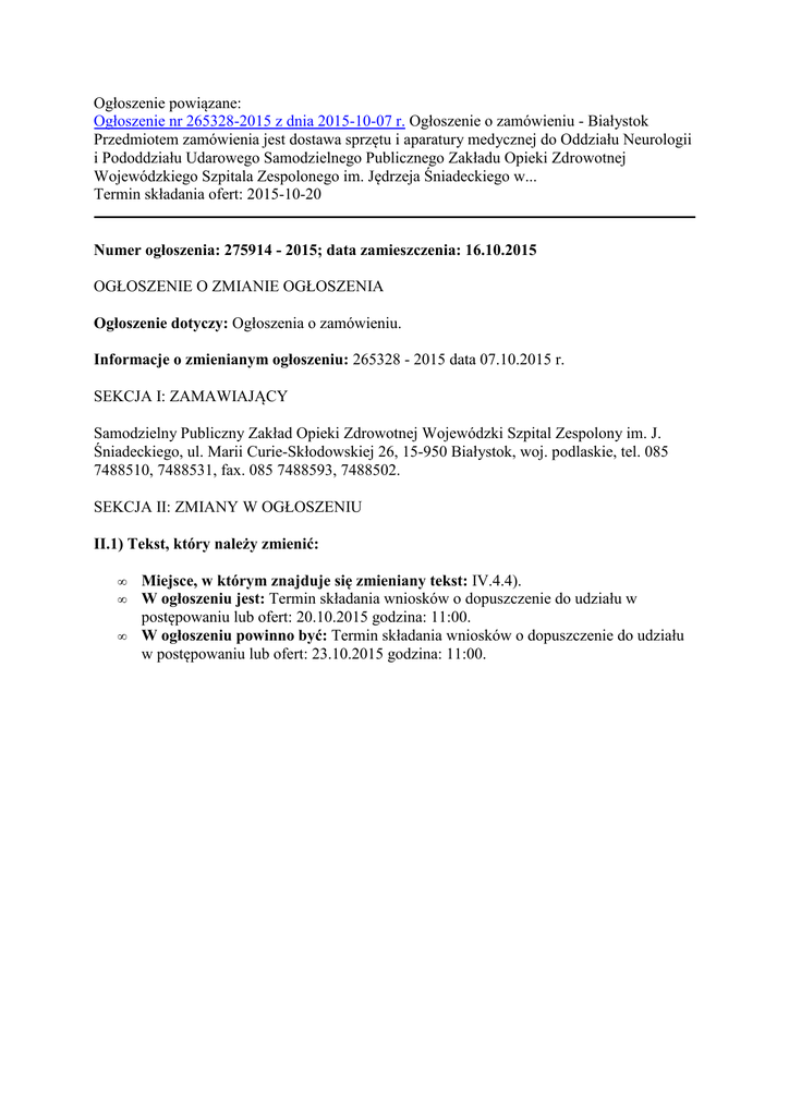 Ogłoszenie powiązane: Ogłoszenie nr 265328-2015 z dnia 2015-10-07 r. Ogłoszenie o zamówieniu - Białystok Przedmiotem zamówienia jest dostawa sprzętu i aparatury medycznej do Oddziału Neurologii i Pododdziału Udarowego Samodzielnego Publicznego Zakładu Opieki Zdrowotnej Wojewódzkiego Szpitala Zespolonego im. Jędrzeja Śniadeckiego w... Termin składania ofert: 2015-10-20 Numer ogłoszenia: 275914 - 2015; data zamieszczenia: 16.10.2015 OGŁOSZENIE O ZMIANIE OGŁOSZENIA Ogłoszenie dotyczy: Ogłoszenia o zamówieniu. Informacje o zmienianym ogłoszeniu: 265328 - 2015 data 07.10.2015 r. SEKCJA I: ZAMAWIAJĄCY Samodzielny Publiczny Zakład Opieki Zdrowotnej Wojewódzki Szpital Zespolony im. J. Śniadeckiego, ul. Marii Curie-Skłodowskiej 26, 15-950 Białystok, woj. podlaskie, tel. 085 7488510, 7488531, fax. 085 7488593, 7488502. SEKCJA II: ZMIANY W OGŁOSZENIU II.1) Tekst, który należy zmienić: • • • Miejsce, w którym znajduje się zmieniany tekst: IV.4.4). W ogłoszeniu jest: Termin składania wniosków o dopuszczenie do udziału w postępowaniu lub ofert: 20.10.2015 godzina: 11:00. W ogłoszeniu powinno być: Termin składania wniosków o dopuszczenie do udziału w postępowaniu lub ofert: 23.10.2015 godzina: 11:00.