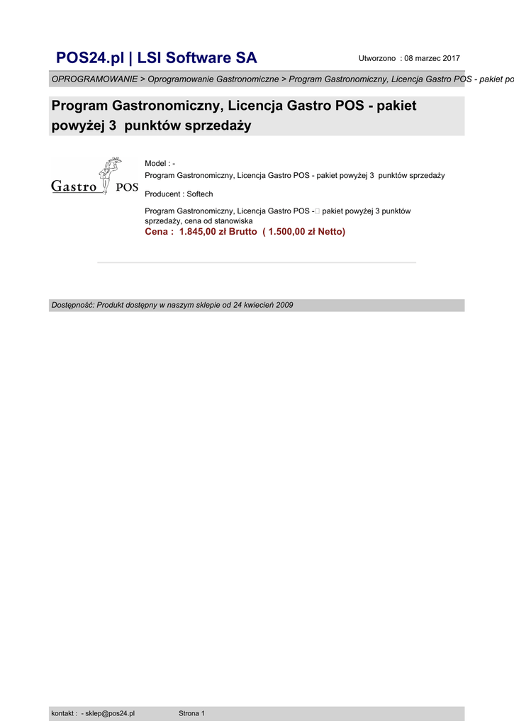 POS24.pl | LSI Software SA Utworzono : 08 marzec 2017 OPROGRAMOWANIE > Oprogramowanie Gastronomiczne > Program Gastronomiczny, Licencja Gastro POS - pakiet po Program Gastronomiczny, Licencja Gastro POS - pakiet powyżej 3 punktów sprzedaży Model : Program Gastronomiczny, Licencja Gastro POS - pakiet powyżej 3 punktów sprzedaży Producent : Softech Program Gastronomiczny, Licencja Gastro POS - pakiet powyżej 3 punktów sprzedaży, cena od stanowiska Cena : 1.845,00 zł Brutto ( 1.500,00 zł Netto) Dostępność: Produkt dostępny w naszym sklepie od 24 kwiecień 2009 kontakt : - [email protected] Strona 1