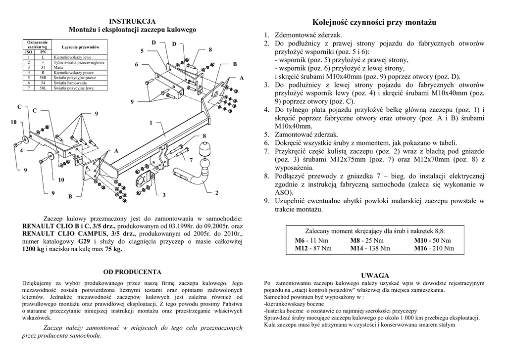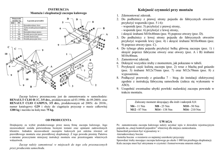 Kolejność czynności przy montażu INSTRUKCJA Montażu i eksploatacji zaczepu kulowego Oznaczenie zacisku wg ISO PN 1 L 2 + 3 31 4 R 5 58R 6 54 7 58L D Łączenie przewodów D 8 5 Kierunkowskazy lewe Tylne światła przeciwmgłowe Masa Kierunkowskazy prawe Światła pozycyjne prawe Światła hamowania Światła pozycyjne lewe B 6 A 9 C C 9 10 1 8 4 A 7 9 10 9 3 B 2 Zaczep kulowy przeznaczony jest do zamontowania w samochodzie: RENAULT CLIO B i C, 3/5 drz., produkowanym od 03.1998r. do 09.2005r. oraz RENAULT CLIO CAMPUS, 3/5 drz., produkowanym od 2005r. do 2010r., numer katalogowy G29 i służy do ciągnięcia przyczep o masie całkowitej 1200 kg i nacisku na kulę max 75 kg. OD PRODUCENTA Dziękujemy za wybór produkowanego przez naszą firmę zaczepu kulowego. Jego niezawodność została potwierdzona licznymi testami oraz opiniami zadowolonych klientów. Jednakże niezawodność zaczepów kulowych jest zależna również od prawidłowego montażu oraz prawidłowej eksploatacji. Z tego powodu prosimy Państwa o staranne przeczytanie niniejszej instrukcji montażu oraz przestrzeganie właściwych wskazówek. Zaczep należy zamontować w miejscach do tego celu przeznaczonych przez producenta samochodu. 1. Zdemontować zderzak. 2. Do podłużnicy z prawej strony pojazdu do fabrycznych otworów przyłożyć wsporniki (poz. 5 i 6): - wspornik (poz. 5) przyłożyć z prawej strony, - wspornik (poz. 6) przyłożyć z lewej strony, i skręcić śrubami M10x40mm (poz. 9) poprzez otwory (poz. D). 3. Do podłużnicy z lewej strony pojazdu do fabrycznych otworów przyłożyć wspornik lewy (poz. 4) i skręcić śrubami M10x40mm (poz. 9) poprzez otwory (poz. C). 4. Do tylnego płata pojazdu przyłożyć belkę główną zaczepu (poz. 1) i skręcić poprzez fabryczne otwory oraz otwory (poz. A i B) śrubami M10x40mm. 5. Zamontować zderzak. 6. Dokręcić wszystkie śruby z momentem, jak pokazano w tabeli. 7. Przykręcić część kulistą zaczepu (poz. 2) wraz z blachą pod gniazdo (poz. 3) śrubami M12x75mm (poz. 7) oraz M12x70mm (poz. 8) z wyposażenia. 8. Podłączyć przewody z gniazdka 7 – bieg. do instalacji elektrycznej zgodnie z instrukcją fabryczną samochodu (zaleca się wykonanie w ASO). 9. Uzupełnić ewentualne ubytki powłoki malarskiej zaczepu powstałe w trakcie montażu. Zalecany moment skręcający dla śrub i nakrętek 8,8: M6 - 11 Nm M8 - 25 Nm M10 - 50 Nm M12 - 87 Nm M14 - 138 Nm M16 - 210 Nm UWAGA Po zamontowaniu zaczepu kulowego należy uzyskać wpis w dowodzie rejestracyjnym pojazdu na „stacji kontroli pojazdów” właściwej dla miejsca zamieszkania. Samochód powinien być wyposażony w : -kierunkowskazy boczne -lusterka boczne o rozstawie co najmniej szerokości przyczepy Sprawdzać śruby mocujące zaczepu kulowego po około 1 000 km przebiegu eksploatacji. Kula zaczepu musi być utrzymana w czystości i konserwowana smarem stałym PPUH AUTO-HAK S.J. Wyposażenie zaczepu: Produkcja Zaczepów Kulowych Henryk & Zbigniew Nejman 76-200 SŁUPSK ul. Słoneczna 16K tel/fax (059) 8-414-414; 8-414-413 E-mail: [email protected] www. autohak.com.pl Zaczep kulowy bez wyposażenia elektrycznego G29 Klasa: A50-X Nr kat. Przeznaczony do zamontowania w samochodzie: Producent: RENAULT Model: CLIO B i C Typ: 3/5 drz. produkowanym od 03.1998r. do 06.2001r. oraz od 07.2001r. do 09.2005r. oraz Model: CLIO CAMPUS Typ: 3/5 drz. produkowanym od 2005r. do 2010r. KARTA GWARANCYJNA Dane techniczne: Wartość siły D: 6,55 kN maksymalna masa przyczepy: 1200 kg maksymalny nacisk na kulę: 75 kg Numer homologacji zgodnie z wytycznymi regulaminu EKG/ONZ 55.01: E20-55R-01 0971 Producent udziela gwarancji niniejszą kartą gwarancyjną na okres 24 miesięcy licząc od dnia zakupu zaczepu kulowego do samochodu: RENAULT CLIO B i C 3/5 drz. produkowanego od 03.1998r. do 09.2005r. oraz RENAULT CLIO CAMPUS 3/5 drz. produkowanego od 2005r. do 2010r. Data produkcji .............................. Data zakupu............................................. Zakres gwarancji obejmuje wyłącznie wady jakościowe wynikające z winy producenta. Gwarancja nie obejmuje natomiast uszkodzeń zawinionych przez nabywcę, wynikających z niewłaściwego montażu, użytkowania lub konserwacji, uszkodzeń mechanicznych, normalnego zużycia podczas eksploatacji itp. Gwarancja udzielona na zakupiony towar nie wyłącza, nie ogranicza ani nie zawiesza uprawnień kupującego wynikających z niezgodności towaru z umową. Reklamacje należy zgłaszać w punkcie sprzedaży, składając jednocześnie kartę gwarancyjną. Usunięcie "wady" następuje po stwierdzeniu przez punkt sprzedaży wspólnie z producentem słuszności złożonej reklamacji. Reklamacja powinna być załatwiona w ciągu 14 dni od dnia uznania reklamacji. Karta gwarancyjna jest nieważna jeżeli nie jest wypełniona i podpisana. Data zgłoszenia reklamacji: ................................................................... INFORMACJA WSTĘPNA Zaczep kulowy jest skonstruowany zgodnie z zasadami bezpieczeństwa ruchu drogowego. Zaczep kulowy jest elementem wpływającym na bezpieczeństwo jazdy i może zostać zainstalowany wyłącznie przez personel wyspecjalizowany. Niedopuszczalne jest dokonywanie jakichkolwiek zmian w konstrukcji zaczepu. Powoduje to wygaśniecie dopuszczenia do stosowania. W przypadku obecności masy izolacyjnej lub osłony podwozia w miejscu przylegania zaczepu, należy ją usunąć. Nieosłonięte miejsca karoserii oraz wywiercone otwory należy pomalować farbą antykorozyjną. Informacjami wiążącymi odnośnie wartości obciążeń są dane podawane przez producenta samochodu, względnie wartości maksymalnej masy przyczepy oraz maksymalnego nacisku na kulę, przy czym wartości parametrów zaczepu kulowego nie mogą być przekroczone. Wzór do obliczania wartości siły D: Maks. masa przyczepy [kg] x Maks. masa samochodu [kg] Maks. masa przyczepy [kg] + Maks. masa samochodu [kg] X 9,81 = 1000 D [kN]