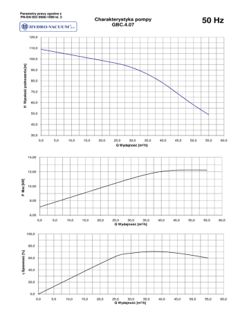 Parametry pracy zgodne z PN-EN ISO 9906:1999 kl. 2 50 Hz Charakterystyka pompy GBC.4.07 120,0 110,0 H Wysokość podnoszenia [m] 100,0 90,0 80,0 70,0 60,0 50,0 40,0 30,0 0,0 5,0 10,0 15,0 20,0 25,0 30,0 35,0 40,0 45,0 50,0 55,0 60,0 Q Wydajność [m3/h] 14,00 P Moc [kW] 12,00 10,00 8,00 6,00 0,0 5,0 10,0 15,0 20,0 25,0 30,0 35,0 Q Wydajność [m3/h] 40,0 45,0 10,0 15,0 20,0 25,0 30,0 35,0 Q Wydajność [m3/h] 40,0 45,0 50,0 55,0 60,0 100,0 η Sprawność [%] 80,0 60,0 40,0 20,0 0,0 0,0 5,0 50,0 55,0 60,0