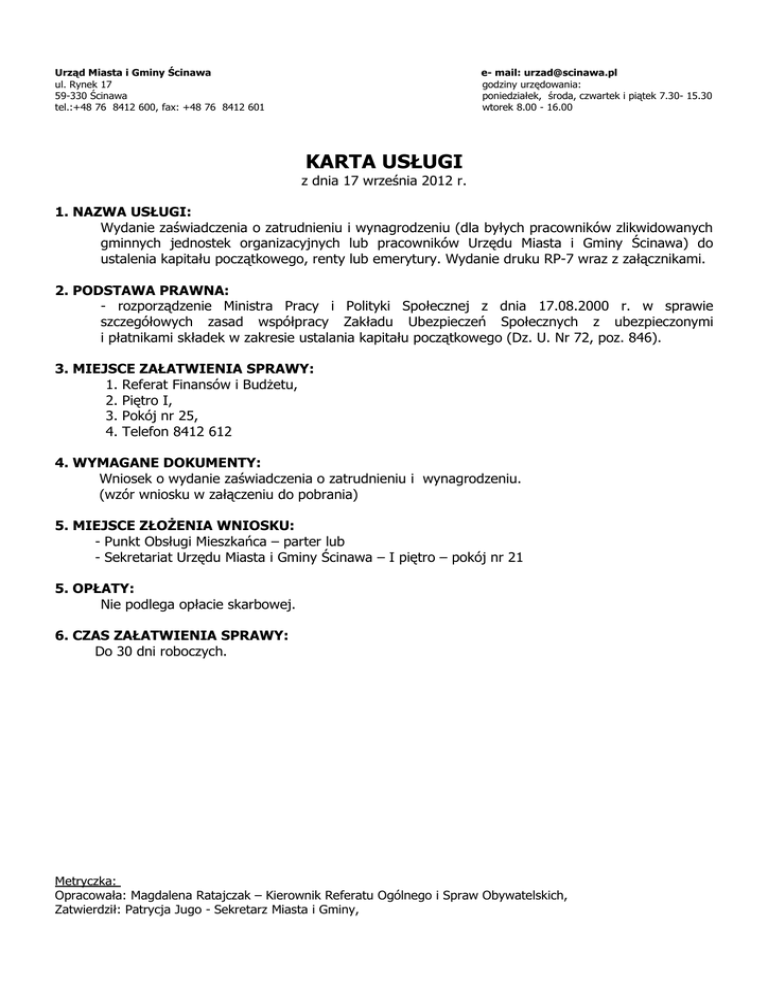 Urząd Miasta i Gminy Ścinawa ul. Rynek 17 59-330 Ścinawa tel.:+48 76 8412 600, fax: +48 76 8412 601 e- mail: [email protected] godziny urzędowania: poniedziałek, środa, czwartek i piątek 7.30- 15.30 wtorek 8.00 - 16.00 KARTA USŁUGI z dnia 17 września 2012 r. 1. NAZWA USŁUGI: Wydanie zaświadczenia o zatrudnieniu i wynagrodzeniu (dla byłych pracowników zlikwidowanych gminnych jednostek organizacyjnych lub pracowników Urzędu Miasta i Gminy Ścinawa) do ustalenia kapitału początkowego, renty lub emerytury. Wydanie druku RP-7 wraz z załącznikami. 2. PODSTAWA PRAWNA: - rozporządzenie Ministra Pracy i Polityki Społecznej z dnia 17.08.2000 r. w sprawie szczegółowych zasad współpracy Zakładu Ubezpieczeń Społecznych z ubezpieczonymi i płatnikami składek w zakresie ustalania kapitału początkowego (Dz. U. Nr 72, poz. 846). 3. MIEJSCE ZAŁATWIENIA SPRAWY: 1. Referat Finansów i Budżetu, 2. Piętro I, 3. Pokój nr 25, 4. Telefon 8412 612 4. WYMAGANE DOKUMENTY: Wniosek o wydanie zaświadczenia o zatrudnieniu i wynagrodzeniu. (wzór wniosku w załączeniu do pobrania) 5. MIEJSCE ZŁOŻENIA WNIOSKU: - Punkt Obsługi Mieszkańca – parter lub - Sekretariat Urzędu Miasta i Gminy Ścinawa – I piętro – pokój nr 21 5. OPŁATY: Nie podlega opłacie skarbowej. 6. CZAS ZAŁATWIENIA SPRAWY: Do 30 dni roboczych. Metryczka: Opracowała: Magdalena Ratajczak – Kierownik Referatu Ogólnego i Spraw Obywatelskich, Zatwierdził: Patrycja Jugo - Sekretarz Miasta i Gminy, Dane Wnioskodawcy: Nazwisko i Imię:……………………………………………………………………………………………….................………………………… Adres:…………………………………………………………………………………………………………….................…………………………. Nr PESEL:……………………………………………………………………………………………………………………..................……………. Nr telefonu:………………………………………………………………………………………………………………...…………..................... Burmistrz Ścinawy WNIOSEK O WYDANIE ZAŚWIADCZENIA O ZATRUDNIENIU I WYNAGRODZENIU Proszę o wydanie: 1) zaświadczenia o zatrudnieniu i zarobkach – ZUS Rp-7 2) inne……………………………………………………………. Dodatkowe dane Wnioskodawcy: Nazwisko panieńskie:........................................................................................................................ Data i miejsce urodzenia:.................................................................................................................. Imię ojca i matki:............................................................................................................................. Nazwa zakładu pracy, w którym była zatrudniona osoba dla której zostanie wydane niniejsze zaświadczenie:................................................................................................................................. Okres zatrudnienia w w/w zakładzie pracy: od _ _ - _ _ - _ _ _ _ r. do _ _ - _ _ - _ _ _ _ r. Adres do korespondencji*................................................................................................................. ..................................................... miejscowość, data Uwagi: * wypełnić jeśli adres jest inny niż podany wcześniej ........................................................ podpis Wnioskodawcy