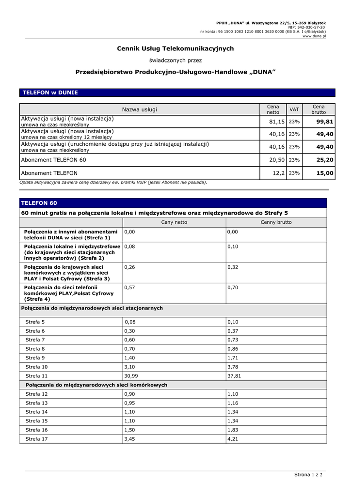 PPUH „DUNA” ul. Waszyngtona 22/5, 15-269 Białystok NIP: 542-030-57-20 nr konta: 96 1500 1083 1210 8001 3620 0000 (KB S.A. I o/Białystok) www.duna.pl Cennik Usług Telekomunikacyjnych świadczonych przez Przedsiębiorstwo Produkcyjno-Usługowo-Handlowe „DUNA” TELEFON w DUNIE Cena netto Nazwa usługi Aktywacja usługi (nowa instalacja) umowa na czas nieokreślony Aktywacja usługi (nowa instalacja) umowa na czas określony 12 miesięcy Aktywacja usługi (uruchomienie dostępu przy już istniejącej instalacji) umowa na czas nieokreślony Abonament TELEFON 60 Abonament TELEFON VAT Cena brutto 81,15 23% 99,81 40,16 23% 49,40 40,16 23% 49,40 20,50 23% 25,20 12,2 23% 15,00 Opłata aktywacyjna zawiera cenę dzierżawy ew. bramki VoIP (jeżeli Abonent nie posiada). TELEFON 60 60 minut gratis na połączenia lokalne i międzystrefowe oraz międzynarodowe do Strefy 5 Ceny netto Połączenia z innymi abonamentami telefonii DUNA w sieci (Strefa 1) Cenny brutto 0,00 0,00 Połączenia lokalne i międzystrefowe 0,08 (do krajowych sieci stacjonarnych innych operatorów) (Strefa 2) 0,10 Połączenia do krajowych sieci komórkowych z wyjątkiem sieci PLAY i Polsat Cyfrowy (Strefa 3) 0,26 0,32 Połączenia do sieci telefonii komórkowej PLAY,Polsat Cyfrowy (Strefa 4) 0,57 0,70 Połączenia do międzynarodowych sieci stacjonarnych Strefa 5 0,08 0,10 Strefa 6 0,30 0,37 Strefa 7 0,60 0,73 Strefa 8 0,70 0,86 Strefa 9 1,40 1,71 Strefa 10 3,10 3,78 Strefa 11 30,99 37,81 Połączenia do międzynarodowych sieci komórkowych Strefa 12 0,90 1,10 Strefa 13 0,95 1,16 Strefa 14 1,10 1,34 Strefa 15 1,10 1,34 Strefa 16 1,50 1,83 Strefa 17 3,45 4,21 Strona 1 z 2 PPUH „DUNA” ul. Waszyngtona 22/5, 15-269 Białystok NIP: 542-030-57-20 nr konta: 96 1500 1083 1210 8001 3620 0000 (KB S.A. I o/Białystok) www.duna.pl Inne połączenia Strefa Opis Strefa 18 Połączenia do numerów ze wskaźnikiem** 0800, 00800 Strefa 19 Połączenia do numerów TP S.A. (118 912, 118 913) Cena netto Cena brutto 0,00 0,00 1,35 Za rozpoczęcie połączenia 1,65 Za rozpoczęcie połączenia 0,08 Opłata za minutę połączenia 0,10 Opłata za minutę połączenia Strefa 20 Połączenia do numerów ze wskaźnikiem** 8011, 801-2, 801-3, 801-7, 801-8, 0,09 0,11 Strefa 21 Połączenia do numerów ze wskaźnikiem** 801-9 0,09 0,11 Strefa 22 Połączenia do numerów ze wskaźnikiem** 801-4 0,41 0,50 Strefa 23 Połączenia do numerów ze wskaźnikiem** 801-0, 801-5, 801-6 0,19 0,23 Strefa 24 Połączenia do numerów ze wskaźnikiem** 804-1 0,19 0,23 Strefa 25 Połączenia do numerów ze wskaźnikiem** 804-2 0,35 0,43 **Obsługiwane są połączenia do numerów ze wskaźnikiem: 800 i 801 realizowane przez TP S.A., Netia, Energis, Polkomtel, Exatel Pozostałe Usługi Telekomunikacyjne Nazwa usługi Zawieszenie Usług Telekomunikacyjnych na wniosek Abonenta minimalnie na 3, maksymalnie 9 pełnych cykli rozliczeniowych – opłata jednorazowa (okres zawieszenia nie może łączyć się z okresem wypowiedzenia) Cena netto Cena brutto VAT 40,98 23 % 50,41 Wznowienie Usług Telekomunikacyjnych na wniosek Abonenta – po zawieszeniu bezpłatnie Cesja Umowy o świadczenie Usług Telekomunikacyjnych bezpłatnie Usługi serwisowe / instalacyjne Nazwa usługi Wizyta specjalisty/instalatora sieci w celu usunięcia awarii z winy Abonenta oraz serwis płatny, stawka za każdą rozpoczętą godzinę pracy Instalacja i konfiguracja bramki voip abonenta (pierwsza instalacja, po podpisaniu umowy) Cena netto VAT Cena brutto 32,79 23% 40,33 0,00 23% 0,00 32,79 23% 40,33 Cena netto VAT 164,00 23% w przypadku, gdy urządzenie do dostępu dostarcza abonent Każda kolejna instalacja i konfiguracja bramki voip abonenta w przypadku, gdy urządzenie do dostępu dostarcza abonent Inne Opłaty Opłata Opłata za zniszczenie/uszkodzenie/zgubienie bramki VoIP operatora Cena brutto 201,72 Strona 2 z 2