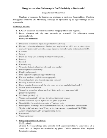 Drogi uczestniku Światowych Dni Młodzieży w Krakowie! Błogosławieni Miłosierni! Niedługo wyruszymy do Krakowa na spotkanie z papieżem Franciszkiem. Wspólnie przeżyjemy Światowe Dni Młodzieży. Dziękuję za zgłoszenie się do tego ważnego dla nas wydarzenia. Informacje bieżące: 1. KAŻDY uczestnik powinien uszanować religijny charakter wyjazdu. 2. Bagaż planujmy tak, aby móc sprawnie go przenosić. Nie zabierajmy rzeczy niepotrzebnych. Rzeczy do zabrania: Dokument tożsamości bądź paszport (obowiązkowo) Plecak z ochronką od deszczu. Ważne jest, by plecak był lekki oraz wystarczająco duży, aby pomieścić wszystko. czego będziesz potrzebował/a podczas tych ŚDM. Karimata Śpiwór Bidon do wody (nie jesteśmy niestety wielbłądami...) Latarkę Ręcznik Kosmetyczkę Wygodne buty do długich wędrówek oraz sandały Płaszcz przeciwdeszczowy Klapki pod prysznic Strój kąpielowy (przyda się pod natryski) Ubrania na słoneczną i deszczową pogodę Czapkę/kapelusz, aby chronić się przed słońcem Okulary przeciwsłoneczne Krem przeciwsłoneczny (chyba nikt z nas nie chce wyglądać jak burak !) Środek przeciw komarom Wszystkie potrzebne lekarstwa (leki. Które stale zażywasz oraz leki przeciwalergiczne) Żel do dezynfekcji rąk Worek na śmieci żeby chronić śpiwór od deszczu i wilgoci Worek na śmieci, by nie wyrzucać ich gdzie popadnie Naklejki/flagi/bransoletki/pamiątki z Twojego kraju Radio (bądź telefon) z zestawem słuchawkowym, aby słuchać tłumaczenia Wydarzeń Centralnych w Waszym języku – nasza częstotliwość 98,5MHz Aparat fotograficzny, aby uwiecznić miłe chwile Rozmówki Wasz uśmiech :-) 3. Plan pielgrzymki do Krakowa: 29.07 – piątek Zbiórka 4.15 na parkingu przy kościele M B Częstochowskiej w Garwolinie, ul. 2 Armii WP 10. Wejście do autokarów wg planu. Odbiór pakietów SDM. Wyjazd. Śniadanie w drodze. Ok. 11.00 – zakwaterowanie na polu namiotowym. Obiad – catering. Wyjazd do Krakowa – każdy autokar osobno – dojazd do Kopca Wandy; następnie linia S1 do Centrum Kongresowego; Opiekunowie w autokarze podzielą osoby niepełnoletnie na grupy; zostanie podany dla wszystkich z obrębu autokaru (pełnoletnich i niepełnoletnich) MEETING POINT w Krakowie, przed wejściem na Błonia. W czasie Drogi Krzyżowej cała grupa autokarowa powinna być razem w jednym miejscu. Co do powrotu – informację przekażą opiekunowie. Ze względu na czas pracy kierowców powrót do pola namiotowego może być późniejszy. Godz. 18.00 - Udział w Drodze Krzyżowej na Błoniach, pod przewodnictwem papieża Franciszka, kartą wstępu jest identyfikator pakietu SDM. Powrót autokarem/ środkiem komunikacji miejskiej do miejsca zakwaterowania ok. 22.00. Nocleg w namiocie. 30.07 – sobota Godz. 7.00 – pobudka. Poranna toaleta. Pakowanie i opuszczamy pole. Wyjazd/wyjście z pola namiotowego godzina 8.00. Powinniśmy dotrzeć do kościoła w parafii Grabie, gdzie o godz. 8.30 będzie Eucharystia, a po niej odbiór pakietów żywnościowych i śniadanie. Pakiet będzie wydany w pudełku tekturowym 32x21x15cm. Powinien zmieścić się w plecakach. Miejscowa ludność zapewnia nas o gorącej herbacie. Będzie to będzie. Po śniadaniu przechodzimy 5 km do sektorów (prawdopodobnie fioletowy). Pozostałe informacje: 1. Zakończyła się rejestracja w systemie krakowskim. Zostały utworzone dwie grupy – Grupa „Miętne” P-1930-PL-5255 w liczbie 150 osób i Grupa „Kolegiata” P-1930PL-5254 w liczbie 122 osób. Dołącza jeszcze grupa Last Minute - 8 osoby (P-962200-LM-17991) Łącznie będzie pielgrzymowało z nami 280 zarejestrowanych pielgrzymów oraz 1 uczestnik zgłoszony jako „dziecko”. 2. Będziemy podróżować autokarami z firm transportowych p. Grzegorza Wierzbickiego (3 autokary) i p. Romana Chudka (2 autokary). 3. W każdym autokarze jest kapłan oraz opiekunowie. Ważne! Nie ma możliwości zmian między autokarami! Grupa została podzielona w następujący sposób: Grupa dekanatu garwolińskiego – ośrodek MIĘTNE Główny odpowiedzialny – Ks. Kamil Duszek, tel. 509013414 Zastępca odpowiedzialnego – ks. Grzegorz Osipacz, tel. 663744402 P-1930-PL-5255 (MTN) Autokar: Miętne (firma transportowa Roman Chudek) A Łącznie w autokarze A: 1. 2. 3. 4. 5. 6. 72 osoby Imię i nazwisko ID Ks. Duszek Kamil Rulak Izabela Miętus Patrycja Mucha Maciej Boratyńska Weronika Chodak Franciszek MTN MTN MTN MTN MTN MTN wiek 26 20 23 20 20 14 Imię i nazwisko 7. 8. 9. 10. 11. 12. 13. 14. 15. 16. 17. 18. 19. 20. 21. 22. 23. 24. 25. 26. 27. 28. 29. 30. 31. 32. 33. 34. 35. 36. 37. 38. 39. 40. 41. 42. 43. 44. 45. 46. 47. 48. 49. 50. 51. 52. 53. 54. 55. 56. 57. 58. Chodak Zuzanna Gajaszek Aleksandra Gajaszek Małgorzata Gora Agnieszka Gora Anna Gora Kinga Górska Gabriela Gruszczyńska Monika Grzegrzółka Marcin Gugała Alicja Kamińska Kinga Kocon Dorota Kocyk Wiktoria Konieczny Piotr Kot Anna Kot Grzegorz Kot Katarzyna Królikowska Marta Królikowski Piotr Kuszpit Kamil Kuszpit Michał Mantryba Kamil Mazur Piotr Michalczyk Hubert Michalczyk Natalia Miętus Katarzyna Miętus Wiktoria Mikulska Karolina, Garwolin Mikulska Karolina, Niecieplin Mucha Agnieszka Mucha Anna, Garwolin Mucha Anna, Miętne Mucha Wiktoria Przybysz Małgorzata Przybysz Michał Rosłaniec Katarzyna Rulak Paweł Rusznica Paweł Salwa Natalia Sekuła Paulina Stanieta Aleksandra Syga Monika Szczypek Mateusz Szostak Anna Szostak Monika Trzcińska Nina Wawer Paulina Wawrzyniak Zofia Wielgosz Paulina Winek Aleksandra Wirtek Karolina Wirtek Katarzyna ID MTN MTN MTN MTN MTN MTN MTN MTN MTN MTN MTN MTN MTN MTN MTN MTN MTN MTN MTN MTN MTN MTN MTN MTN MTN MTN MTN MTN MTN MTN MTN MTN MTN MTN MTN MTN MTN MTN MTN MTN MTN MTN MTN MTN MTN MTN MTN MTN MTN MTN MTN MTN wiek 18 25 31 18 23 21 16 17 20 15 18 24 15 22 17 19 18 16 14 16 18 18 16 20 15 16 16 16 18 21 18 14 17 15 13 17 14 22 17 16 21 25 19 15 19 14 17 14 23 14 21 20 Imię i nazwisko 59. 60. 61. 62. 63. 64. 65. 66. 67
