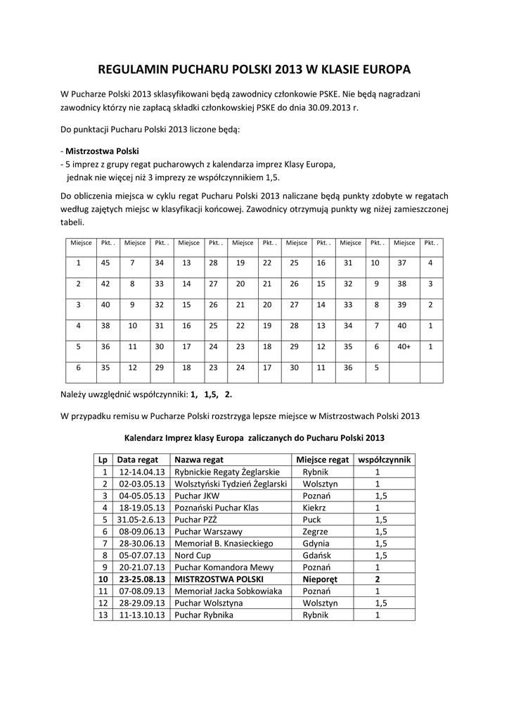 REGULAMIN PUCHARU POLSKI 2013 W KLASIE EUROPA W Pucharze Polski 2013 sklasyfikowani będą zawodnicy członkowie PSKE. Nie będą nagradzani zawodnicy którzy nie zapłacą składki członkowskiej PSKE do dnia 30.09.2013 r. Do punktacji Pucharu Polski 2013 liczone będą: - Mistrzostwa Polski - 5 imprez z grupy regat pucharowych z kalendarza imprez Klasy Europa, jednak nie więcej niż 3 imprezy ze współczynnikiem 1,5. Do obliczenia miejsca w cyklu regat Pucharu Polski 2013 naliczane będą punkty zdobyte w regatach według zajętych miejsc w klasyfikacji końcowej. Zawodnicy otrzymują punkty wg niżej zamieszczonej tabeli. Miejsce Pkt. . Miejsce Pkt. . Miejsce Pkt. . Miejsce Pkt. . Miejsce Pkt. . Miejsce Pkt. . Miejsce Pkt. . 1 45 7 34 13 28 19 22 25 16 31 10 37 4 2 42 8 33 14 27 20 21 26 15 32 9 38 3 3 40 9 32 15 26 21 20 27 14 33 8 39 2 4 38 10 31 16 25 22 19 28 13 34 7 40 1 5 36 11 30 17 24 23 18 29 12 35 6 40+ 1 6 35 12 29 18 23 24 17 30 11 36 5 Należy uwzględnić współczynniki: 1, 1,5, 2. W przypadku remisu w Pucharze Polski rozstrzyga lepsze miejsce w Mistrzostwach Polski 2013 Kalendarz Imprez klasy Europa zaliczanych do Pucharu Polski 2013 Lp Data regat 1 12-14.04.13 2 02-03.05.13 3 04-05.05.13 4 18-19.05.13 5 31.05-2.6.13 6 08-09.06.13 7 28-30.06.13 8 05-07.07.13 9 20-21.07.13 10 23-25.08.13 11 07-08.09.13 12 28-29.09.13 13 11-13.10.13 Nazwa regat Miejsce regat współczynnik Rybnickie Regaty Żeglarskie Rybnik 1 Wolsztyński Tydzień Żeglarski Wolsztyn 1 Puchar JKW Poznań 1,5 Poznański Puchar Klas Kiekrz 1 Puchar PZŻ Puck 1,5 Puchar Warszawy Zegrze 1,5 Memoriał B. Knasieckiego Gdynia 1,5 Nord Cup Gdańsk 1,5 Puchar Komandora Mewy Poznań 1 MISTRZOSTWA POLSKI Nieporęt 2 Memoriał Jacka Sobkowiaka Poznań 1 Puchar Wolsztyna Wolsztyn 1,5 Puchar Rybnika Rybnik 1 W Pucharze Polski 2013 w klasie Europa nagradzane będą: - miejsca 1 – 6 w klasyfikacji open - miejsce 1 w klasyfikacji juniorek - miejsce 1 w klasyfikacji juniorów - miejsce 1 w klasyfikacji zespołowej Imprezy eliminacyjne do imprez głównych: Do Mistrzostw Świata: 1. Puchar Polski 2012 (jako jedna impreza) 2. Wolsztyński Tydzień Żeglarski 3. Puchar PZŻ 4. Timberland Nord Cup Liczą się 3 z 4 imprez eliminacyjnych. Do Mistrzostw Europy Juniorów: 1. Puchar Polski 2012 (jako jedna impreza) 2. Puchar JKW 3. Puchar PZŻ 4. Timberland Nord Cup Liczą się 3 z 4 imprez