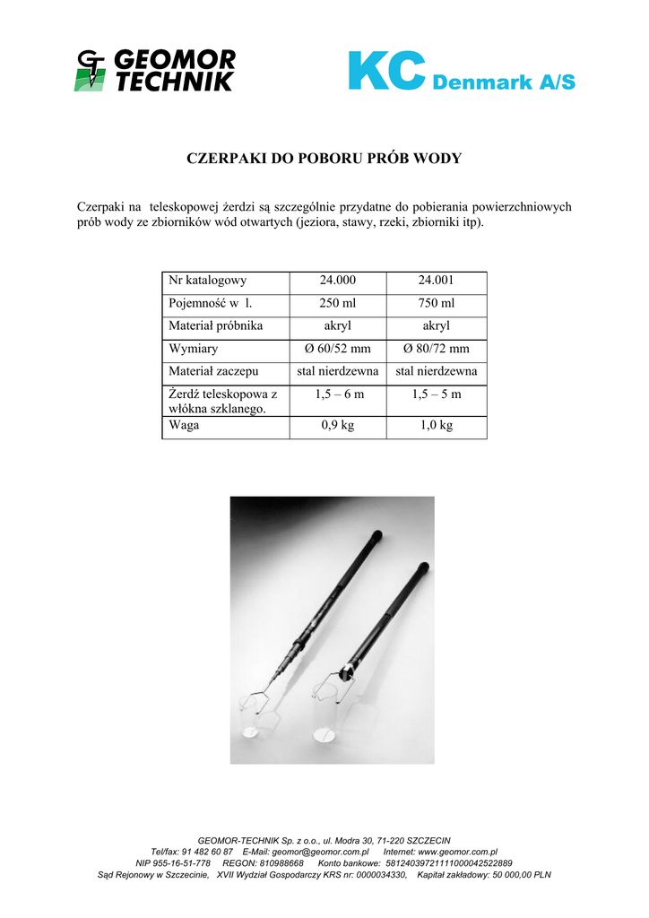 CZERPAKI DO POBORU PRÓB WODY Czerpaki na teleskopowej żerdzi są szczególnie przydatne do pobierania powierzchniowych prób wody ze zbiorników wód otwartych (jeziora, stawy, rzeki, zbiorniki itp). Nr katalogowy 24.000 24.001 Pojemność w l. 250 ml 750 ml akryl akryl Ø 60/52 mm Ø 80/72 mm stal nierdzewna stal nierdzewna 1,5 – 6 m 1,5 – 5 m 0,9 kg 1,0 kg Materiał próbnika Wymiary Materiał zaczepu Żerdź teleskopowa z włókna szklanego. Waga GEOMOR-TECHNIK Sp. z o.o., ul. Modra 30, 71-220 SZCZECIN Tel/fax: 91 482 60 87 E-Mail: [email protected] Internet: www.geomor.com.pl NIP 955-16-51-778 REGON: 810988668 Konto bankowe: 58124039721111000042522889 Sąd Rejonowy w Szczecinie, XVII Wydział Gospodarczy KRS nr: 0000034330, Kapitał zakładowy: 50 000,00 PLN
