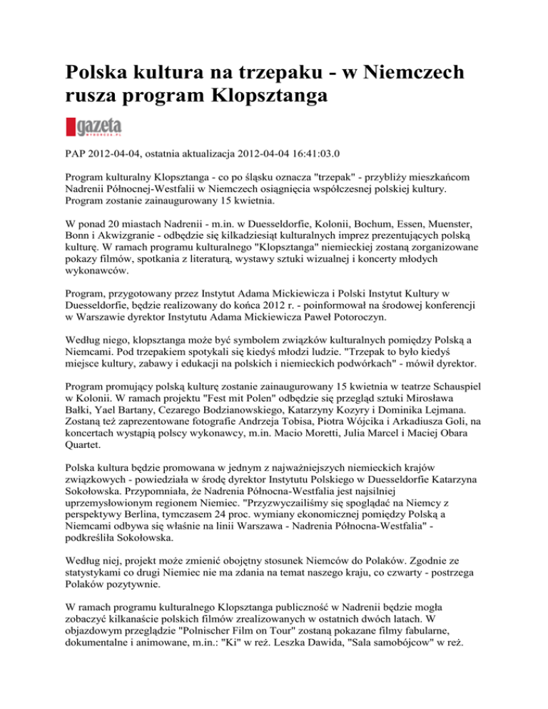 kulturę. W ramach programu kulturalnego "Klopsztanga" niemieckiej zostaną zorganizowane