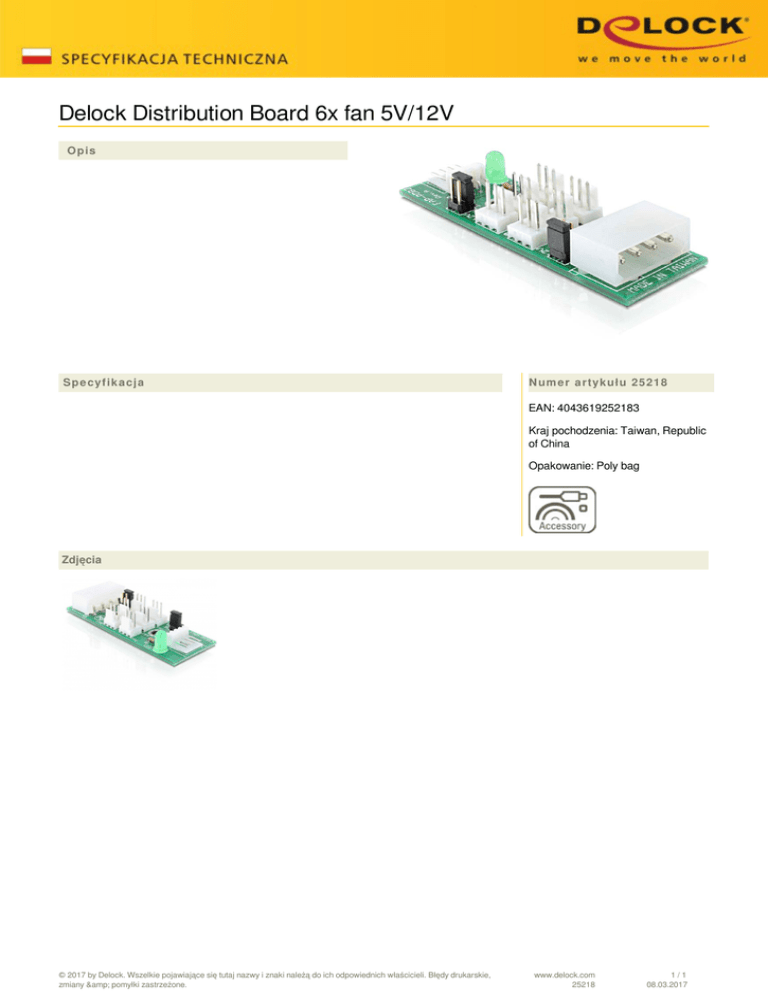 Delock Distribution Board 6x fan 5V/12V Opis Specyfikacja Numer artykułu 25218 EAN: 4043619252183 Kraj pochodzenia: Taiwan, Republic of China Opakowanie: Poly bag Zdjęcia © 2017 by Delock. Wszelkie pojawiające się tutaj nazwy i znaki należą do ich odpowiednich właścicieli. Błędy drukarskie, zmiany & pomyłki zastrzeżone. Powered by TCPDF (www.tcpdf.org) www.delock.com 25218 1/1 08.03.2017