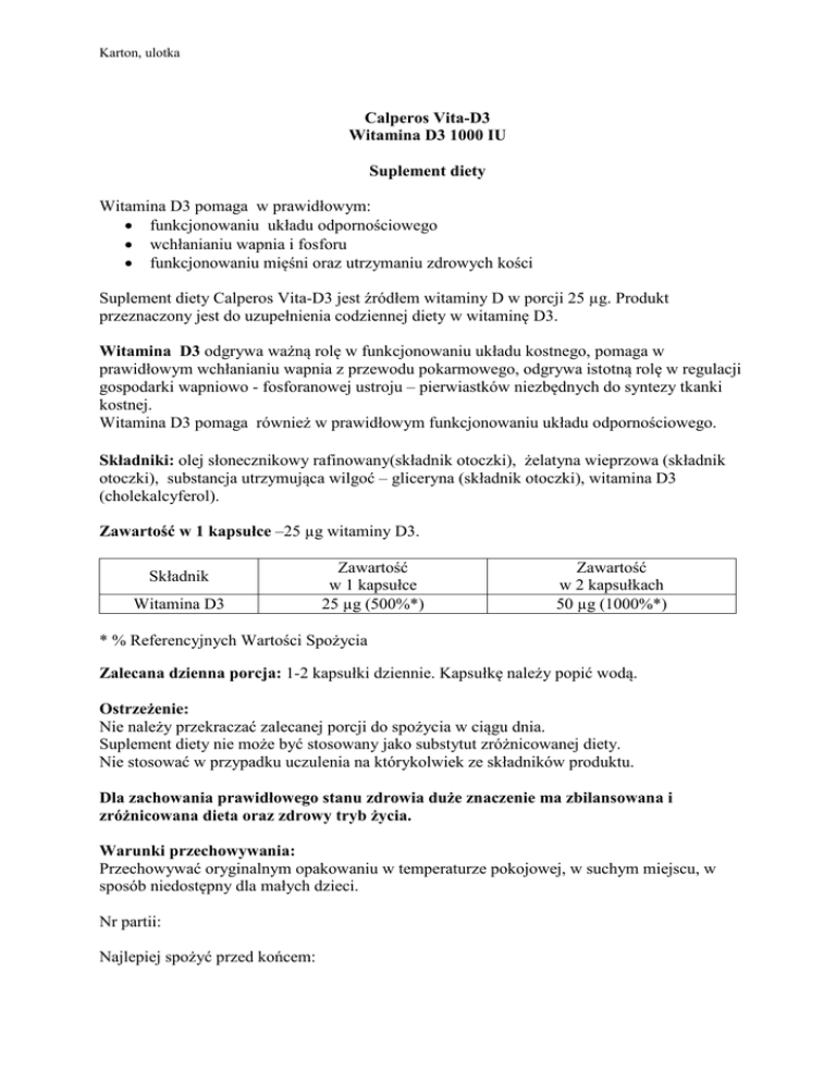 Karton, ulotka Calperos Vita-D3 Witamina D3 1000 IU Suplement diety Witamina D3 pomaga w prawidłowym: • funkcjonowaniu układu odpornościowego • wchłanianiu wapnia i fosforu • funkcjonowaniu mięśni oraz utrzymaniu zdrowych kości Suplement diety Calperos Vita-D3 jest źródłem witaminy D w porcji 25 µg. Produkt przeznaczony jest do uzupełnienia codziennej diety w witaminę D3. Witamina D3 odgrywa ważną rolę w funkcjonowaniu układu kostnego, pomaga w prawidłowym wchłanianiu wapnia z przewodu pokarmowego, odgrywa istotną rolę w regulacji gospodarki wapniowo - fosforanowej ustroju – pierwiastków niezbędnych do syntezy tkanki kostnej. Witamina D3 pomaga również w prawidłowym funkcjonowaniu układu odpornościowego. Składniki: olej słonecznikowy rafinowany(składnik otoczki), żelatyna wieprzowa (składnik otoczki), substancja utrzymująca wilgoć – gliceryna (składnik otoczki), witamina D3 (cholekalcyferol). Zawartość w 1 kapsułce –25 µg witaminy D3. Składnik Witamina D3 Zawartość w 1 kapsułce 25 µg (500%*) Zawartość w 2 kapsułkach 50 µg (1000%*) * % Referencyjnych Wartości Spożycia Zalecana dzienna porcja: 1-2 kapsułki dziennie. Kapsułkę należy popić wodą. Ostrzeżenie: Nie należy przekraczać zalecanej porcji do spożycia w ciągu dnia. Suplement diety nie może być stosowany jako substytut zróżnicowanej diety. Nie stosować w przypadku uczulenia na którykolwiek ze składników produktu. Dla zachowania prawidłowego stanu zdrowia duże znaczenie ma zbilansowana i zróżnicowana dieta oraz zdrowy tryb życia. Warunki przechowywania: Przechowywać oryginalnym opakowaniu w temperaturze pokojowej, w suchym miejscu, w sposób niedostępny dla małych dzieci. Nr partii: Najlepiej spożyć przed końcem: Karton, ulotka Zawartość: 60 kapsułek 120 kapsułek Teva Operations Poland Sp. z. o.o., ul. Emilii Plater 53, 00-113 Warszawa