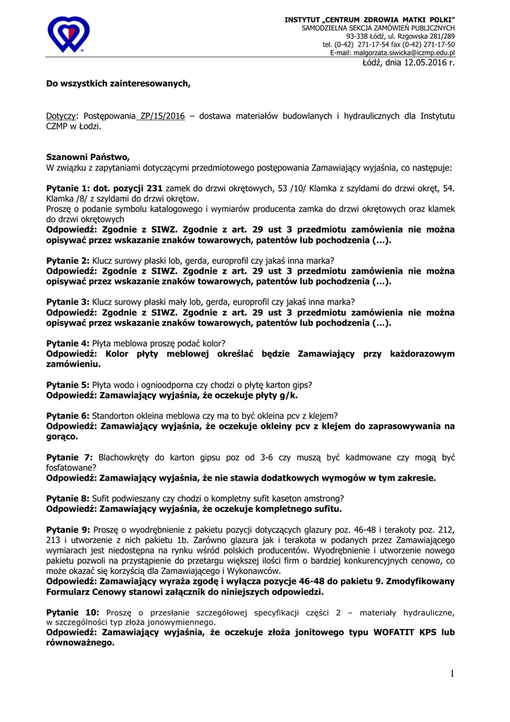 INSTYTUT „CENTRUM ZDROWIA MATKI POLKI” SAMODZIELNA SEKCJA ZAMÓWIEŃ PUBLICZNYCH 93-338 Łódź, ul. Rzgowska 281/289 tel. (0-42) 271-17-54 fax (0-42) 271-17-50 E-mail: [email protected] Łódź, dnia 12.05.2016 r. Do wszystkich zainteresowanych, Dotyczy: Postępowania ZP/15/2016 – dostawa materiałów budowlanych i hydraulicznych dla Instytutu CZMP w Łodzi. Szanowni Państwo, W związku z zapytaniami dotyczącymi przedmiotowego postępowania Zamawiający wyjaśnia, co następuje: Pytanie 1: dot. pozycji 231 zamek do drzwi okrętowych, 53 /10/ Klamka z szyldami do drzwi okręt, 54. Klamka /8/ z szyldami do drzwi okrętow. Proszę o podanie symbolu katalogowego i wymiarów producenta zamka do drzwi okrętowych oraz klamek do drzwi okrętowych Odpowiedź: Zgodnie z SIWZ. Zgodnie z art. 29 ust 3 przedmiotu zamówienia nie można opisywać przez wskazanie znaków towarowych, patentów lub pochodzenia (…). Pytanie 2: Klucz surowy płaski lob, gerda, europrofil czy jakaś inna marka? Odpowiedź: Zgodnie z SIWZ. Zgodnie z art. 29 ust 3 przedmiotu zamówienia nie można opisywać przez wskazanie znaków towarowych, patentów lub pochodzenia (…). Pytanie 3: Klucz surowy płaski mały lob, gerda, europrofil czy jakaś inna marka? Odpowiedź: Zgodnie z SIWZ. Zgodnie z art. 29 ust 3 przedmiotu zamówienia nie można opisywać przez wskazanie znaków towarowych, patentów lub pochodzenia (…). Pytanie 4: Płyta meblowa proszę podać kolor? Odpowiedź: Kolor płyty meblowej określać będzie Zamawiający przy każdorazowym zamówieniu. Pytanie 5: Płyta wodo i ognioodporna czy chodzi o płytę karton gips? Odpowiedź: Zamawiający wyjaśnia, że oczekuje płyty g/k. Pytanie 6: Standorton okleina meblowa czy ma to być okleina pcv z klejem? Odpowiedź: Zamawiający wyjaśnia, że oczekuje okleiny pcv z klejem do zaprasowywania na gorąco. Pytanie 7: Blachowkręty do karton gipsu poz od 3-6 czy muszą być kadmowane czy mogą być fosfatowane? Odpowiedź: Zamawiający wyjaśnia, że nie stawia dodatkowych wymogów w tym zakresie. Pytanie 8: Sufit podwieszany czy chodzi o kompletny sufit kaseton amstrong? Odpowiedź: Zamawiający wyjaśnia, że oczekuje kompletnego sufitu. Pytanie 9: Proszę o wyodrębnienie z pakietu pozycji dotyczących glazury poz. 46-48 i terakoty poz. 212, 213 i utworzenie z nich pakietu 1b. Zarówno glazura jak i terakota w podanych przez Zamawiającego wymiarach jest niedostępna na rynku wśród polskich producentów. Wyodrębnienie i utworzenie nowego pakietu pozwoli na przystąpienie do przetargu większej ilości firm o bardziej konkurencyjnych cenowo, co może okazać się korzyścią dla Zamawiającego i Wykonawców. Odpowiedź: Zamawiający wyraża zgodę i wyłącza pozycje 46-48 do pakietu 9. Zmodyfikowany Formularz Cenowy stanowi załącznik do niniejszych odpowiedzi. Pytanie 10: Proszę o przesłanie szczegółowej specyfikacji części 2 – materiały hydrauliczne, w szczególności typ złoża jonowymiennego. Odpowiedź: Zamawiający wyjaśnia, że oczekuje złoża jonitowego typu WOFATIT KPS lub równoważnego. 1 Pytanie 11: Dot. poz. 256 (obecnie 253) Sufit podwieszany typu kasetonowego z karton-gipsu lub wełny mineralnej prasowanej, kompletny ognioodporny. Proszę o podanie klasy ognioodporności. Odpowiedź: Zamawiający wyjaśnia, że oczekuje Sufit podwieszany typu kasetonowego z karton-gipsu lub wełny mineralnej prasowanej, kompletny niepalnego bez klasy odporności ogniowej. Integralnymi załącznikami do niniejszych odpowiedzi są: - Zmieniony Załącznik nr 2 do SIWZ Formularz Cenowy - Ogłoszenie o zmianie ogłoszenia Jednocześnie Zamawiający informuje o zmianie SIWZ w następującym zakresie: § 57 Było: Ofertę należy złożyć w Samodzielnej Sekcji Zamówień Publicznych Instytutu „Centrum Zdrowia Matki Polki”,93-338 Łódź ul. Rzgowska 281/289, pawilon„A” (Ginekologiczno-Położniczy), poziom „0”, pok. Nr 15 do dnia 17.05.2016 r. do godz. 10:00. Jest: Ofertę należy złożyć w Samodzielnej Sekcji Zamówień Publicznych Instytutu „Centrum Zdrowia Matki Polki”,93-338 Łódź ul. Rzgowska 281/289, pawilon„A” (Ginekologiczno-Położniczy), poziom „0”, pok. Nr 15 do dnia 24.05.2016 r. do godz. 10:00. § 60 Było: Otwarcie Ofert nastąpi w Samodzielnej Sekcji Zamówień Publicznych Instytutu „Centrum Zdrowia Matki Polki”, 93-338 Łódź ul. Rzgowska 281/289, pawilon „A” (Ginekologiczno-Położniczy), poziom „0”,pokój Nr 15, w dniu 17.05.2016 r. o godz. 10:15. Jest: Otwarcie Ofert nastąpi w Samodzielnej Sekcji Zamówień Publicznych Instytutu „Centrum Zdrowia Matki Polki”, 93-338 Łódź ul. Rzgowska 281/289, pawilon „A” (Ginekologiczno-Położniczy), poziom „0”,pokój Nr 15, w dniu 24.05.2016 r. o godz. 10:15. Wersja elektroniczna dokumentu. Dokument podpisany w oryginale przez Zastępcę Dyrektora ds. Administracji i Rozwoju – dr Pawła Grockiego z upoważnienia Dyrektora Instytutu prof. dr hab. n. med. Macieja Banacha 2