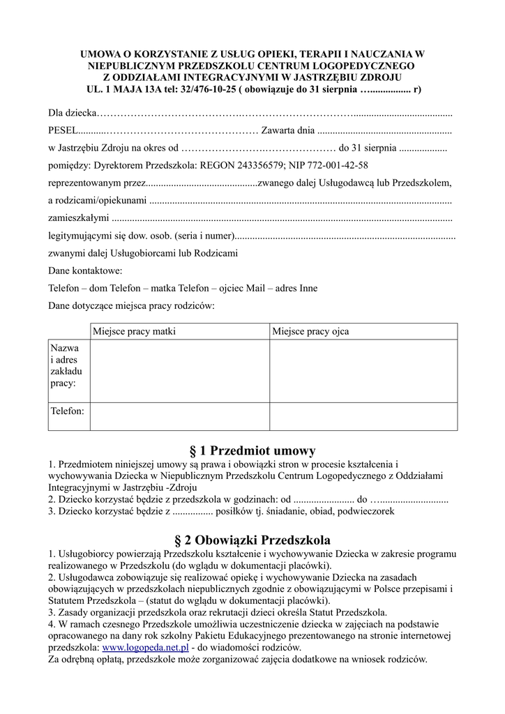 UMOWA O KORZYSTANIE Z USŁUG OPIEKI, TERAPII I NAUCZANIA W NIEPUBLICZNYM PRZEDSZKOLU CENTRUM LOGOPEDYCZNEGO Z ODDZIAŁAMI INTEGRACYJNYMI W JASTRZĘBIU ZDROJU UL. 1 MAJA 13A tel: 32/476-10-25 ( obowiązuje do 31 sierpnia …................ r) Dla dziecka…………………………………….……………………………....................................... PESEL...........……………………………………… Zawarta dnia ..................................................... w Jastrzębiu Zdroju na okres od …………………….………………… do 31 sierpnia ................... pomiędzy: Dyrektorem Przedszkola: REGON 243356579; NIP 772-001-42-58 reprezentowanym przez............................................zwanego dalej Usługodawcą lub Przedszkolem, a rodzicami/opiekunami ....................................................................................................................... zamieszkałymi ...................................................................................................................................... legitymującymi się dow. osob. (seria i numer)....................................................................................... zwanymi dalej Usługobiorcami lub Rodzicami Dane kontaktowe: Telefon – dom Telefon – matka Telefon – ojciec Mail – adres Inne Dane dotyczące miejsca pracy rodziców: Miejsce pracy matki Miejsce pracy ojca Nazwa i adres zakładu pracy: Telefon: § 1 Przedmiot umowy 1. Przedmiotem niniejszej umowy są prawa i obowiązki stron w procesie kształcenia i wychowywania Dziecka w Niepublicznym Przedszkolu Centrum Logopedycznego z Oddziałami Integracyjnymi w Jastrzębiu -Zdroju 2. Dziecko korzystać będzie z przedszkola w godzinach: od ........................ do …........................... 3. Dziecko korzystać będzie z ................ posiłków tj. śniadanie, obiad, podwieczorek § 2 Obowiązki Przedszkola 1. Usługobiorcy powierzają Przedszkolu kształcenie i wychowywanie Dziecka w zakresie programu realizowanego w Przedszkolu (do wglądu w dokumentacji placówki). 2. Usługodawca zobowiązuje się realizować opiekę i wychowywanie Dziecka na zasadach obowiązujących w przedszkolach niepublicznych zgodnie z obowiązującymi w Polsce przepisami i Statutem Przedszkola – (statut do wglądu w dokumentacji placówki). 3. Zasady organizacji przedszkola oraz rekrutacji dzieci określa Statut Przedszkola. 4. W ramach czesnego Przedszkole umożliwia uczestniczenie dziecka w zajęciach na podstawie opracowanego na dany rok szkolny Pakietu Edukacyjnego prezentowanego na stronie internetowej przedszkola: www.logopeda.net.pl - do wiadomości rodziców. Za odrębną opłatą, przedszkole może zorganizować zajęcia dodatkowe na wniosek rodziców. 5. Usługodawca zobowiązuje się w prowadzonym przedszkolu do: a. tworzenia warunków do wyrównywania deficytów rozwojowych i wspierania rozwoju osobowości dziecka poprzez zorganizowanie zajęć i zabaw w oparciu o program autorski, wykraczających poza podstawę programową; b. zapewnienia bezpieczeństwa dziecka w czasie zajęć przedszkolnych; c. zapewnienia stałej dostępności rodziców do kadry pedagogicznej, dyrektora i właścicieli placówki (w godzinach pracy); d. realizowania indywidualnego podejścia do dziecka, indywidualnego doboru programu wspomagającego potrzeby i talenty dziecka i w tym zakresie – do współpracy z Rodzicami. § 3 Obowiązki Usługobiorców 1. W celu umożliwienia prawidłowej opieki przedszkolnej nad dzieckiem, Usługobiorcy zobowiązują się w szczególności do: a. twórczej współpracy z kadrą pedagogiczną w zakresie ustalania i prowadzenia programu opieki nad dzieckiem; b. przyprowadzania i odbierania dziecka w godzinach pracy przedszkola określonych w Statucie; c. natychmiastowego odbioru dziecka w przypadku stwierdzenia jego choroby; d. nie przyprowadzania dziecka chorego do przedszkola. 2. Usługobiorcy oświadczają, że każde z nich uprawnione jest do składania wiążących dla Przedszkola oświadczeń w zakresie realizacji niniejszej Umowy, jej zakończenia oraz wszelkich kwestii związanych z opieką nad dzieckiem. Jednocześnie Usługobiorcy akceptują, że jakiekolwiek oświadczenie przedszkola kierowane do jednego z nich ma skutek taki, jakby było jednocześnie kierowane do obojga rodziców. 3. Usługobiorcy wyrażają zgodę na publikowanie na stronie internetowej zdjęć z życia przedszkola mogących przedstawiać sylwetkę lub twarz dziecka Usługobiorców, z zastrzeżeniem, iż Przedszkole zobowiązuje się bez zbędnej zwłoki usunąć konkretnie wskazane zdjęcia w przypadku, gdy którykolwiek z Rodziców dziecka zgłosi pisemnie takie żądanie. 4. Usługobiorcy wyrażają zgodę na wykorzystanie zdjęć z życia przedszkola mogących przedstawiać sylwetkę lub twarz dziecka do opracowania materiałów reklamowych przedszkola, z zastrzeżeniem, iż Przedszkole przed zleceniem materiałów do druku/publikacji skonsultuje konkretne zdjęcia przynajmniej z jednym z Rodziców, a ten nie cofnie pisemnie uprzednio wyrażonej zgody. 5. Usługobiorcy zobowiązani są do niezwłocznego zgłoszenia zmian danych identyfikacyjnych (dowód tożsamości, aktualny numer telefonu oraz osób uprawnionych do odbioru dziecka z przedszkola). § 4 Opłaty 1. Usługi świadczone przez Usługodawcę w ramach przedszkola są odpłatne i wynoszą: a. Dla Dzieci posiadające orzeczenie przedszkole jest bezpłatne ( bez czesnego i wpisowego ). b. Wpisowe w kwocie – 300 PLN – płatne jednorazowo przy zawarciu niniejszej Umowy; c. Stałe czesne za każdy miesiąc realizacji Umowy (bez względu na ilości dni w miesiącu) płatne do 5 - tego dnia każdego miesiąca z góry w wysokości: * 400zł - dla dziecka przebywającego w przedszkolu przez 8 godzin dziennie; * 360zł - dla dziecka przebywającego w przedszkolu przez 7 godzin dziennie; * 320zł - dla dziecka przebywającego w przedszkolu prz