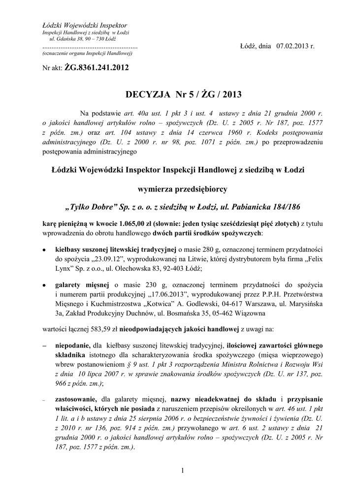 Łódzki Wojewódzki Inspektor Inspekcji Handlowej z siedzibą w Łodzi ul. Gdańska 38, 90 – 730 Łódź Łódź, dnia 07.02.2013 r. ..................................................... (oznaczenie organu Inspekcji Handlowej) Nr akt: ŻG.8361.241.2012 DECYZJA Nr 5 / ŻG / 2013 Na podstawie art. 40a ust. 1 pkt 3 i ust. 4 ustawy z dnia 21 grudnia 2000 r. o jakości handlowej artykułów rolno – spożywczych (Dz. U. z 2005 r. Nr 187, poz. 1577 z późn. zm.) oraz art. 104 ustawy z dnia 14 czerwca 1960 r. Kodeks postępowania administracyjnego (Dz. U. z 2000 r. nr 98, poz. 1071 z późn. zm.) po przeprowadzeniu postępowania administracyjnego Łódzki Wojewódzki Inspektor Inspekcji Handlowej z siedzibą w Łodzi wymierza przedsiębiorcy „Tylko Dobre” Sp. z o. o. z siedzibą w Łodzi, ul. Pabianicka 184/186 karę pieniężną w kwocie 1.065,00 zł (słownie: jeden tysiąc sześćdziesiąt pięć złotych) z tytułu wprowadzenia do obrotu handlowego dwóch partii środków spożywczych: kiełbasy suszonej litewskiej tradycyjnej o masie 280 g, oznaczonej terminem przydatności do spożycia „23.09.12”, wyprodukowanej na Litwie, której dystrybutorem była firma „Felix Lynx” Sp. z o.o., ul. Olechowska 83, 92-403 Łódź; galarety mięsnej o masie 230 g, oznaczonej terminem przydatności do spożycia i numerem partii produkcyjnej „17.06.2013”, wyprodukowanej przez P.P.H. Przetwórstwa Mięsnego i Kuchmistrzostwa „Kotwica” A. Godlewski, 04-617 Warszawa, ul. Marysińska 3a, Zakład Produkcyjny Duchnów, ul. Bosmańska 35, 05-462 Wiązowna wartości łącznej 583,59 zł nieodpowiadających jakości handlowej z uwagi na: niepodanie, dla kiełbasy suszonej litewskiej tradycyjnej, ilościowej zawartości głównego składnika istotnego dla scharakteryzowania środka spożywczego (mięsa wieprzowego) wbrew postanowieniom § 9 ust. 1 pkt 3 rozporządzenia Ministra Rolnictwa i Rozwoju Wsi z dnia 10 lipca 2007 r. w sprawie znakowania środków spożywczych (Dz. U. nr 137, poz. 966 z późn. zm.); zastosowanie, dla galarety mięsnej, nazwy nieadekwatnej do składu i przypisanie właściwości, których nie posiada z naruszeniem przepisów określonych w art. 46 ust. 1 pkt 1 lit. a i b ustawy z dnia 25 sierpnia 2006 r. o bezpieczeństwie żywności i żywienia (Dz. U. z 2010 r. nr 136, poz. 914 z późn. zm.) przywołanego w art. 6 ust. 2 ustawy z dnia 21 grudnia 2000 r. o jakości handlowej artykułów rolno – spożywczych (Dz. U. z 2005 r. Nr 187, poz. 1577 z późn. zm.). 1 Uzasadnienie W dniach od 20 do 24 sierpnia 2012 r. na podstawie upoważnienia Łódzkiego Wojewódzkiego Inspektora Inspekcji Handlowej numer ŻG.8361.241.2012 z dnia 20.08.2012 r. inspektorzy Wojewódzkiego Inspektoratu Inspekcji Handlowej w Łodzi przeprowadzili kontrolę w sklepie spożywczym „Sklep z prawdziwym jedzeniem” zlokalizowanym w Łodzi przy ul. Pomorskiej 4, należącym do „Tylko Dobre” Sp. z o.o. z siedzibą w Łodzi, ul. Pabianicka 184/186. Kontrolę przeprowadzono na podstawie przepisów art. 3 ust. 1 - 3 rozporządzenia Parlamentu Europejskiego i Rady (WE) Nr 882/2004 z dnia 29 kwietnia 2004 r. w sprawie kontroli urzędowych przeprowadzanych w celu sprawdzenia zgodności z prawem paszowym i żywnościowym oraz regułami dotyczącymi zdrowia zwierząt i dobrostanu zwierząt (Dz. U. L 165 z 30.4.2004 ze zm.), art. 17 ust. 3 ustawy z dnia 21 grudnia 2000 r. o jakości handlowej artykułów rolno-spożywczych (Dz. U. z 2005 r. nr 187, poz. 1577 z późn. zm.), art. 3 ust. 1 pkt 1, 2 i 6 ustawy z dnia 15 grudnia 2000 r. o Inspekcji Handlowej (Dz. U. z 2009 r. Nr 151, poz. 1219 z późn. zm.) w obecności Prezesa zarządu (…). W trakcie prowadzonych działań kontrolnych stwierdzono, że w obrocie handlowym znajdowały się 2 partie przetworów mięsnych: 27 opakowań kiełbasy suszonej litewskiej tradycyjnej o masie 280 g, oznaczonej terminem przydatności do spożycia „23.09.12”, wyprodukowanej na Litwie, której dystrybutorem była firma „Felix Lynx” Sp. z o.o., ul. Olechowska 83, 92-403 Łódź w cenie 17,99 zł za jedno opakowanie, 14 opakowań galarety mięsnej o masie 230 g, oznaczonej terminem przydatności do spożycia i numerem partii produkcyjnej „17.06.2013”, wyprodukowanej przez P.P.H. Przetwórstwa Mięsnego i Kuchmistrzostwa „Kotwica” A. Godlewski, 04-617 Warszawa, ul. Marysińska 3a, Zakład Produkcyjny Duchnów, ul. Bosmańska 35, 05-462 Wiązowna w cenie 6,99 zł za jedno opakowanie wartości łącznej 583,59 zł, oznakowanych niezgodnie z przepisami prawa żywnościowego. Na opakowaniach jednostkowych: kiełbasy suszonej litewskiej tradycyjnej nie podano ilościowej zawartości głównego składnika istotnego dla scharakteryzowania środka spożywczego (wieprzowiny) wbrew postanowieniom § 9 ust. 1 pkt 3 rozporządzenia Ministra Rolnictwa i Rozwoju Wsi z dnia 10 lipca 2007 r. w sprawie znakowania środków spożywczych (Dz. U. nr 137, poz. 966 z późn. zm.) zwanego dalej „rozporządzeniem w sprawie znakowania środków spożywczych”, galarety mięsnej zastosowano nazwę nieadekwatną do składu oraz przypisano jej właściwości których nie posiadała (produkt bez konserwantów), co narusza art. 46 ust. 1 pkt 1 lit. a i b ustawy z dnia 25 sierpnia 2006 r. o bezpieczeństwie żywności i żywienia (Dz. U. z 2010 r. nr 136, poz. 914 z późn. zm.) zwanej dalej „ustawą o bezpieczeństwie żywności i żywienia” przywołany w art. 6 ust. 2 ustawy z dnia 21 grudnia 2000 r. o jakości handlowej 2 artykułów rolno – spożywczych (Dz. U. z 2005 r. Nr 187, poz. 1577 z późn. zm.) zwanej dalej „ustawą o jakości”. W wyniku dokonanych oględzin opakowań jednostkowych stwierdzono, że przedmiotowa galareta w swoim składzie zawierała między innymi mięso wieprzowe powyżej 50% (golonka, ozorek, głowizna) oraz peklosól. Zatem zastosowana nazwa „galareta mięsna” była nieadekwatna do składu i wprowadzała konsumenta w błąd, gdyż zgo