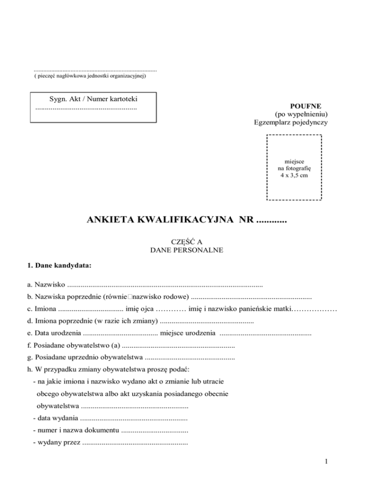 ............................................................................. ( pieczęć nagłówkowa jednostki organizacyjnej) Sygn. Akt / Numer kartoteki ..................................................... POUFNE (po wypełnieniu) Egzemplarz pojedynczy miejsce na fotografię 4 x 3,5 cm ANKIETA KWALIFIKACYJNA NR ............ CZĘŚĆ A DANE PERSONALNE 1. Dane kandydata: a. Nazwisko ...................................................................................................... b. Nazwiska poprzednie (również nazwisko rodowe) ............................................................... c. Imiona .................................. imię ojca ………… imię i nazwisko panieńskie matki……………… d. Imiona poprzednie (w razie ich zmiany) ................................................. e. Data urodzenia ....................................... miejsce urodzenia ................................................ f. Posiadane obywatelstwo (a) ........................................................... g. Posiadane uprzednio obywatelstwa ............................................... h. W przypadku zmiany obywatelstwa proszę podać: - na jakie imiona i nazwisko wydano akt o zmianie lub utracie obcego obywatelstwa albo akt uzyskania posiadanego obecnie obywatelstwa ........................................................ - data wydania ........................................................ - numer i nazwa dokumentu ................................... - wydany przez ....................................................... 1 i. Dowód osobisty: seria i numer ........................................................ wydany przez ............................................................................ data wydania ............................................................................. j. Nr PESEL ........................................................................................ k. Numer Identyfikacji Podatkowej (NIP) ......................................... l. Posiadany stopień wojskowy .......................................................... ł. Seria i nr książeczki wojskowej ...................................................... - wydana przez ....................................................................... - data wydania ......................................................................... m. Aktualne miejsce zamieszkania (zameldowanie na pobyt stały) .......................................................................................................................................................... (państwo, miasto, ulica, nr domu, nr mieszkania, kod pocztowy, nr telefonu domowego ) .......................................................................................................................................................... n. Aktualny adres pobytu czasowego (jeżeli inny niż w pkt 1 lit. m) . .......................................................................................................................................................... (państwo, miasto, ulica, nr domu, nr mieszkania, kod pocztowy, nr telefonu domowego ) .......................................................................................................................................................... o. Paszport: seria i nr ....................................................... wydany przez ............................................................... termin ważności: .......................................................... p. Aktualne miejsce (a) pracy, służby: 1. ...................................................................................................................................................... (nazwa oraz nr REGON pracodawcy) .......................................................................................................................................................... (adres: państwo, miasto, ulica, nr domu, kod pocztowy, nr telefonu służbowego, nr faxu) .......................................................................................................................................................... (zajmowane stanowisko lub charakter wykonywanych prac, wysokość miesięcznych poborów/dochodów netto) 2. Inne dochody .................................................................................................................................. (źródło, wysokość ) 2 q. Dane dotyczące służby ( zatrudnienia ) w okresie ostatnich 10 lat. Okres od do Pełna nazwa zakładu Ostatnie zajmowane pracy i jego pełny adres stanowisko r. Posiadane wykształcenie i tytuły zawodowe lub naukowe: ............................................................................................................................................................... (wyższe, średnie, podstawowe) s. Dane, dotyczące ukończenia uczelni, szkół i kursów : Okres nauki od do Nazwy i adresy wszystkich Uzyskane dyplomy, szkół, uczelni i kursów świadectwa ukończenia zawodowych 3 Oświadczam, iż dane zawarte w kwestionariuszu są zgodne z moją wiedzą, świadom (a), że każde fałszywe stwierdzenie lub pominięcie istotnego faktu będzie wystarczającym powodem do wstrzymania postępowania sprawdzającego i może stanowić podstawę odmowy przyjęcia do służby ( pracy ) w Żandarmerii Wojskowej. Oświadczam, że zgadzam się na przeprowadzenie wobec mnie postępowania sprawdzającego według przepisów ustawy z dnia 22 stycznia 1999 r. o ochronie informacji niejawnych (Dz. U. Nr 11, poz. 95) oraz stosownie do art. 7 pkt 5 ustawy z dnia 29 sierpnia 1997 r. o ochronie danych osobowych (Dz. U. Nr 133, poz. 883); wyrażam zgodę na przetwarzanie, w rozumieniu art. 7 pkt 2 tej ustawy, moich danych osobowych zawartych w niniejszym kwestionariuszu, z zastrzeżeniem ograniczeń wynikających w tym zakresie z wymienionej ustawy. ...................................................................... ( podpis