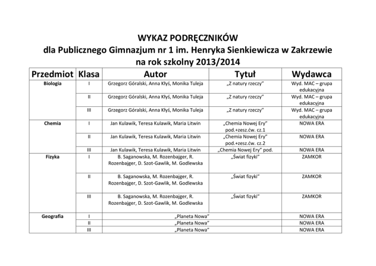 WYKAZ PODRĘCZNIKÓW dla Publicznego Gimnazjum nr 1 im