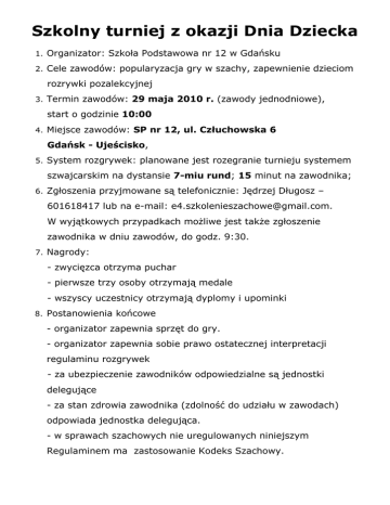 Szkolny turniej z okazji Dnia Dziecka 1. Organizator: Szkoła Podstawowa nr 12 w Gdańsku 2. Cele zawodów: popularyzacja gry w szachy, zapewnienie dzieciom rozrywki pozalekcyjnej 3. Termin zawodów: 29 maja 2010 r. (zawody jednodniowe), start o godzinie 10:00 4. Miejsce zawodów: SP nr 12, ul. Człuchowska 6 Gdańsk - Ujeścisko, 5. System rozgrywek: planowane jest rozegranie turnieju systemem szwajcarskim na dystansie 7-miu rund; 15 minut na zawodnika; 6. Zgłoszenia przyjmowane są telefonicznie: Jędrzej Długosz – 601618417 lub na e-mail: [email protected]. W wyjątkowych przypadkach możliwe jest także zgłoszenie zawodnika w dniu zawodów, do godz. 9:30. 7. Nagrody: - zwycięzca otrzyma puchar - pierwsze trzy osoby otrzymają medale - wszyscy uczestnicy otrzymają dyplomy i upominki 8. Postanowienia końcowe - organizator zapewnia sprzęt do gry. - organizator zapewnia sobie prawo ostatecznej interpretacji regulaminu rozgrywek - za ubezpieczenie zawodników odpowiedzialne są jednostki delegujące - za stan zdrowia zawodnika (zdolność do udziału w zawodach) odpowiada jednostka delegująca. - w sprawach szachowych nie uregulowanych niniejszym Regulaminem ma zastosowanie Kodeks Szachowy.