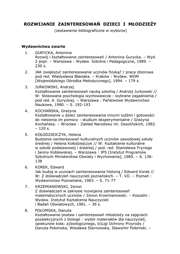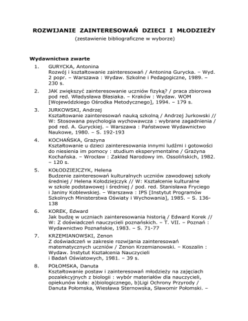 ROZWIJANIE ZAINTERESOWAŃ DZIECI I MŁODZIEŻY (zestawienie bibliograficzne w wyborze) Wydawnictwa zwarte 1. GURYCKA, Antonina Rozwój i kształtowanie zainteresowań / Antonina Gurycka. – Wyd. 2 popr. – Warszawa : Wydaw. Szkolne i Pedagogiczne, 1989. – 230 s. 2. JAK zwiększyć zainteresowanie uczniów fizyką? / praca zbiorowa pod red. Władysława Błasiaka. – Kraków : Wydaw. WOM [Wojewódzkiego Ośrodka Metodycznego], 1994. – 179 s. 3. JURKOWSKI, Andrzej Kształtowanie zainteresowań nauką szkolną / Andrzej Jurkowski // W: Stosowana psychologia wychowawcza : wybrane zagadnienia / pod red. A. Guryckiej. – Warszawa : Państwowe Wydawnictwo Naukowe, 1980. – S. 192-193 4. KOCHAŃSKA, Grażyna Kształtowanie u dzieci zainteresowania innymi ludźmi i gotowości do niesienia im pomocy : studium eksperymentalne / Grażyna Kochańska. – Wrocław : Zakład Narodowy im. Ossolińskich, 1982. – 120 s. 5. KOŁODZIEJCZYK, Helena Budzenie zainteresowań kulturalnych uczniów zawodowej szkoły średniej / Helena Kołodziejczyk // W: Kształcenie kulturalne w szkole podstawowej i średniej / pod. red. Stanisława Fryciego i Janiny Koblewskiej. – Warszawa : IPS [Instytut Programów Szkolnych Ministerstwa Oświaty i Wychowania], 1985. – S. 136138 6. KOREK, Edward Jak budzę w uczniach zainteresowania historią / Edward Korek // W: Z doświadczeń nauczycieli poznańskich. – T. VII. – Poznań : Wydawnictwo Poznańskie, 1983. – S. 71-77 7. KRZEMIANOWSKI, Zenon Z doświadczeń w zakresie rozwijania zainteresowań matematycznych uczniów / Zenon Krzemianowski. – Koszalin : Wydaw. Instytut Kształcenia Nauczycieli i Badań Oświatowych, 1981. – 39 s. 8. POŁOMSKA, Danuta Kształtowanie postaw i zainteresowań młodzieży na zajęciach pozalekcyjnych z biologii : wybór materiałów dla nauczycieli, opiekunów koła: a)biologicznego, b)Ligi Ochrony Przyrody / Danuta Połomska, Wiesława Sternowska, Sławomir Połomski. – Koszalin : Instytut Kształcenia Nauczycieli. Oddział Doskonalenia Nauczycieli, 1985. – 123 s. 9. PRUSAK, Paweł Rozwijanie zainteresowań zawodem nauczycielskim uczniów liceum ogólnokształcącego / Paweł Prusak. – Bydgoszcz : Wydaw. Uczelniane Wyższej Szkoły Pedagogicznej, 1984. – 230 s. 10. STASICA, Jadwiga 160 pomysłów na nauczanie zintegrowane relaksujących, rozwijających fantazję, zainteresowania i zdolności uczniów w klasach I-III / Jadwiga Stasica. – Kraków : „Impuls”, 2001. – 97 s. 11. SZEREMATA, Ryszard Kształtowanie zainteresowań technicznych uczniów w młodszym wieku szkolnym / Ryszard Szeremata // W: Szkoła – zawód – praca : Ogólnopolskie Seminarium Pedagogiki Pracy Kalisz 1980. – Kalisz : IKZ [Instytut Kształcenia Zawodowego], 1980. – S. 139142 12. SZUREK, Jan Kształtowanie zainteresowań uczniów zawodami rolniczymi / Jan Szurek. – Warszawa : Wydaw. Szkolne i Pedagogiczne, 1980. – 154 s. 13. WOJNAR, Józefa Zyta Budzenie zainteresowań kulturalnych uczniów technikum / Józefa Zyta Wojnar // W: Kształcenie kulturalne w szkole podstawowej i średniej / pod. red. Stanisława Fryciego i Janiny Koblewskiej. – Warszawa : IPS [Instytut Programów Szkolnych Ministerstwa Oświaty i Wychowania], 1985. – S. 134-135 14. WOJTCZAK, Jadwiga Budzenie zainteresowań czytelniczych uczniów szkoły zawodowej / Jadwiga Wojtczak // W: Kształcenie kulturalne w szkole podstawowej i średniej / pod. red. Stanisława Fryciego i Janiny Koblewskiej. – Warszawa : IPS [Instytut Programów Szkolnych Ministerstwa Oświaty i Wychowania], 1985. – S. 134-135 15. ZDEBSKI, Janusz Rozwój i kształtowanie zainteresowań sportowych dzieci i młodzieży / Janusz Zdebski // W: Studia z psychologii i psycholingwistyki : tom poświęcony pamięci Marii PrzetacznikGierowskiej / pod. red. Magdaleny Smoczyńskiej. – Kraków : Towarzystwo Autorów i Wydawców Prac Naukowych, cop. 1998. – S. 129-135 Artykuły z czasopism 16. ARMATYS, Danuta Jak rozwijać zainteresowania czytelnicze uczniów / Danuta Armatys, Małgorzata Żytkiewicz // Język Polski w Gimnazjum. – 2002/2003, nr 2, s. 18-21 17. BIGAJ, Janusz Wakacyjne obozy – szkołą kształtowania zainteresowań biologicznych / Janusz Bigaj, Barbara Płytycz // Biologia w Szkole. – 1984, nr 1, s. 31-35 18. CHAŁAS, Krystyna Jak rozwijać zainteresowania i uzdolnienia techniczne uczniów w szkole podstawowej / Krystyna Chałas // Ruch Nauczycielski. – 1990, nr 2/12, s. 195-221 19. CHRONOWSKI, Antoni O rozwijaniu zainteresowań matematyką w średniej szkole zawodowej / Antoni Chronowski // Szkoła Zawodowa. – 1980, nr 1, s. 19-20 20. CUDAK, Henryk Kształtowanie i rozwój zainteresowań uczniów w wielostronnym uczeniu się / Henryk Cudak, Marian Jakubowski // Ruch Pedagogiczny. – 1982, nr 4, s. 68-77 21. DĄBROWA, Marian Wpływ zabytków sztuki na rozwój zainteresowań uczniów przeszłością własnego środowiska / Marian Dąbrowa // Przegląd Oświatowo-Wychowawczy. – 1983, nr 1-4, s. 118-121 22. DUBIEL, Władysław O naturalnych zainteresowaniach uczniów klas początkowych i ich rozwijaniu w kierunku matematycznym / Władysław Dubiel // Nauczanie Początkowe. – 1996/1997, nr 3, s. 92-95 23. EREŃSKA-SUSZEK, Ewa Inspirująca rola nauczyciela w procesie rozbudzania zainteresowań muzycznych dzieci i młodzieży / Ewa Ereńska-Suszek // Wychowanie Muzyczne w Szkole. – 1987, nr 5, s. 317-318 24. GAJEK, Elżbieta Poznajemy rodzaje pisma / Elżbieta Gajek // Wychowanie w Przedszkolu. – 2005, nr 2, s. 45-47 Ćwiczenia dla dzieci mające na celu pobudzenie zainteresowania różnymi językami 25. GÓRECKA, Alicja Rozwijanie zdolności ogólnych i zainteresowań uczniów klas początkowych / Alicja Górecka // Nauczanie Początkowe. – 2000/2001, nr 1, s. 69-84 26. GÓRNIEWICZ, Józef Czynniki rozwoju zainteresowań dzieci 9-10 letnich (z badań) / Józef Górniewicz // Nowa Szkoła. – 1987, nr 5, s. 288-293 27. GRUBA, Joanna Rozwój zainteresowań informa