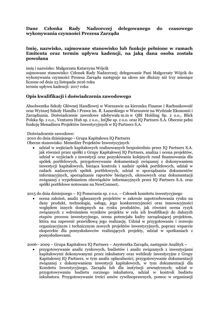 Dane Członka Rady Nadzorczej delegowanego wykonywania czynności Prezesa Zarządu do czasowego Imię, nazwisko, zajmowane stanowisko lub funkcje pełnione w ramach Emitenta oraz termin upływu kadencji, na jaką dana osoba została powołana imię i nazwisko: Małgorzata Katarzyna Wójcik zajmowane stanowisko: Członek Rady Nadzorczej; delegowanie Pani Małgorzaty Wójcik do wykonywania czynności Prezesa Zarządu następuje na okres nie dłuższy niż trzy miesiące liczone od dnia 23 listopada 2016 roku termin upływu kadencji: 2017 roku Opis kwalifikacji i doświadczenia zawodowego Absolwentka Szkoły Głównej Handlowej w Warszawie na kierunku Finanse i Rachunkowość oraz Wyższej Szkoły Handlu i Prawa im. R. Łazarskiego w Warszawie na Wydziale Ekonomii i Zarządzania. Doświadczenie zawodowe zdobywała m.in w QBI Holding Sp. z o.o., Blick Polska Sp. z o.o., Ventures Hub sp. z o.o., InQbe sp. z o.o. oraz IQ Partners S.A. Obecnie pełni funkcję Menadżera Projektów Inwestycyjnych w IQ Partners S.A. Doświadczenie zawodowe: 2010 do dnia dzisiejszego - Grupa Kapitałowa IQ Partners Obecne stanowisko: Menedżer Projektów Inwestycyjnych udział w wejściach kapitałowych realizowanych bezpośrednio przez IQ Partners S.A. jak również przez spółki z Grupy Kapitałowej IQ Partners, analiza i ocena projektów, udział w wyjściach z inwestycji oraz pozyskiwaniu kolejnych rund finansowania dla spółek portfelowych, przygotowywanie dokumentacji związanej z dokonywaniem inwestycji kapitałowych, bieżąca kontrola i nadzór spółek portfelowych, udział w radach nadzorczych spółek portfelowych, udział w sporządzaniu dokumentów informacyjnych, sporządzanie raportów bieżących, okresowych oraz dokumentacji związanej z wypełnianiem obowiązków informacyjnych przez IQ Partners S.A. oraz spółki portfelowe notowane na NewConnect, 2015 do dnia dzisiejszego – IQ Pomerania sp. z o.o. – Członek komitetu inwestycyjnego ocena założeń, analiz zgłaszanych projektów w zakresie zapotrzebowania rynku na dany produkt, technologię, usługę, jego konkurencyjności oraz innowacyjności względem innych dostępnych na rynku produktów, jak również ocena ryzyk związanych z wdrożeniem wyników projektu w celu ich kwalifikacji do dalszych etapów procesu inwestycyjnego, ocena potencjału kadry zarządzającej projektem, która ma zapewnić prawidłową jego realizację. Udział w przygotowaniu i rozwoju organizacyjnym i technicznym nowych projektów inwestycyjnych, poprzez wsparcie eksperckie dla pomysłodawców realizujących projekty, udział w spotkaniach z pomysłodawcami. 2006– 2009 – Grupa Kapitałowa IQ Partners – Asystentka Zarządu, następnie Analityk – przygotowywanie analiz rynkowych, budżetów i analiz związanych z inwestycjami kapitałowymi dokonywanymi przez inkubatory oraz wehikuły inwestycyjne z Grupy Kapitałowej IQ Partners, w tym analiz opłacalności; przygotowywanie dokumentacji związanej z dokonywaniem inwestycji kapitałowych, w tym dokumentacji dla Komitetu Inwestycyjnego, Zarządu lub dla instytucji zewnętrznych; udział w przygotowywaniu budżetu rocznego inkubatora, udział w kontroli budżetu inkubatora. Przygotowywanie treści umów cywilnoprawnych, pomoc w organizacji spółek z grupy kapitałowej pod kątem formalnym (rejestracja spółki w odpowiednich organach administracyjnych), koordynacja prac asystencko-administracyjnych związanych ze sprawnym prowadzeniem biura Zarządu, ścisła współpraca z kancelarią prawną oraz biurem rachunkowym, przygotowywanie raportów. Wskazanie działalności wykonywanej przez daną osobę poza Emitentem, gdy działalność ta ma istotne znaczenie dla Emitenta Pani Małgorzata Wójcik nie prowadzi działalności mającej istotne znaczenie dla Emitenta. Wskazanie wszystkich spółek prawa handlowego, w których, w okresie co najmniej ostatnich trzech lat, dana osoba była członkiem organów zarządzających lub nadzorczych albo wspólnikiem, ze wskazaniem, czy dana osoba nadal pełni funkcje w organach lub jest nadal wspólnikiem IQ Alfa sp. z o.o. z siedzibą w Olsztynie – Członek Zarządu, wspólnik, do chwili obecnej, Langloo.com S.A. z siedzibą w Warszawie – Członek Rady Nadzorczej, do chwili obecnej, NoNoobs.pl S.A. z siedzibą w Warszawie – Członek Rady Nadzorczej, do chwili obecnej, Awiemto sp. z o.o. z siedzibą w Warszawie – Przewodnicząca Rady Nadzorczej, do chwili obecnej, Igoria Trade S.A. z siedzibą w Warszawie – Członek Rady Nadzorczej, do chwili obecnej, Acrebit S.A. z siedzibą w Warszawie – Członek Rady Nadzorczej, do chwili obecnej, Propergroup S.A. z siedzibą w Warszawie – Członek Rady Nadzorczej, do chwili obecnej, Inflube sp. z o.o. z siedzibą w Szczecinie – Członek Rady Nadzorczej, do chwili obecnej, eRFX Prime sp. z o.o. z siedzibą w Szczecinie – Członek Rady Nadzorczej, do chwili obecnej, BCS Software S.A. z siedzibą w Katowicach – Członek Rady Nadzorczej, do chwili obecnej, aStory S.A. z siedzibą w Warszawie – Członek Rady Nadzorczej, do chwili obecnej, ABC Media Publishing sp. z o.o. z siedzibą w Oleśnicy – Członek Rady Nadzorczej, do 2016 roku, Power Price S.A. z siedzibą w Warszawie – Członek Rady Nadzorczej, do 2016 roku, Your Image S.A. z siedzibą w Warszawie – Członek Rady Nadzorczej, do 2016 roku, M10 S.A. z siedzibą w Zduńskiej Woli – Członek Rady Nadzorczej, do 2015 roku. Informacje na temat prawomocnych wyroków, na mocy których dana osoba została skazana za przestępstwa oszustwa w okresie co najmniej ostatnich pięciu lat oraz wskazanie, czy w okresie co najmniej pięciu lat osoba taka otrzymała sądowy zakaz działania jako członek organów zarządzających lub nadzorczych w spółkach prawa handlowego W okresie ostatnich pięciu lat Pani Małgorzata Wójcik nie została skazana za przestępstwo oszustwa. W okresie ostatnich pięciu lat Pani Małgorzata Wójcik nie otrzymała sądowego zakazu dzia