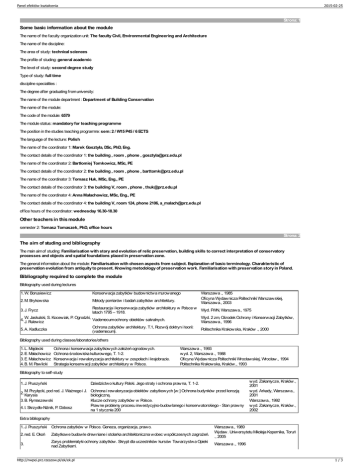 Panel efektów kształcenia 2015-02-25 Strona: 1 Some basic information about the module The name of the faculty organization unit: The faculty Civil, Environmental Engineering and Architecture The name of the discipline: The area of study: technical sciences The profile of studing: general academic The level of study: second degree study Type of study: full time discipline specialities : The degree after graduating from university: The name of the module department : Department of Building Conservation The name of the module: The code of the module: 6579 The module status: mandatory for teaching programme The position in the studies teaching programme: sem: 2 / W15 P45 / 6 ECTS The language of the lecture: Polish The name of the coordinator 1: Marek Gosztyła, DSc, PhD, Eng. The contact details of the coordinator 1: the building , room , phone , [email protected] The name of the coordinator 2: Bartłomiej Tomkowicz, MSc, PE The contact details of the coordinator 2: the building , room , phone , [email protected] The name of the coordinator 3: Tomasz Huk, MSc, Eng., PE The contact details of the coordinator 3: the building V, room , phone , [email protected] The name of the coordinator 4: Anna Małachowicz, MSc, Eng., PE The contact details of the coordinator 4: the building V, room 124, phone 2106, [email protected] office hours of the coordinator: wednesday 16.30-18.30 Other teachers in this module semester 2: Tomasz Tomaszek, PhD, office hours Strona: 2 The aim of studing and bibliography The main aim of studing: Familiarisation with story and evolution of relic preservation, building skills to correct interpretation of conservatory processes and objects and spatial foundations placed in preservation zone. The general information about the module: Familiarisation with chosen aspects from subject. Explanation of basic terminology. Charakteristic of preservation evolution from antiquity to present. Knowing metodology of preservation work. Familiarisation with preservation story in Poland. Bibliography required to complete the module Bibliography used during lectures 1. W. Borusiewicz Konserwacja zabytków budownictwa murowanego 2. M. Brykowska Metody pomiarów i badań zabytków architektury. Warszawa ., 1985 Oficyna Wydawnicza Politechniki Warszawskiej, Warszawa., 2003 Restauracja i konserwacja zabytków architektury w Polsce w Wyd. PWN, Warszawa., 1975 latach 1795 – 1918. Wyd. 2 zm, Ośrodek Ochrony i Konserwacji Zabytków, 4. W. Jaskulski, S. Kocewiak, P. Ogrodzki, Vademecum ochrony obiektów sakralnych. J. Rulewicz Warszawa., 1996 Ochrona zabytków architektury. T.1, Rozwój doktryn i teorii: 5. A. Kadłuczka Politechnika Krakowska, Kraków ., 2000 (vademecum). 3. J. Frycz Bibliography used during classes/laboratories/others 1. L. Majdecki 2. E. Małachowicz 3. E. Małachowicz 4. B. M. Pawlicki Ochrona i konserwacja zabytkowych założeń ogrodowych. Ochrona środowiska kulturowego, T. 1-2. Konserwacja i rewaloryzacja architektury w zespołach i krajobrazie. Strategia konserwacji zabytków architektury w Polsce. Warszawa ., 1993 wyd. 2, Warszawa ., 1988 Oficyna Wydawnicza Politechniki Wrocławskiej, Wrocław., 1994 Politechnika Krakowska, Kraków., 1993 Bibliography to self-study 1. J. Pruszyński Dziedzictwo kultury Polski. Jego straty i ochrona prawna, T. 1-2. 2. M. Przyłęcki, pod red. J. Ważnego i J. Ochrona i rewaloryzacja obiektów zabytkowych [w:] Ochrona budynków przed korozją Karysia biologiczną. 3. B. Rymaszewski Klucze ochrony zabytków w Polsce. Prawne problemy procesu inwestycyjno-budowlanego i konserwatorskiego - Stan prawny 4. I. Skrzydło-Niżnik, P. Dobosz na 1 stycznia 200 wyd. Zakamycze, Kraków., 2001 wyd. Arkady, Warszawa., 2001 Warszawa., 1992 wyd. Zakamycze, Kraków., 2002 Extra bibliography 1. J. Pruszyński Ochrona zabytków w Polsce. Geneza, organizacja, prawo. 2. red. E. Okoń Zabytkowe budowle drewniane i stolarka architektoniczna wobec współczesnych zagrożeń. 3. Zarys problematyki ochrony zabytków. Skrypt dla uczestników kursów Towarzystwa Opieki nad Zabytkami. http://nwpei.prz.rzeszow.pl/ek/ek.pl Warszawa., 1989 Wydaw. Uniwersytetu Mikołaja Kopernika, Toruń ., 2005 Warszawa ., 1996 1/3 Panel efektów kształcenia 2015-02-25 J. 4. Zachwatowicz Ochrona zabytków w Polsce. Wydaw. Polonia, Warszawa., 1965 Teaching materials: prezentacje multimedialne others: wzorcowe dokumentacje Strona: 3 Basic requirements in category knowledge/skills/social competences Formal requirements: Termination course in range history of architecture, history of polish architecture, architecture and urbanistic, conservation and preservation of relics Basic requirements in category knowledge: Has basic knowledge from metody of preservation work and conservatory designing. Basic requirements in category skills: Projecting investigative strategy and conservatory programs. Basic requirements in category social competences: Maintains precaution interpreting the results of investigation, is working in investigative team. Strona: 4 Module outcomes MEK The student who completed the module Types of classes / teaching methods leading to achieving a given outcome of teaching 01. Know and understand processes and procedure lecture, individual project for conservatory work. Know and understad the methody and manner of 02. preservation used in Poland and in foreign lecture, individual project countries Know to form diagnosis and opinions about 03. lecture, individual project existing state of storical relics 04. Has skill to prepare conservatury directions Has consciousness of architect role in 05. preservation 06. Present readiness to take liability to design solutions respect the storical relics lecture, individual project The ways of veryfing every Związki z Związki z mentioned outcome of KEK OEK teaching project presentation, written T2A_W03++ K_W009++ examination T2A_W04++ written examination, project presentation written examination, project presentation written examinat
