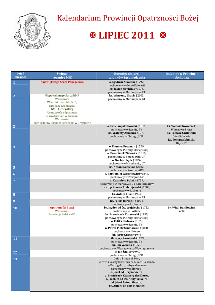 Kalendarium Prowincji Opatrzności Bożej LIPIEC 2011 Dzień miesiąca Święta, rocznice MIC Rocznice śmierci członków Zgromadzenia 1 Najświętszego Serca Pana Jezusa 2 Niepokalanego Serca NMP Wezwanie: Wikariat Ukraiński MIC; parafia w Grudziądzu NMP Licheńskiej Uroczystość odpustowa w sanktuarium w Licheniu Wezwanie: dom zakonny i kaplica parafialna w Grzybowie o. Egidiusz Sikorski †1792, pochowany w Górze Kalwarii ks. Justyn Novickas †1973, pochowany w Mariampolu, LT ks. Wincenty Grasis †2003, pochowany w Mariampolu, LT 3 o. Felicjan Jakubowski †1811, pochowany w Raśnie, BY ks. Walenty Atkočius †1979, pochowany w Chicago, USA 4 o. Faustyn Poszman †1769, pochowany w Puszczy Mariańskiej o. Franciszek Zielonka †1810, pochowany w Berezdowie, UA o. Norbert Nytz †1826, pochowany w Mirosławiu, LT ks. Antoni Lubickas †2002, pochowany w Rosario, ARG o. Bartłomiej Waszniewicz †1846, pochowany w Pokojnie, LT o. Kazimierz Polak †1759, pochowany w Warszawie u oo. Reformatów v.a. bp Roman Andrzejewski †2003, pochowany w Licheniu ks. Antoni Ylius †1994, pochowany w Mariampolu, LT ks. Feliks Bartecki †2004, pochowany w Licheniu br. Izydor od św. Wojciecha †1722, pochowany w Goźlinie br. Franciszek Kuczewski †1755, pochowany w Puszczy Mariańskiej o. Feliks Hadrava †1829, pochowany w Raśnie, BY o. Paweł Piotr Szumowski †1860, pochowany w Skórcu br. Jerzy Grigas †1946 o. Maurycy Żarnowski †1793, pochowany w Raśnie, BY br. Jan Wereda †1953, pochowany w Warszawie na Wawrzyszewie ks. Jan Šaulis †1990, pochowany w Chicago, USA Dnia 13 lipca 1834 r., w chwili kasaty klasztoru na Monte Balsamão w Portugalii, przebywali w nim następujący współbracia: o. Józef od Krzyża Vieira, o. Franciszek Ksawery das Dores, o. Joachim od św. Anny Teixeira, kl. Józef Antoni Guerra, br. Antoni de Luis Meireles 5 6 7 8 9 10 11 12 13 Opatrzności Bożej Wezwanie: Prowincja Polska MIC Imieniny w Prowincji obchodzą ks. Tomasz Nowaczek, Warszawa-Praga ks. Tomasz Sadłowski, Góra Kalwaria ks. Tomasz Sekulski, Rzym, IT br. Wital Danilowicz, Lublin 14 ks. Antoni Papużyński †2003, pochowany w Fawley Court, GB Dnia 14 lipca 1834 r., w chwili kasaty klasztoru w Algoso w Portugalii, przebywali w nim następujący współbracia: o. Franciszek od Oczyszczenia NMP, o. Grzegorz od św. Wincentego, o. Manuel Joachim das Dores Moura, o. Manuel od św. Rity Teixeira ks. Henryk Kulik, Góra Kalwaria ks. Henryk Nadrowski, Poznań 15 16 17 18 19 20 21 22 23 24 25 o. Faustyn Gans †1816, pochowany w Puszczy Mariańskiej br. Józef Apšega †1955, pochowany w Chicago, USA ks. Julian Chróściechowski †1976, pochowany w Hereford, GB ks. Józef Vaitkevičius †1949, pochowany w Chicago, USA br. Pius Gudulevičius †1984, pochowany w Avellaneda, ARG ks. Stefan Szwajkowski †2010, pochowany w Kurytybie, BR ks. Julian Kazakas †1960, pochowany w Mariampolu, LT ks. Czesław Fajkowski †1992, pochowany w Skórcu o. Jakub Lewicki †1790, pochowany w Berezdowie, UA o. Walerian Dąbrowski †1776, pochowany w Goźlinie br. Jan Obrębski †2004, pochowany w Rzymie na Verano, IT ks. Robert Wierzejski †1949, pochowany w Warszawie na Wawrzyszewie br. Antoni Vaičiunas †1973, pochowany w Żmudkach, LT ks. Albin Budrikis †1983, pochowany w Rokantiszkach, LT kl. Jan Gajowniczek †1958, pochowany w Warszawie na Wawrzyszewie o. Marcin Stęchlewicz †1800, pochowany w Skórcu ks. Józef Grigaitis †1974, pochowany w Mariampolu, LT br. Józef Rutkaukas †1980, pochowany w Mariampolu, LT ks. Władysław Łysik †1964, pochowany w Warszawie na Wawrzyszewie ks. Aleksiej Miciński, Karaganda, KAZ ks. Czesław Franciszkowicz, Góra Kalwaria ks. Czesław Knozowski, Licheń ks. Czaslau Kureczka, Rosica, BY ks. Czesław Pisiak, Licheń ks. Czesław Poloczek, Rdzawka ks. Czesław Szyszko, Licheń br. Jakub Biernacki, Lublin ks. Krzysztof Babik, Licheń br. Krzysztof Biel, Licheń ks. Krzysztof Erdzik, Grudziądz ks. Krzysztof Jagoda, Warszawa-Marymont ks. Krzysztof Jędrzejewski, Licheń br. Krzysztof Migas, Puszcza Mariańska ks. Krzysztof Orłowski, Puszcza Mariańska br. Krzysztof Stąpor, Skórzec ks. Krzysztof Trojan, Lublin ks. Krzysztof Wereda, Warszawa-Praga ks. Krzysztof Wojcieszak, Puszcza Mariańska br. Krzysztof Zabłocki, Elbląg ks. Krzysztof Zambrzycki, Góra Kalwaria ks. Krzysztof Ziaja, Warszawa-Stegny 26 27 28 31 Św. Ignacego z Loyoli Patrona Zgromadzenia o. Grzegorz Olszewski †1769, pochowany w Górze Kalwarii o. Jerzy Naruszewicz †1873, pochowany w Mariampolu, LT ks. Władysław Polonskis †1960, pochowany w Mariampolu, LT post. Czesław Smulko †1931, pochowany w Drui, BY br. Antoni Erdmans †1944, pochowany w Welonach, LV o. archimandryta Leon Horoszko †1977, pochowany w Londynie, GB ks. Władysław Korzekwa †1990, pochowany w Warszawie na Wawrzyszewie br. Aleksander Szymański †1919, pochowany w Warszawie na Bielanach ks. Józef Poderis †1994, pochowany w Kownie, LT ks. Kazimierz Valeikis †2010, pochowany w Mariampolu, LT SKRÓTY I OBJAŚNIENIA: AM – Armenia AUS – Australia BR – Brazylia BY – Białoruś CZ – Republika Czeska D – Niemcy FR - Francja GB – Wielka Brytania IT – Włochy KZ – Kazachstan LT – Litwa LV – Łotwa PR – Portugalia RA – Argentyna RU – Rosja SK – Słowacja UA – Ukraina USA – Stany Zjednoczone Ameryki Północnej v.a. – vir aggregatus (mąż stowarzyszony) – uroczystości powszechne – święta, wspomnienia i rocznice oraz inne adnotacje dotyczące całego Zgromadzenia – święta, wspomnienia i rocznice dotyczące poszczególnych jednostek administracyjnych Zgromadzenia lub domów zakonnych i parafii Prowincji Opatrzności Bożej Uwaga: Kalendarium obejmuje wspomnienia wszystkich zmarłych członków naszego Zgromadzenia, natomiast daty imienin dotyczą jedynie członków Prowincji Opatrzności Bożej. Skróty państw wprowadzono ze względu na czytelników portalu nie znają