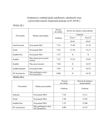 Godzinowy rozkład jazdy autobusów szkolnych wraz z przewidywanymi miejscami postoju (2.01.2014r.) TRASA NR 1 Dowóz do szkoły Przystanek Dowóz do miejsca zamieszkania Godzina Miejsce przystanku Godzina Kurs I Kurs II pn-pt pn-pt Osiek Kasztal Przystanek PKS 7.16 13.42 15.19 Osiek Przystanek PKS 7.22 13.36 15.13 Kadłub Piec Przystanek PKS 7.27 X X Kadłub Plac manewrowy przed remizą 7.35 13.23 15.03 Kadłub Plac przy kościele 7.40 X 14.55 Kadłub Banatki Przystanek PKS 7.46 X 14.52 PG Szymiszów Plac parkingowy przy PG Szymiszów 8.00 X 14.35 TRASA NR 2 Przystanek Dowóz do szkoły Dowóz do miejsca zamieszkania Godzina Godzina Miejsce przystanku Jędrynie Przystanek PKS 7.24 15.11 Osiek Przystanek PKS 7.30 15.05 Kadłub Piec Przystanek PKS 7.35 15.00 PG Szymiszów Plac parkingowy przy PG Szymiszów 8.00 14.35 TRASA NR 3 Przystanek Dowóz do szkoły Dowóz do miejsca zamieszkania Godzina Godzina Miejsce przystanku Rozmierka Przystanek PKS 7.45 14.45 PG Szymiszów Plac parkingowy przy PG Szymiszów 7.55 14.35 TRASA NR 4 Dowóz do szkoły Przystanek Dowóz do miejsca zamieszkania Godzina Miejsce przystanku Godzina Kurs I Kurs II pn-pt pn-pt Grodzisko Bregule Przystanek PKS 7.10 15.25 X Grodzisko Wieś Przystanek PKS 7.19 15.16 X 7.26 15.09 X 7.40 14.55 12.55 Rozmierz PG Szymiszów Plac manewrowy przed remizą Plac parkingowy przy PG Szymiszów PSP Szymiszów Przystanek PKS 7.50 14.45 12.45 PG Szymiszów Plac parkingowy przy PG Szymiszów 8.00 14.35 X TRASA NR 5 Przystanek Dowóz do szkoły Dowóz do miejsca zamieszkania Godzina Godzina Miejsce przystanku Kurs I Kurs I Kurs II pn-pt pn-pt pn-czw piątek Rożniątów Biadacz Przystanek PKS 7.35 X 15.50 15.05 Rożniątów Przystanek PKS 7.40 13.10 15.45 15.00 7.50 13.00 15.35 14.50 7.55 X 15.30 14.45 8.00 X 15.25 14.40 PSP nr 7 Strzelce Op. PG nr 1 Strzelce Op. PG nr 2 Strzelce Op. Plac manewrowy przy placówce Plac manewrowy przy placówce Parking na terenie szkoły TRASA NR 6 Dowóz do szkoły Przystanek Dowóz do miejsca zamieszkania Miejsce przystanku Godzina Godzina pn-czw piątek Ligota Dolna Przystanek PKS 7.25 15.52 15.07 Ligota Górna Przystanek PKS 7.30 15.47 15.02 Niwki Przystanek PKS 7.34 15.43 14.58 Kalinowice Stara Poczta Przystanek PKS 7.36 15.41 14.56 Kalinowice Wieś Przystanek PKS 7.40 15.37 14.52 Kalinów Przystanek PKS 7.45 15.32 14.47 PG nr 2 Strzelce Op. Parking na terenie szkoły 7.52 15.25 14.40 PG nr 1 Strzelce Op. Plac manewrowy przy placówce 7.57 15.20 14.35 Zespół Niepublicznych Szkół Specjalnych Plac przy wejściu do szkoły na ul. Ks. Waidy 8.02 15.15 14.30 TRASA NR 7 Dowóz do szkoły Przystanek Miejsce przystanku Godzina Dowóz do miejsca zamieszkania Godzina pn-czw piątek Warmątowice Zatoczka przy sklepie 7.15 x x Warmątowice ul. Polna 7.20 x x Błotnica Strzelecka Wejście na teren placówki 7.25 x x Płużnica Przystanek PKS 7.30 15.53 15.03 Błotnica Strzelecka Wejście na teren placówki 7.37 15.46 14.56 Błotnica Strzelecka Przystanek przy kościele 7.40 15.43 14.53 Błotnica Strzelecka Wejście na teren przedszkola przy ul. Dworcowej 6 7.42 x x Warmątowice ul. Polna 7.45 15.40 14.50 Warmątowice Zatoczka przy sklepie 7.50 15.35 14.45 PG nr 2 Strzelce Op. Parking na terenie szkoły 8.00 15.25 14.35 PG nr 1 Strzelce Op. Plac manewrowy przy placówce 8.05 15.20 14.30 Zespół Niepublicznych Szkół Specjalnych Plac przy wejściu do szkoły na ul. Ks. Waidy 8.10 15.15 14.25 TRASA NR 8 Dowóz do miejsca zamieszkania Przystanek Godzina Miejsce przystanku Kurs I Kurs II pn-pt pn-czw Warmątowice Zatoczka przy sklepie 13.40 15.20 Warmątowice ul. Polna 13.35 15.15 Błotnica Strzelecka Wejście na teren placówki 13.30 15.10 Płużnica Przystanek PKS 13.22 x Błotnica Strzelecka Wejście na teren placówki 13.15 x Błotnica Strzelecka Wejście na teren przedszkola przy ul. Dworcowej 6 13.10 x TRASA NR 9 Dowóz do szkoły Przystanek Miejsce przystanku Godzina Dziewkowice Przystanek PKS 7.35 Brzezina Przystanek PKS 7.43 Strzelce Opolskie ul. Ujazdowska 7.50 PG nr 2 Strzelce Op. Parking na terenie szkoły 7.55 PG nr 1 Strzelce Op. Plac manewrowy przy placówce 8.00 Zespół Niepublicznych Szkół Specjalnych Plac przy wejściu do szkoły na ul. Ks. Waidy 8.05 TRASA NR 10 (powrót ze szkoły) Przystanek Dowóz do miejsca zamieszkania Godzina Miejsce przystanku pn-czw piątek Brzezina Przystanek PKS 15.55 14.55 Dziewkowice-sklep Przystanek PKS 15.47 14.47 Dziewkowice Wieś Przystanek PKS 15.45 14.45 Dziewkowice Przystanek PKS 15.41 14.41 Strzelce Opolskie PSP nr 2 Strzelce Opolskie 15.35 14.35 PG nr 2 Strzelce Op. Parking na terenie szkoły 15.30 14.30 PG nr 1 Strzelce Op. Plac manewrowy przy placówce 15.25 14.25 Zespół Niepublicznych Szkół Specjalnych Plac przy wejściu do szkoły na ul. Ks. Waidy 15.20 14.20 TRASA NR 11 Przystanek Zatoczka przy świetlicy Farska Kolonia Przystanek PKS Strzelce Opolskie Dworzec autobusowy PSP nr 4 Strzelce Opolskie Wejście na teren placówki Plac manewrowy przy placówce Zespół Niepublicznych Szkół Specjalnych Dowóz do miejsca zamieszkania Godzina Godzina Miejsce przystanku Szczepanek PG nr 1 Strzelce Op. Dowóz do szkoły Plac przy wejściu do szkoły na ul. Ks. Waidy Kurs I Kurs II Kurs I Kurs II pn-pt Wtorek pn-czw piątek pn-pt 7.40 9.25 15.52 14.52 13.50 X X 15.42 14.42 X 7.50 X 15.37 14.37 X 7.52 9.35 15.35 14.35 13.40 7.57 X 15.30 14.30 X 8.02 X 15.25 14.25 13.30 TRASA NR 12 (tylko dowóz) Dowóz do szkoły Przystanek Miejsce przystanku Godzina Farska Kolonia Przystanek PKS 7.45 PSP nr 4 Strzelce Opolskie Wejście na teren placówki 7.56 PG nr 1 Strzelce Op. Plac manewrowy przy placówce 8.01 TRASA NR 13 (tylko powrót) Przystanek Miejsce przystanku Dowóz do szkoły Godzina Kalinowice Szkoła 13.05 Niwki Przystanek PKS 13.09 Ligota Górna Przystanek PKS 13.14 Ligota Dolna Przystanek PKS 13.18