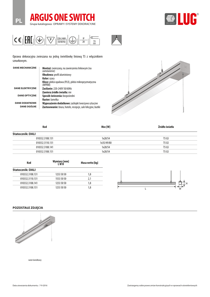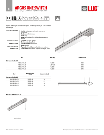 PL ARGUS ONE SWITCH Grupa katalogowa: OPRAWY I SYSTEMY DEKORACYJNE Oprawa dekoracyjna zwieszana na jedną świetlówkę liniową T5 z włącznikiem sznurkowym. DANE MECHANICZNE DANE ELEKTRYCZNE DANE OPTYCZNE DANE DODATKOWE DANE OGÓLNE Montaż: zwieszany, na zawieszeniu linkowym (na zamówienie) Obudowa: profil aluminiowy Kolor: szary Klosz: pleksi opalowa (PLX), pleksi mikropryzmatyczna (MPRM) Zasilanie: 220-240V 50/60Hz Zawiera źródło światła: nie Sposób świecenia: bezpośredni Raster: lamelka Wyposażenie dodatkowe: zaślepki tworzywo sztuczne Zastosowanie: biura, hotele, recepcje, sale lekcyjne, butiki Kod Moc [W] Źródło światła 010332.3108.131 010332.3110.131 010332.3108.141 010332.3108.151 1x28/54 1x35/49/80 1x28/54 1x28/54 T5 G5 T5 G5 T5 G5 T5 G5 Statecznik: DALI Kod Statecznik: DALI 010332.3108.131 010332.3110.131 010332.3108.141 010332.3108.151 Wymiary [mm] LWH Masa netto [kg] 1253 50 50 1553 50 50 1253 50 50 1253 50 50 1,8 2,1 1,8 1,8 POZOSTAŁE ZDJĘCIA raster lamelkowy Data utworzenia dokumentu: 7-9-2016 Zastrzegamy sobie prawo zmian konstrukcyjnych w oprawach oświetleniowych PL ARGUS ONE SWITCH Grupa katalogowa: OPRAWY I SYSTEMY DEKORACYJNE AKCESORIA 150060.00062 150061.00063 150062.00064 Data utworzenia dokumentu: 7-9-2016 Zawieszenie mechaniczne mini 150061.00066 150062.00067 Zawieszenie mechaniczne okrągłe ze złączką zasilającą Zawieszenie mechaniczne okrągłe Zastrzegamy sobie prawo zmian konstrukcyjnych w oprawach oświetleniowych