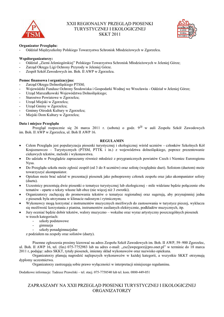 XXII REGIONALNY PRZEGLĄD PIOSENKI TURYSTYCZNEJ I EKOLOGICZNEJ SKKT 2011 Organizator Przeglądu: - Oddział Międzyszkolny Polskiego Towarzystwa Schronisk Młodzieżowych w Zgorzelcu. Współorganizatorzy: - Oddział ,,Ziemi Jeleniogórskiej” Polskiego Towarzystwa Schronisk Młodzieżowych w Jeleniej Górze; - Zarząd Okręgu Ligi Ochrony Przyrody w Jeleniej Górze. - Zespół Szkół Zawodowych im. Boh. II AWP w Zgorzelcu. Pomoc finansowa i organizacyjna: - Zarząd Okręgu Dolnośląskiego PTSM; - Wojewódzki Fundusz Ochrony Środowiska i Gospodarki Wodnej we Wrocławiu - Oddział w Jeleniej Górze; - Urząd Marszałkowski Województwa Dolnośląskiego; - Starostwo Powiatowe w Zgorzelcu; - Urząd Miejski w Zgorzelcu; - Urząd Gminy w Zgorzelcu; - Gminny Ośrodek Kultury w Zgorzelcu; - Miejski Dom Kultury w Zgorzelcu; Data i miejsce Przeglądu Przegląd rozpocznie się 26 marca 2011 r. (sobota) o godz. 9 30 w auli Zespołu Szkół Zawodowych im. Boh. II AWP w Zgorzelcu, ul. Boh II AWP 16. REGULAMIN Celem Przeglądu jest popularyzacja piosenki turystycznej i ekologicznej wśród uczniów - członków Szkolnych Kół Krajoznawczo – Turystycznych (PTSM, PTTK i in.) z województwa dolnośląskiego, poprzez prezentowanie ciekawych tekstów, melodii i wykonawstwa. Do udziału w Przeglądzie zapraszamy również młodzież z przygranicznych powiatów Czech i Niemiec Euroregionu Nysa. Do Przeglądu szkoła może zgłosić zespół (od 3 do 8 uczniów) oraz solistę (względnie duet). Solistom (duetom) może towarzyszyć akompaniator. Opiekun może brać udział w prezentacji piosenek jako pełnoprawny członek zespołu oraz jako akompaniator solisty (duetu). Uczestnicy prezentują dwie piosenki o tematyce turystycznej lub ekologicznej - mile widziane będzie połączenie obu tematów - oparte o teksty własne lub obce (nie więcej niż 3 zwrotki). Organizatorzy zachęcają do promowania tekstów o tematyce regionalnej oraz sugerują, aby przynajmniej jedna z piosenek była utrzymana w klimacie radosnym i rytmicznym; Wykonawcy mogą korzystać z instrumentów muzycznych możliwych do zastosowania w turystyce pieszej, wyklucza się możliwość korzystania z pianina, instrumentów zasilanych elektrycznie, podkładów muzycznych, itp. Jury oceniać będzie dobór tekstów, walory muzyczno – wokalne oraz wyraz artystyczny poszczególnych piosenek w trzech kategoriach: - szkoły podstawowe - gimnazja - szkoły ponadgimnazjalne z podziałem na zespoły oraz solistów (duety). Pisemne zgłoszenia prosimy kierować na adres Zespołu Szkół Zawodowych im. Boh. II AWP, 59–900 Zgorzelec, ul. Boh. II AWP 16, tel. (fax) 075-7752983 lub na adres e-mail: „[email protected]” w terminie do 18 marca 2011 r, podając: adres SKKT, tytuły piosenek, imienny skład wykonawców oraz nazwisko opiekuna. Organizatorzy planują nagrodzić najlepszych wykonawców w każdej kategorii, a wszystkie SKKT otrzymają dyplomy uczestnictwa. Organizatorzy zastrzegają sobie prawo wyłączności w interpretacji niniejszego regulaminu. Dodatkowe informacje: Tadeusz Prawelski – tel. stacj. 075-7758540 lub tel. kom. 0880-449-051 ZAPRASZAMY NA XXII PRZEGLĄD PIOSENKI TURYSTYCZNEJ I EKOLOGICZNEJ ORGANIZATORZY