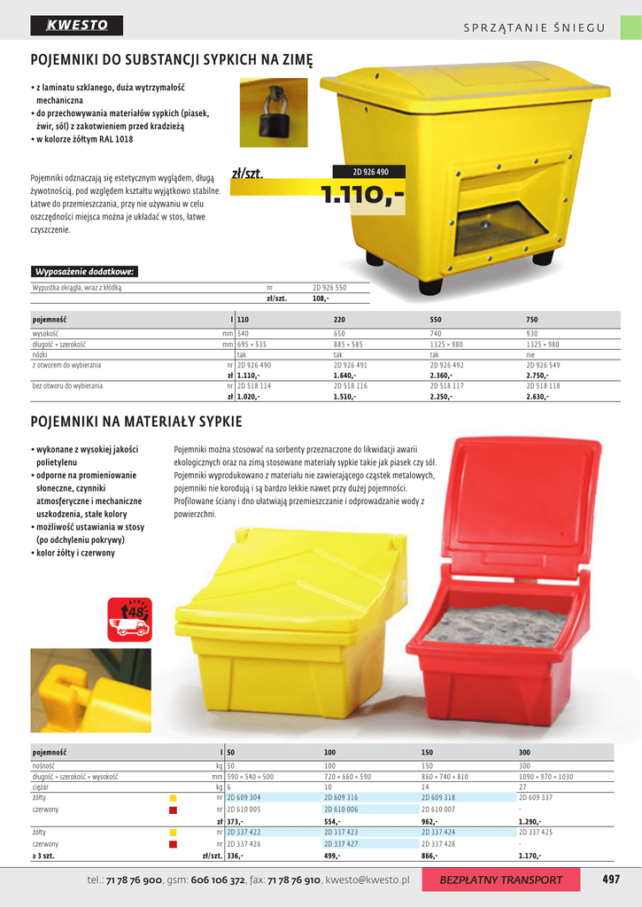 S P R Z ĄTA N I E Ś N I E G U POJEMNIKI DO SUBSTANCJI SYPKICH NA ZIMĘ •z laminatu szklanego, duża wytrzymałość mechaniczna •do przechowywania materiałów sypkich (piasek, żwir, sól) z zakotwieniem przed kradzieżą •w kolorze żółtym RAL 1018 Pojemniki odznaczają się estetycznym wyglądem, długą żywotnością, pod względem kształtu wyjątkowo stabilne. Łatwe do przemieszczania, przy nie używaniu w celu oszczędności miejsca można je układać w stos, łatwe czyszczenie. zł/szt. 2D 926 490 1.110,- Wyposażenie dodatkowe: Wypustka okrągła, wraz z kłódką nr zł/szt. pojemność l 110 wysokość długość × szerokość nóżki z otworem do wybierania mm 540 mm 695 × 535 tak nr 2D 926 490 zł 1.110,nr 2D 518 114 zł 1.020,- bez otworu do wybierania 2D 926 550 108,220 550 750 650 885 × 585 tak 2D 926 491 1.640,2D 518 116 1.510,- 740 1325 × 980 tak 2D 926 492 2.360,2D 518 117 2.250,- 930 1325 × 980 nie 2D 926 549 2.750,2D 518 118 2.630,- POJEMNIKI NA MATERIAŁY SYPKIE •wykonane z wysokiej jakości polietylenu •odporne na promieniowanie słoneczne, czynniki atmosferyczne i mechaniczne uszkodzenia, stałe kolory •możliwość ustawiania w stosy (po odchyleniu pokrywy) •kolor żółty i czerwony Pojemniki można stosować na sorbenty przeznaczone do likwidacji awarii ekologicznych oraz na zimą stosowane materiały sypkie takie jak piasek czy sól. Pojemniki wyprodukowano z materiału nie zawierającego cząstek metalowych, pojemniki nie korodują i są bardzo lekkie nawet przy dużej pojemności. Profilowane ściany i dno ułatwiają przemieszczanie i odprowadzanie wody z powierzchni. 48 pojemność l 50 nośność długość × szerokość × wysokość ciężar żółty kg mm kg nr 50 590 × 540 × 500 6 2D 609 304 100 150 300 100 720 × 660 × 590 10 2D 609 316 150 860 × 740 × 810 14 2D 609 318 300 1090 × 970 × 1030 27 2D 609 337 czerwony nr 2D 610 005 2D 610 006 2D 610 007 - żółty zł 373,nr 2D 337 422 554,2D 337 423 962,2D 337 424 1.290,2D 337 425 nr 2D 337 426 2D 337 427 2D 337 428 - 499,- 866,- 1.170,- czerwony ≥ 3 szt. zł/szt. 336,- tel.: 71 78 76 900, gsm: 606 106 372, fax: 71 78 76 910, [email protected] BEZPŁATNY TRANSPORT 497