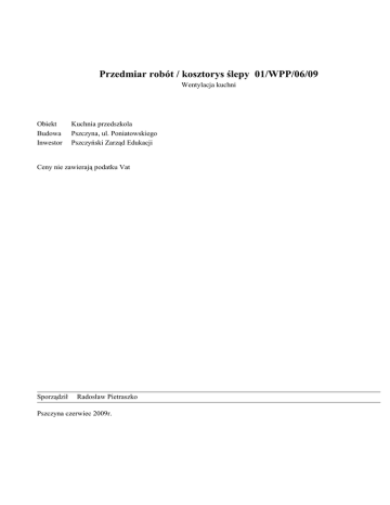 Przedmiar robót / kosztorys ślepy 01/WPP/06/09 Wentylacja kuchni Obiekt Budowa Inwestor Kuchnia przedszkola Pszczyna, ul. Poniatowskiego Pszczyński Zarząd Edukacji Ceny nie zawierają podatku Vat Sporządził Radosław Pietraszko Pszczyna czerwiec 2009r. Rodos 6.0.23.1 [7564] - Rekomendacja SKB Tabela przedmiaru robót Kuchnia przedszkola Nr Podstawa Opis robót 1 KNR 4-01 Przebicie otworów w ścianach z cegieł grubości 1 1/2 cegły na zaprawie cementowo-wapiennej 0333/10 2 KNR 4-01 0333/09 Przebicie otworów w ścianach z cegieł grubości 1cegły na zaprawie cementowo-wapiennej 3 KNR 2-17 0113/03 Przewody wentylacyjne z blachy stalowej kołowe, typ B/I, (z udziałem kształtek do 35%) o obwodzie do 250mm 4 KNR 2-17 0147/01 Kratka wentylacyjna wywiewna Dn 250 5 KNR 2-17 0204/03 Wentylatory promieniowe z polichlorku winylu z wirnikiem osadzonym na wale silnika o średnicy otworów ssących do 250mm i masie do 60kg 6 KNR 2-17 0147/01 Wyrzutnie ścienne, kołowe, typ B i C o średnicy 250mm - montaŜ w istniejącym oknie 7 Jm Ilość szt 1,000 szt 1,000 m2 1,570 szt 1,000 szt 1,000 szt 1,000 szt 1,000 szt 1,000 szt 1,000 szt 2,000 szt 1,000 m2 0,600 szt 1,000 układ 1,000 szt 1,000 kpl 1,000 Kalkulacja Adaptacja okna (wycięcie otworu 0,6*0,6 i zaślepienie blachą) do potrzeb montaŜu wyrzutni okrągłej indywidualna 8 KNR 4-01 0323/04 Zamurowanie przebić w ścianach grubości ponad 1 cegły 9 KNR 4-01 0323/04 Zamurowanie przebić w ścianach grubości ponad 1 cegły 10 KNR 4-01 0709/05 Uzupełnienie tynków zwykłych wewnętrznych kategorii III z zaprawy cementowo-wapiennej na ścianach o powierzchni w jednym miejscu do 0,5m2 na podłoŜach z cegły, pustaków ceramicznych, betonu 11 KNR 2-17 0146/02 Czerpnie ścienne, prostokątne, typ A o obwodzie do 1600mm - 400*400 12 KNR 2-17 0101/05 Przewody wentylacyjne z blachy stalowej, prostokątne, typ A/I, (z udziałem kształtek do 35%), o obwodzie do 1800mm 13 KNR 2-17 0134/01 Przepustnice wielopłaszczyznowe stalowe, prostokątne, typ A i B do przewodów o obwodzie do 1800mm 400*400 (zapewnijąca moŜliwość ręcznej regulacji ilości powietrza nawiewanego do pomieszczenia). 14 KNR 7-08 0301/02 MontaŜ układów sterowania elektrycznego zaworem elektromagnetycznym, przepustnicą lub rezystorem montaŜ regulatora REB-1 z podłączeniem elektrycznym (5 m przewodu, bezpiecznik) 15 KNNR 5 1205/08 16 Strona 2/2 Podłączenie silników w obudowie normalnej przewodem lub kablem 5-Ŝyłowym Cu o przekroju do 16mm2 Kalkulacja Regulacja i pomiar wydajności instalacji wentylacyjnej indywidualna