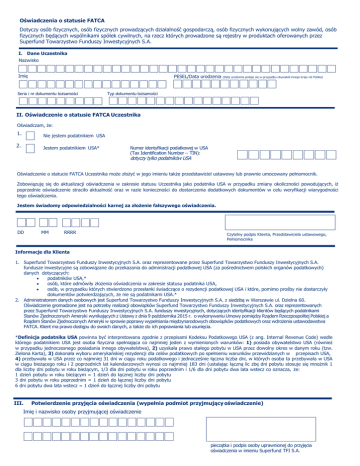 Oświadczenia o statusie FATCA Dotyczy osób fizycznych, osób fizycznych prowadzących działalność gospodarczą, osób fizycznych wykonujących wolny zawód, osób fizycznych będących wspólnikami spółek cywilnych, na rzecz których prowadzone są rejestry w produktach oferowanych przez Superfund Towarzystwo Funduszy Inwestycyjnych S.A. I. Dane Uczestnika Nazwisko Imię PESEL/Data urodzenia Seria i nr dokumentu tożsamości (Datę urodzenia podaje się w przypadku obywateli innego kraju niż Polska) Typ dokumentu tożsamości II. Oświadczenie o statusie FATCA Uczestnika Oświadczam, że: 1. Nie jestem podatnikiem USA 2. Jestem podatnikiem USA* Numer identyfikacji podatkowej w USA (Tax Identification Number – TIN): dotyczy tylko podatników USA Oświadczenie o statucie FATCA Uczestnika może złożyć w jego imieniu także przedstawiciel ustawowy lub prawnie umocowany pełnomocnik. Zobowiązuję się do aktualizacji oświadczenia w zakresie statusu Uczestnika jako podatnika USA w przypadku zmiany okoliczności powodujących, iż poprzednie oświadczenie straciło aktualność oraz w razie konieczności do dostarczenia dodatkowych dokumentów w celu weryfikacji wiarygodności tego oświadczenia. Jestem świadomy odpowiedzialności karnej za złożenie fałszywego oświadczenia. DD MM RRRR Czytelny podpis Klienta, Przedstawiciela ustawowego, Pełnomocnika Informacje dla Klienta 1. Superfund Towarzystwo Funduszy Inwestycyjnych S.A. oraz reprezentowane przez Superfund Towarzystwo Funduszy Inwestycyjnych S.A. fundusze inwestycyjne są zobowiązane do przekazania do administracji podatkowej USA (za pośrednictwem polskich organów podatkowych) danych dotyczących: • podatników USA,* • osób, które odmówiły złożenia oświadczenia w zakresie statusu podatnika USA, • osób, w przypadku których stwierdzono przesłanki świadczące o rezydencji podatkowej USA i które, pomimo prośby nie dostarczyły dokumentów potwierdzających, że nie są podatnikami USA.* 2. Administratorem danych osobowych jest Superfund Towarzystwo Funduszy Inwestycyjnych S.A. z siedzibą w Warszawie ul. Dzielna 60. Oświadczenie gromadzone jest na potrzeby realizacji obowiązków Superfund Towarzystwo Funduszy Inwestycyjnych S.A. oraz reprezentowanych przez Superfund Towarzystwo Funduszy Inwestycyjnych S.A. funduszy inwestycyjnych, dotyczących identyfikacji klientów będących podatnikami Stanów Zjednoczonych Ameryki wynikających z Ustawy z dnia 9 października 2015 r. o wykonywaniu Umowy pomiędzy Rządem Rzeczpospolitej Polskiej a Rządem Stanów Zjednoczonych Ameryki w sprawie poprawy wypełniania międzynarodowych obowiązków podatkowych oraz wdrożenia ustawodawstwa FATCA. Klient ma prawo dostępu do swoich danych, a także do ich poprawiania lub usunięcia. *Definicja podatnika USA powinna być interpretowana zgodnie z przepisami Kodeksu Podatkowego USA (z ang. Internal Revenue Code) wedle którego podatnikiem USA jest osoba fizyczna spełniająca co najmniej jeden z wymienionych warunków: 1) posiada obywatelstwo USA (również w przypadku jednoczesnego posiadania innego obywatelstwa), 2) uzyskała prawo stałego pobytu w USA przez dowolny okres w danym roku (tzw. Zielona Karta), 3) dokonała wyboru amerykańskiej rezydencji dla celów podatkowych po spełnieniu warunków przewidzianych w przepisach USA, 4) przebywała w USA przez co najmniej 31 dni w ciągu roku podatkowego i jednocześnie łączna liczba dni, w których osoba ta przebywała w USA w ciągu bieżącego roku i 2 poprzednich lat kalendarzowych wynosi co najmniej 183 dni (ustalając łączną lic zbę dni pobytu stosuje się mnożnik 1 dla liczby dni pobytu w roku bieżącym, 1/3 dla dni pobytu w roku poprzednim i 1/6 dla dni pobytu dwa lata wstecz co oznacza, że: 1 dzień pobytu w roku bieżącym = 1 dzień do łącznej liczby dni pobytu 3 dni pobytu w roku poprzednim = 1 dzień do łącznej liczby dni pobytu 6 dni pobytu dwa lata wstecz = 1 dzień do łącznej liczby dni pobytu III. Potwierdzenie przyjęcia oświadczenia (wypełnia podmiot przyjmujący oświadczenie) Imię i nazwisko osoby przyjmującej oświadczenie pieczątka i podpis osoby uprawnionej do przyjęcia oświadczenia w imieniu Superfund TFI S.A.