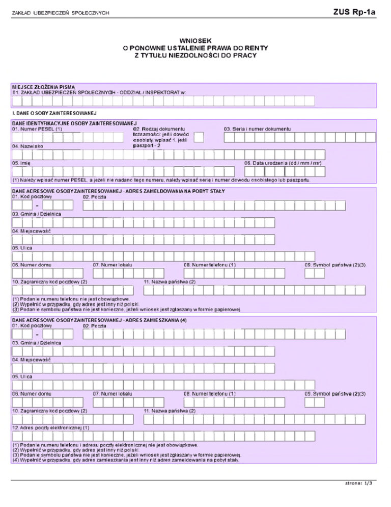 ZUS Rp-1a ZAKŁAD UBEZPIECZEŃ SPOŁECZNYCH WNIOSEK O PONOWNE USTALENIE PRAWA DO RENTY Z TYTUŁU NIEZDOLNOŚCI DO PRACY MIEJSCE ZŁOŻENIA PISMA 01. ZAKŁAD UBEZPIECZEŃ SPOŁECZNYC H - ODDZIAŁ / INSPEKTORAT w: I. DANE OSOBY ZAINTERESOWANEJ DANE IDENTYFIKACYJNE OSOBY ZAINTERESOWANEJ 01. Numer PESEL (1) 02. Rodzaj dokumentu tożsamości: jeśli dowód f " I I I I I I I I I I I osobisty, wpisać 1, jeśli |___ | 04. Nazwisko paszport- 2 03. Seria i numer dokumentu 06. Data urodzenia (dd / mm / rrrr) 05. Imię (1) Należy wpisać numer PESEL, a jeżeli nie nadano tego numeru, należy wpisać serię i numer dowodu osobistego lub paszportu. DANE AD RES OWE OSOBYZAINTERESOWANEJ - ADRES ZAMELDOWANIA NA POBYT STAŁY 01. Kod )OCZl owy 02. Poczta 03. Gmin a /C zielnica 04. Miejscowość 05. Ulica 06. Numer domu 07. Numer lokalu 10. Zagraniczny kod pocztowy (2) 08. Numer telefonu (1) 09. Symbol państwa (2)(3) 11. Nazwa państwa (2) (1) Podanie numeru telefonu nie jest obowiązkowe. (2) Wypełnić w przy padku, gdy adres jest inny niż polski. (3) Podań ie symbolu państwa nie jest konieczne, jeżeli wniosek jest zgłaszany w formie papierowej. DANE AD RES OWE OSOBYZAINTERESOWANEJ -ADRES ZAMIESZKANIA (4) 01. Kod )OCZl owy 02. Poczta 03. Gmin a /C zielnica 04. Miejscowość 05. Ulica 06. Numer domu 10. Zagraniczny kod pocztowy (2) 07. Numer lokalu 08. Numer telefonu (1 09. Symbol państwa (2)(3) 11. Nazwa państwa (2) 12. Adres poczty elektronicznej (1) (1) Podanie numeru telefonu i adresu poczty elektronicznej nie jest obowiązkowe. (2) Wypełnić w przypadku, gdy adres jest inny niż polski. (3) Podanie symbolu państwa nie jest konieczne, jeżeli wniosek jest zgłaszany w formie papierowej. (4) Wypełnić w przypadku, gdy adres zamieszkania je st inny niż adres zameldowania na pobyt stały. strona: 1/3 ZUS Rp-1a ZAKŁAD UBEZPIECZEŃ SPOŁECZNYCH DANE ADRESOWE OSOBYZAINTERESOWANEJ -ADRES DO KORESPONDENCJI 01. Kod pocztowy 02. Poczta 03. Gmina/Dzielnica 04. Miejscowość 05. Ulica 06. Numer domu 07. Numer lokalu 10. Zagraniczny kod pocztowy (2) 08. Numer telefonu (1) 09. Symbol państwa (2)(3) 11. Nazwa państwa (2) (1) Podanie numeru telefonu nie jest obowiązkowe. (2) Wypełnić w przypadku, gdy adres jest inny niż polski. (3) Podań ie symbolu państwa nie jest konieczne, jeżeli wniosek jest zgłaszany w formie papierowej. S y m b o l i n u m e r ś w ia d c z e n ia : N a le ż y p o d a ć O d d z ia ł / I n s p e k t o r a t Z U S : — i— i— i— — — — — i— i— i— — II. WNIOSEK OSOBY ZAINTERESOWANEJ W n o s z ę o p o n o w n e u s ta le n ie p ra w a d o r e n ty z t y t u łu n ie z d o ln o ś c i d o p ra c y . III. OŚWIADCZENIE OSOBY ZAINTERESOWANEJ 1. O ś w ia d c z a m , ż e : j (należy zaznaczyć właściwy kwadrat) p r a c u ję n ie p r a c u ję J e ż e li P a n i-P a n p r a c u je n a le ż y w y p e łn ić p o n iż s z e p o le i p o d a ć r o d z a j w y k o n y w a n e j p ra c y , w y k o n y w a n y z a w ó d lu b w y k o n y w a n e c z y n n o ś c i o ra z n a z w ę a k tu a ln e g o p ra c o d a w c y : N a le ż y p o d a ć n a z w ę i a d re s p la c ó w k i s łu ż b y z d ro w ia [ 1 ] , w k t ó r e j P a n i-P a n b y ła - b y ł lu b j e s t le c z o n a /y : 2. P rz e d k ła d a m d o k u m e n t y : (należy zaznaczyć właściwy kwadrat) J z a ś w ia d c z e n ie o s ta n ie z d r o w ia d o k u m e n ta c ja le c z n ic z a W celu p o n o w n e g o u s ta le n ia praw a d o re n ty z ty tu łu n ie z d o ln o ś c i d o p ra c y należy w o rg a n ie re n to w y m p rz e d ło ż y ć z a ś w ia d c z e n ie o s ta n ie z d ro w ia dla c e ló w ś w ia d c z e ń z u b e z p ie c z e n ia s p o łe c z n e g o , w y d a n e przez lekarza p ro w a d zą ce g o le c z e n ie — n ie w c z e ś n ie j n iż na m ie s ią c p rze d d a tą z ło ż e n ia w n io s k u , oraz e w e n tu a ln ie p o s ia d a n ą d o k u m e n ta c ję le czniczą. J e żeli w e w n io s k u n ie za m ie s z cz o n o d a n y c h lu b n ie d o s ta rc z o n o d o k u m e n tó w , k tó re są n ie z b ę d n e d o je g o ro z p a trz e n ia , o rg an re n to w y w zyw a z a in te re s o w a n e g o d o u z u p e łn ie n ia w n io s k u i w yzn a cza te rm in na to u z u p e łn ie n ie . N ie u s u n ię c ie b ra k ó w w te rm in ie w y z n a c z o n y m przez o rg a n re n to w y s p o w o d u je w y d a n ie d e c y z ji o o d m o w ie w sz c z ę c ia p o s tę p o w a n ia . Świadoma(y) odpowiedzialności karnej za składanie n ie p r a w d z iw y c h zeznań, oświadczam, że dane zaw arte w e wniosku, podałam(em) zgodnie z prawdą, co potwierdzam złożonym podpisem. (Miejscowość) (Data: dd I mm I rrrr) (Podpis osoby zainteresowanej lub pełnomocnika) [1] Pod pojęciem placówki służby zdrowia należy rozumieć: zakład opieki zdrowotnej (przychodnia, szpital, ośrodek zdrowia, poradnia), indywidualną i grupową praktykę lekarską oraz inne podmioty udzielające świadczeń zdrowotnych. strona: 2/3 ZUS Rp-1a ZAKŁAD UBEZPIECZEŃ SPOŁECZNYCH INFORMACJA Zakła d in fo rm u je , że zg o d n ie z u s ta w ą z dnia 30 k w ie tn ia 20 0 4 r. o św iadcze niach p rze d e m e ryta ln ych (Dz. U. z 2 0 13 r., p o z . 170) - oso ba , w p rz y p a d k u k tó re j u s ta ło p ra w o do re n ty z ty tu łu niezd oln ości do pracy, m oże u b ie g a ć się o św iadcze nie p rz e d e m e ry ta ln e . P raw o d o św iadcze nia p rz e d e m e ry ta ln e g o p rz y s łu g u je pod w a ru n kie m z a re je s tro w a n ia się w e w łaściw ym p o w ia to w y m u rzę d zie pracy w ciągu 30 dni od dnia u s ta n ia p ra w a do re n ty z ty tu łu niezd oln ości do pracy, t j. od n a s tę p n e g o dnia po dniu, do k tó re g o z o s ta ła przyzn a n a ta re n ta . W p rz y p a d k u zg ło sze n ia - nie p ó ź n ie j niż w m iesiącu, od k tó re g o u s ta ło p ra w o do o k re s o w e j re n ty z ty tu łu niezd oln ośc