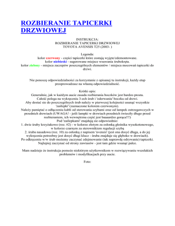 ROZBIERANIE TAPICERKI DRZWIOWEJ INSTRUKCJA: ROZBIERANIE TAPICERKI DRZWIOWEJ TOYOTA AVENSIS T25 (2003- ) Legenda: kolor czerwony - części tapicerki które zostają wyjęte/zdemontowane. kolor niebieski - sugerowane miejsce wsuwania śrubokręta. kolor zielony - miejsca zaczepów poszczególnych elementów / miejsca mocowań tapicerki do drzwi. Nie ponoszę odpowiedzialności za korzystanie z opisanej tu instrukcji, każdy etap przeprowadzasz na własną odpowiedzialność. Krótki opis: Generalnie, jak w każdym aucie zasada rozbierania boczków jest bardzo prosta. Całość polega na wykręceniu 3-ech śrub i 'oderwaniu' boczku od drzwi. Aby dostać sie do poszczególnych śrub należy w pierwszej kolejności usunąć wszystkie 'zaślepki' (zaznaczone kolorem czerwonym). Należy pamiętać o odłączeniu kabli od sterowania szybami oraz od lampek ostrzegawczych w przednich drzwiach (UWAGA! - jeśli lampki w drzwiach przednich świeciły długo przed rozbieraniem, ich wewnętrzna część jest baaaardzo gorąca!!!) Pod 'zaślepkami' znajdują sie odpowiednio: 1. dwie śruby krzyżakowe (roz. #2) - w kolorze złotym za osłonką głośnika wysokotonowego, w kolorze czarnym za sterownikiem regulacji szybą 2. śruba nasadowa (roz. 10) za osłonką z napisem 'avensis' (jest ona dosyć długa, a do jej wykręcenia potrzebny jest dosyć długi klucz - śruba znajduje się głęboko w drzwiach). Po odkręceniu w/w śrub możemy zaczynać zdejmowanie (tak naprawdę odrywanie) tapicerki. Najlepiej zaczynać od strony zawiasów - jest tam gdzie wsunąć palce. Mam nadzieje że instrukcja pomoże niektórym użytkownikom w rozwiązywaniu wszelakich problemów i modyfikacjach przy aucie. Foto: