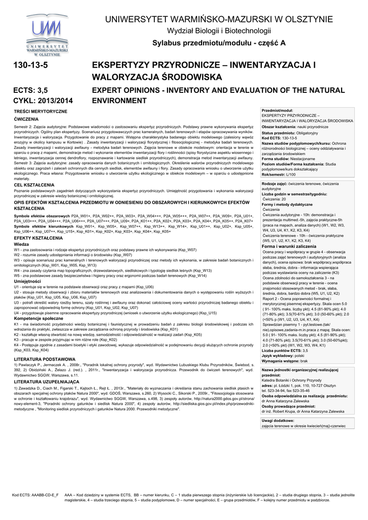 UNIWERSYTET WARMIŃSKO-MAZURSKI W OLSZTYNIE Wydział Biologii i Biotechnologii Sylabus przedmiotu/modułu - część A 130-13-5 EKSPERTYZY PRZYRODNICZE – INWENTARYZACJA I WALORYZACJA ŚRODOWISKA ECTS: 3,5 CYKL: 2013/2014 EXPERT OPINIONS - INVENTORY AND EVALUATION OF THE NATURAL ENVIRONMENT TREŚCI MERYTORYCZNE ĆWICZENIA Przedmiot/moduł: EKSPERTYZY PRZYRODNICZE – INWENTARYZACJA I WALORYZACJA ŚRODOWISKA Semestr 2: Zajęcia audytoryjne: Podstawowe wiadomości o zastosowaniu ekspertyz przyrodniczych. Podstawy prawne wykonywania ekspertyz przyrodniczych. Ogólny plan ekspertyzy. Scenariusz przygotowawczych prac kameralnych, badań terenowych i etapów opracowywania wyników. Inwentaryzacja i waloryzacja. Przygotowanie do pracy z mapami. Wstępna charakterystyka badanego obiektu modelowego (zalesiony wąwóz erozyjny w okolicy kampusu w Kortowie) . Zasady inwentaryzacji i waloryzacji florystycznej i fitosocjologicznej - metodyka badań terenowych. Zasady inwentaryzacji i waloryzacji awifauny - metodyka badań terenowych. Zajęcia terenowe w obiekcie modelowym: orientacja w terenie w oparciu o pracę z mapami, demonstracje metod i wykonanie elementów inwentaryzacji flory i roślinności (spisy florystyczne aspektu wiosennego i letniego, inwentaryzacja cennej dendroflory, rozpoznawanie i kartowanie siedlisk przyrodniczych), demonstracja metod inwentaryzacji awifauny. Semestr 3: Zajęcia audytoryjne: zasady opracowania danych botanicznych i ornitologicznych. Określenie walorów przyrodniczych modelowego obiektu oraz zagrożeń i zaleceń ochronnych dla cennych siedlisk, elementów awifauny i flory. Zasady opracowania wniosku o utworzenie użytku ekologicznego. Praca własna: Przygotowanie wniosku o utworzenie użytku ekologicznego w obiekcie modelowym – w oparciu o udostępnione materiały. Obszar kształcenia: nauki przyrodnicze CEL KSZTAŁCENIA Rodzaje zajęć: ćwiczenia terenowe, ćwiczenia audytoryjne Liczba godzin w semestrze/tygodniu: Ćwiczenia: 20 Formy i metody dydaktyczne Ćwiczenia Ćwiczenia audytoryjne - 10h: demonstracja i prezentacja multimed.-5h, zajęcia praktyczne-5h (praca na mapach, analiza danych) (W1, W2, W3, W4, U3, U4, K1, K2, K3, K4) Ćwiczenia terenowe - 10h - ćwiczenia praktyczne (W5, U1, U2, K1, K2, K3, K4) Poznanie podstawowych zagadnień dotyczących wykorzystania ekspertyz przyrodniczych. Umiejętność przygotowania i wykonania waloryzacji przyrodniczej w zakresie wiedzy botanicznej i ornitologicznej. OPIS EFEKTÓW KSZTAŁCENIA PRZEDMIOTU W ODNIESIENIU DO OBSZAROWYCH I KIERUNKOWYCH EFEKTÓW KSZTAŁCENIA Symbole efektów obszarowych P2A_W01+, P2A_W02++, P2A_W03+, P2A_W04+++, P2A_W05+++, P2A_W07++, P2A_W09+, P2A_U01+, P2A_U03+++, P2A_U04+++, P2A_U06+++, P2A_U07+++, P2A_U09+, P2A_K01++, P2A_K02+, P2A_K03+, P2A_K04+, P2A_K05++, P2A_K07+ Symbole efektów kierunkowych Ksp_W01+, Ksp_W05+, Ksp_W07++, Ksp_W13++, Ksp_W14+, Ksp_U01++, Ksp_U02+, Ksp_U05+, Ksp_U06++, Ksp_U07++, Ksp_U15+, Ksp_K01+, Ksp_K02+, Ksp_K03+, Ksp_K04+, Ksp_K05+ EFEKTY KSZTAŁCENIA Wiedza W1 - zna zastosowania i rodzaje ekspertyz przyrodniczych oraz podstawy prawne ich wykonywania (Ksp_W07) W2 - rozumie zasady udostępniania informacji o środowisku (Ksp_W07) W3 - opisuje scenariusz prac kameralnych i terenowych waloryzacji przyrodniczej oraz metody ich wykonania, w zakresie badań botanicznych i ornitologicznych (Ksp_W01, Ksp_W05, Ksp_W13) W4 - zna zasady czytania map topograficznych, drzewostanowych, siedliskowych i typologię siedlisk leśnych (Ksp_W13) W5 - zna podstawowe zasady bezpieczeństwa i higieny pracy oraz ergonomii podczas badań terenowych (Ksp_W14) Umiejętności U1 - orientuje się w terenie na podstawie obserwacji oraz pracy z mapami (Ksp_U06) U2 - stosuje metody obserwacji i zbioru materiałów terenowych oraz analizowania i dokumentowania danych o występowaniu roślin wyższych i ptaków (Ksp_U01, Ksp_U05, Ksp_U06, Ksp_U07) U3 - potrafi określić walory rzeźby terenu, szaty roślinnej i awifauny oraz dokonać całościowej oceny wartości przyrodniczej badanego obiektu i zaproponować odpowiednią formę ochrony (Ksp_U01, Ksp_U02, Ksp_U07) U4 - przygotowuje pisemne opracowanie ekspertyzy przyrodniczej (wniosek o utworzenie użytku ekologicznego) (Ksp_U15) Kompetencje społeczne K1 - ma świadomość przydatności wiedzy botanicznej i faunistycznej w prowadzeniu badań z zakresu biologii środowiskowej i podczas ich wdrażania do praktyki, zwłaszcza w zakresie zarządzania ochroną przyrody i środowiska (Ksp_K01) K2 - kształtuje własną otwartość na nową wiedzę, samodzielność i odpowiedzialność w realizacji zadań (Ksp_K05) K3 - pracuje w zespole przyjmując w nim różne role (Ksp_K02) K4 - Postępuje zgodnie z zasadami bioetyki i etyki zawodowej, wykazuje odpowiedzialność w podejmowaniu decyzji służących ochronie przyrody (Ksp_K03, Ksp_K04) LITERATURA PODSTAWOWA 1) Pawlaczyk P., Jermaczek A. , 2008r., "Poradnik lokalnej ochrony przyrody", wyd. Wydawnictwo Lubuskiego Klubu Przyrodników, Świebod, s. 392, 2) Obidziński A., Żelazo J. (red.). , 2011r., "Inwentaryzacja i waloryzacja przyrodnicza. Przewodnik do ćwiczeń terenowych", wyd. Wydawnictwo SGGW, Warszawa, s.11. LITERATURA UZUPEŁNIAJĄCA 1) Zawadzka D., Ciach M., Figarski T., Kajtoch Ł., Rejt Ł. , 2013r., "Materiały do wyznaczania i określania stanu zachowania siedlisk ptasich w obszarach specjalnej ochrony ptaków Natura 2000", wyd. GDOŚ, Warszawa, s.260, 2) Wysocki C., Sikorski P., 2009r., "Fitosocjologia stosowana w ochronie i kształtowaniu krajobrazu", wyd. Wydawnictwo SGGW, Warszawa, s.498, 3) zespoły autorów, http://natura2000.gdos.gov.pl/strona/ nowy-element-3, "Poradniki ochrony gatunków i siedlisk Natura 2000", 4) zespoły autorów, http://siedliska.gios.gov.pl/index.php/przewodnikimetodyczne , "Monitoring siedlisk przyrodniczych i gatunków Natura 2000. Przewodniki metodyczne". Status przedmiotu: Obligatoryjny Kod ECTS: 130-13-5 Nazwa studiów podyplomowych/kursu: Ochrona r