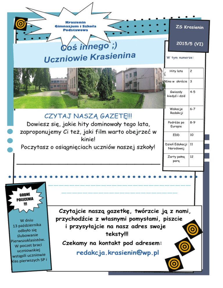Krasienin Gimnazjum i Szkoła Podstawowa Coś innego ;) nina ie s a r K ie w io n z c U ZS Krasienin 2015/5 (VI) W tym numerze: Hity lata 2 Kino w skrócie 3 CZYTAJ NASZĄ GAZETĘ!!! Dowiesz się, jakie hity dominowały tego lata, zaproponujemy Ci też, jaki film warto obejrzeć w kinie! Poczytasz o osiągnięciach uczniów naszej szkoły! ————————————————— GODNE POLECENIA !!! Gwiazdy kiedyś i dziś 4-5 Wakacje Redakcji 6-7 Podróże po Europie 8-9 EDD 10 Dzień Edukacji 11 Narodowej Żarty pełną parą 12 ——————————————————————————— —————————————————————— W dniu 13 października odbyło się ślubowanie Pierwszoklasistów. W poczet braci uczniowskiej wstąpili uczniowie klas pierwszych SP i Czytajcie naszą gazetkę, twórzcie ją z nami, przychodźcie z własnymi pomysłami, piszcie i przysyłajcie na nasz adres swoje teksty!!! Czekamy na kontakt pod adresem: [email protected] Hot 20 piosenek wakacyjnych (kolejność przypadkowa) Hot 10 piosenek wakacyjnych (kolejność przypadkowa) 1-Fifth Harmony - Worth It ft. Kid Ink 2-Selena Gomez featuring A$AP Rocky, "Good For You" 3-Omi, "Cheerleader 4-SEREBRO - Kiss 5- We Are Young ft. Janelle Monáe 6-Sarsa Markiewicz - Naucz Mnie 7-Bednarek - Sailing 8-TABB & Sound'n'Grace - Możesz Wszystko 9-Margaret - Heartbeat 10-Enej - Kamień z napisem LOVE 11-David Guetta – Hey Mama 12- Jason Derulo – Want To Want Me 13-Adam Lambert - Another Lonely Night 14-Major Lazer - Powerful (feat. Ellie Goulding & Tarrus Riley) 15-Avicii - The Nights 16-Wiz Khalifa - See You Again ft. Charlie Puth 17-Calvin Harris & Disciples - How Deep Is Your Love 18-Major Lazer & DJ Snake - Lean On (feat. MØ) 19-Avicii - Waiting For Love 20-Felix Jaehn - Ain’t Nobody (Loves Me Better) ft. Jasmine Thompson Str. 2 Coś innego ;) Kino w skrócie ;) „Praktykant” - KOMEDIA. De Niro gra w filmie Bena Whittakera, 70-letniego wdowca, który odkrył, że emerytura nie jest wcale taka wspaniała. Dlatego wykorzystuje nadarzającą się okazję, aby wrócić do aktywnego życia i zatrudnia się jako starszy stażysta w redakcji strony internetowej poświęconej modzie, założonej i prowadzonej przez Jules Ostin (Hathaway). Premiera odbyła się 02/10/2015. „Klub włóczykijów” to wielka komediowa przygoda dla całej rodziny, oparta na lekturze szkolnej Edmunda Niziurskiego, autora „Sposobu na Alcybiadesa”. W obsadzie znaleźli się Tomasz Karolak oraz Wojciech Mecwaldowski. Kornel i Maks spędzają wakacje przed ekranem komputera i nie myślą o powrocie do nudnego realu. Wszystko zmienia nagła wizyta czarnej owcy rodziny, wuja Dionizego. Nieobliczalny krewny wciąga chłopców do prawdziwego świata, pełnego nieoczekiwanych wydarzeń i niezwykłych postaci. Pod ich przewodnictwem Klub włóczykijów wyrusza w podróż, której celem jest odnalezienie skarbu ukrytego przed laty przez pradziadka Kornela. Sprawy komplikują się, gdy na drogocenny trop wpadają również przebiegli bandyci - Dr Kadryll (Karolak) i jego niezdarny pomocnik Wieńczysław Nieszczególny (Mecwaldowski). Rozpoczyna się, pełen komicznych pomyłek i zaskakujących zwrotów akcji, wyścig z czasem. Taka przygoda zdarza się raz ZS Krasienin Str. 3 Gwiazdy kiedyś i dziś... Anna Mucha Aleksandra Szwed Magda Gessler Kirsten Dunst Miley Cyrus Str. 4 Agnieszka Chylińska Coś innego ;) Ashley Tisdale i Dylan Sprouse Piotr Rubik Tom Cruise Perfekcyjna Pani Domu Rihanna ZS Krasienin Doda Str. 5 Wakacje naszej redakcji :D My uczniowie planujemy wakacje już w połowie roku szkolnego. Im bliżej do naszego upragnionego celu, tym bardziej błądzimy w chmurach. Jesteśmy zamyśleni, odlatujemy w czasie lekcji. Ciepłe czerwcowe dni przybliżają nam czas wakacji. Nareszcie 26 czerwca, a więc rozłąka ze szkołą na 2 miesiące. I już początek lipca! Podróże po naszym małym świecie rozpoczęte! Nasza redakcja również ma urlop. W tym czasie zwiedzamy Polskę i nie tylko. Podróżujemy też po wielu zakątkach Europy. Poznajemy super miejsca, takie jak: Kreta - wyspa grecka znana nam z mitologii czy słoneczne Lloret de Mar – kurort w Hiszpanii. Tego lata pogoda podczas wakacyjnych podróży nam dopisywała. Każda wyprawa integrowała nas z młodzieżą innych Redakcja Str. 6 Coś innego ;) Kreta Moje wakacje spędziłam z rodziną na pięknej wyspie greckiej - Krecie. Krajobraz wyspy tworzą skaliste wybrzeża przeplatające się z szerokimi, jasnymi plażami. Piękne widoki, wspaniałe zachody słońca, piękne góry, przejrzyste i gorące Morze Kreteńskie… Czego chcieć więcej? Chociaż były to wakacje, z chęcią budziliśmy się co rano, by nie marnować ani chwili i już od świtu cieszyć się urokami Grecji - różnorodne jedzenie, piękna plaża. Morze i baseny były doskonałą rozrywką, lecz nie zabrakło również wspaniałych wycieczek. Santorini- wulkaniczna wyspa na Morzy Egejskim. Piękne białe budynki na szczycie wulkanu, z daleka przypominające śnieg. Jezioro Kournas jest obszernym jeziorem rozlewającym się w dolinie gór, przypominającym nasze Morskie Oko. Pływanie rowerkiem w poszukiwaniu żółwi sprawia naprawdę wielką Na wyspie znajdują się dwa czynne wulkany. Jeden na powierzchni, a drugi pod wodą. Na Elafonisi znajduje się plaża z charakterystycznym różowym piaskiem, uważana za jedną z najpiękniejszych plaż Europy. Dzięki kruszeniu się koralowców powstaje różowy piasek na plaży. Przez turystów, którzy chcą zabrać z niej pamiątkę, jest tego piachu coraz mniej. Maja Machowicz DISNEYLAND Zapewne każdy z was wspomina cudownie spędzone wakacje... Chciałabym oprowadzić was po gotyckim Paryżu i słonecznej Hiszpanii, w których spędziłam ostatnie wakacje. Dwa dni w autokarze mogą człowieka wykończyć, ale wynagrodził nam to pobyt w znanym na całym świecie Disneylandzie. Opowiem wam kilka