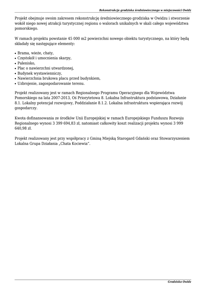 Rekonstrukcja grodziska średniowiecznego w miejscowości Owidz Projekt obejmuje swoim zakresem rekonstrukcję średniowiecznego grodziska w Owidzu i stworzenie wokół niego nowej atrakcji turystycznej regionu o walorach unikalnych w skali całego województwa pomorskiego. W ramach projektu powstanie 45 000 m2 powierzchni nowego obiektu turystycznego, na który będą składały się następujące elementy: ● ● ● ● ● ● ● Brama, wieże, chaty, Częstokół i umocnienia skarpy, Palenisko, Plac o nawierzchni utwardzonej, Budynek wystawienniczy, Nawierzchnia brukowa placu przed budynkiem, Uzbrojenie, zagospodarowanie terenu. Projekt realizowany jest w ramach Regionalnego Programu Operacyjnego dla Województwa Pomorskiego na lata 2007-2013, Oś Priorytetowa 8. Lokalna Infrastruktura podstawowa, Działanie 8.1. Lokalny potencjał rozwojowy, Poddziałanie 8.1.2. Lokalna infrastruktura wspierająca rozwój gospodarczy. Kwota dofinansowania ze środków Unii Europejskiej w ramach Europejskiego Funduszu Rozwoju Regionalnego wynosi 3 399 694,83 zł, natomiast całkowity koszt realizacji projektu wynosi 3 999 640,98 zł. Projekt realizowany jest przy współpracy z Gminą Miejską Starogard Gdański oraz Stowarzyszeniem Lokalna Grupa Działania „Chata Kociewia”. Grodzisko Owidz