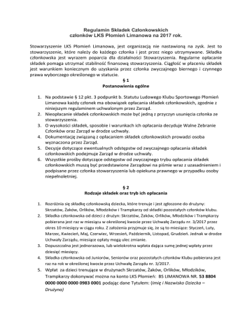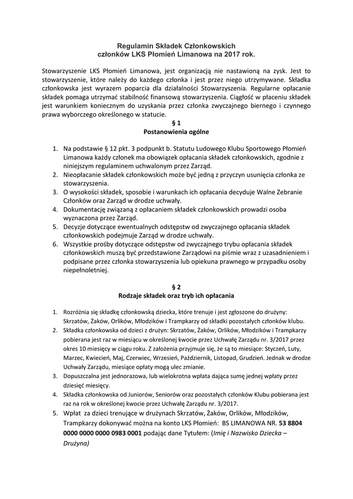Regulamin Składek Członkowskich członków LKS Płomień Limanowa na 2017 rok. Stowarzyszenie LKS Płomień Limanowa, jest organizacją nie nastawioną na zysk. Jest to stowarzyszenie, które należy do każdego członka i jest przez niego utrzymywane. Składka członkowska jest wyrazem poparcia dla działalności Stowarzyszenia. Regularne opłacanie składek pomaga utrzymać stabilność finansową stowarzyszenia. Ciągłość w płaceniu składek jest warunkiem koniecznym do uzyskania przez członka zwyczajnego biernego i czynnego prawa wyborczego określonego w statucie. §1 Postanowienia ogólne 1. Na podstawie § 12 pkt. 3 podpunkt b. Statutu Ludowego Klubu Sportowego Płomień Limanowa każdy członek ma obowiązek opłacania składek członkowskich, zgodnie z niniejszym regulaminem uchwalonym przez Zarząd. 2. Nieopłacanie składek członkowskich może być jedną z przyczyn usunięcia członka ze stowarzyszenia. 3. O wysokości składek, sposobie i warunkach ich opłacania decyduje Walne Zebranie Członków oraz Zarząd w drodze uchwały. 4. Dokumentację związaną z opłacaniem składek członkowskich prowadzi osoba wyznaczona przez Zarząd. 5. Decyzje dotyczące ewentualnych odstępstw od zwyczajnego opłacania składek członkowskich podejmuje Zarząd w drodze uchwały. 6. Wszystkie prośby dotyczące odstępstw od zwyczajnego trybu opłacania składek członkowskich muszą być przedstawione Zarządowi na piśmie wraz z uzasadnieniem i podpisane przez członka stowarzyszenia lub opiekuna prawnego w przypadku osoby niepełnoletniej. §2 Rodzaje składek oraz tryb ich opłacania 1. Rozróżnia się składkę członkowską dziecka, które trenuje i jest zgłoszone do drużyny: Skrzatów, Żaków, Orlików, Młodzików i Trampkarzy od składki pozostałych członków klubu. 2. Składka członkowska od dzieci z drużyn: Skrzatów, Żaków, Orlików, Młodzików i Trampkarzy pobierana jest raz w miesiącu w określonej kwocie przez Uchwałę Zarządu nr. 3/2017 przez okres 10 miesięcy w ciągu roku. Z założenia przyjmuje się, że są to miesiące: Styczeń, Luty, Marzec, Kwiecień, Maj, Czerwiec, Wrzesień, Październik, Listopad, Grudzień. Jednak w drodze Uchwały Zarządu, miesiące opłaty mogą ulec zmianie. 3. Dopuszczalna jest jednorazowa, lub wielokrotna wpłata dająca sumę jednej wpłaty przez dziesięć miesięcy. 4. Składka członkowska od Juniorów, Seniorów oraz pozostałych członków Klubu pobierana jest raz na rok w określonej kwocie przez Uchwałę Zarządu nr. 3/2017. 5. Wpłat za dzieci trenujące w drużynach Skrzatów, Żaków, Orlików, Młodzików, Trampkarzy dokonywać można na konto LKS Płomień: BS LIMANOWA NR. 53 8804 0000 0000 0000 0983 0001 podając dane Tytułem: (Imię i Nazwisko Dziecka – Drużyna) Do Skarbnika LKS Płomień Limanowa Zbigniewa Dudka nr. Tel. 508 134 268 Do pozostałych członków Zarządu (nr. Telefonu Prezesa 504 361 602) 6. Wpłat od zawodników z drużyn Juniorów, Seniorów i pozostałych członków klubu dokonywać można na zasadach przedstawionych w punkcie 5, z tym , że przy przelewie na konto podajemy dane, Tytułem: (Imię i Nazwisko Wpłacającego – nr. telefonu, adres zamieszkania 7. Składki od dzieci należy dokonywać najpóźniej do 25 dnia każdego miesiąca za który należy się opłata. 8. Składki od pozostałych członków klubu należy wpłacić do 25 listopada 9. Uwagi do składek od dzieci: W przypadku posiadania trzech lub więcej dzieci w klubie: dwoje płaci normalną stawkę, trzecie i kolejne dziecko bezpłatnie 10. W innych przypadkach losowych, jest możliwość odstępstw od składek członkowskich, po przedstawieniu stosownych powodów Zarządowi Klubu, który w drodze Uchwały może znieść danej osobie obowiązek wpłacania składek np. ze względu na trudną sytuację finansową lub z racji zasług na rzecz LKS Płomień Limanowa. §3 Deklaracje, status Członka Klubu 1. Każdy rodzic (opiekun prawny) otrzymuje deklaracje wpłacania składek członkowskich za dziecko oraz informację w jaki sposób można dokonywać opłaty. Deklaracja stanowi załącznik do regulaminu. Opłacenie składki rocznej za zawodnika/zawodniczkę przez rodzica (opiekuna) oznacza, iż dane dziecko staje się członkiem klubu i otrzymuje legitymację członkowską LKS Płomień. 2. Każdy członek klubu, który opłaci jednorazową składkę roczną i podpisze deklarację członkowską otrzyma legitymacje członkowską i staje się Członkiem Zwyczajnym Klubu. Deklaracja stanowi załącznik do regulaminu. §4 Zaleganie z opłatami składek, skreślenie z listy członków 1. Nieopłacenie składki członkowskiej w terminie powoduje utratę prawa do udziału we wszelkich zajęciach organizowanych przez LKS Płomień Limanowa 2. Członek zalegający z wpłatą składki otrzymuje ponaglenie przypominające o konieczności wpłaty drogą mailową lub telefoniczną lub w inny sposób. 3. Jeżeli członek LKS Płomień Limanowa nie dokona należnej wpłaty w terminie określonym w ponagleniu, Zarząd może podjąć decyzję w formie uchwały o skreśleniu go z listy członków stowarzyszenia. Członek usunięty z powodu nieopłacania składek może starać się o ponowne przyjęcie do LKS Płomień. Warunkiem ponownego przyjęcia jest wypełnienie deklaracji, oraz wpłata składki. Załączniki: Deklaracja wpłaty Składki Członkowskiej - darowizny Deklaracja Członkowska Deklaracja wpłaty darowizny na klub LKS Płomień Limanowa …………………………………………………………………………………………………………………………………………… Imię i Nazwisko rodzica (opiekuna prawnego) – adres zamieszkania - numer Telefonu …………………………………………………………………………………………………………………………………………… Imię (Imiona) i nazwisko dziecka (dzieci) Deklaruję wpłatę darowizny w ramach